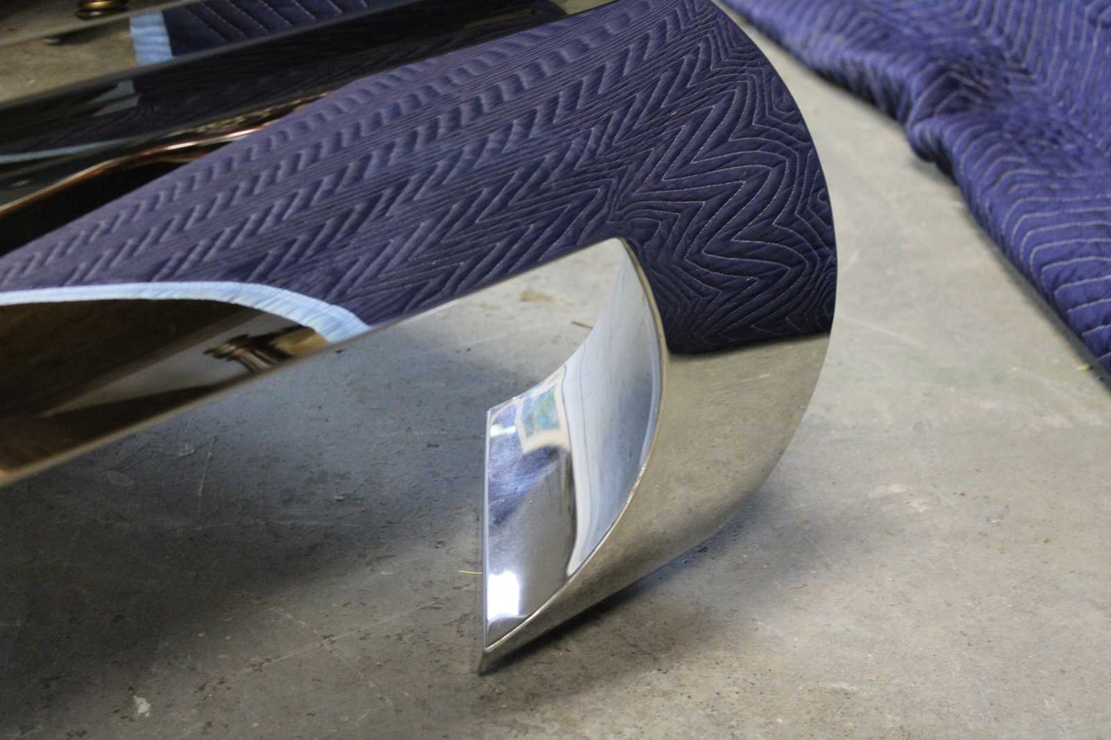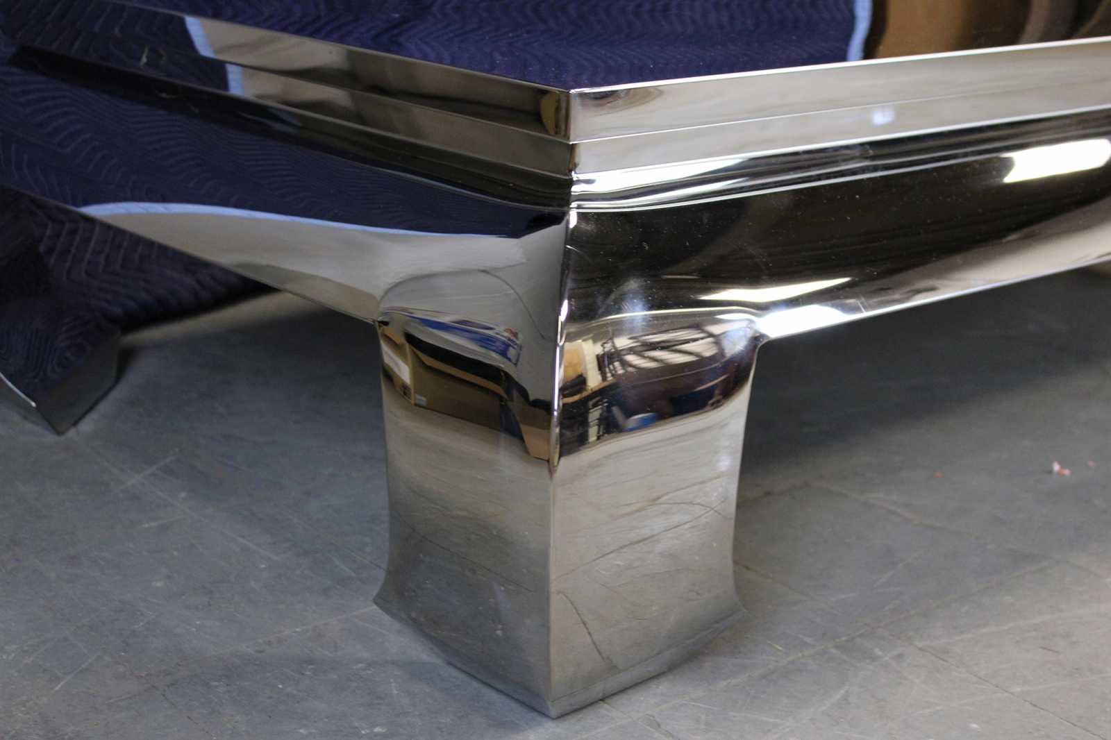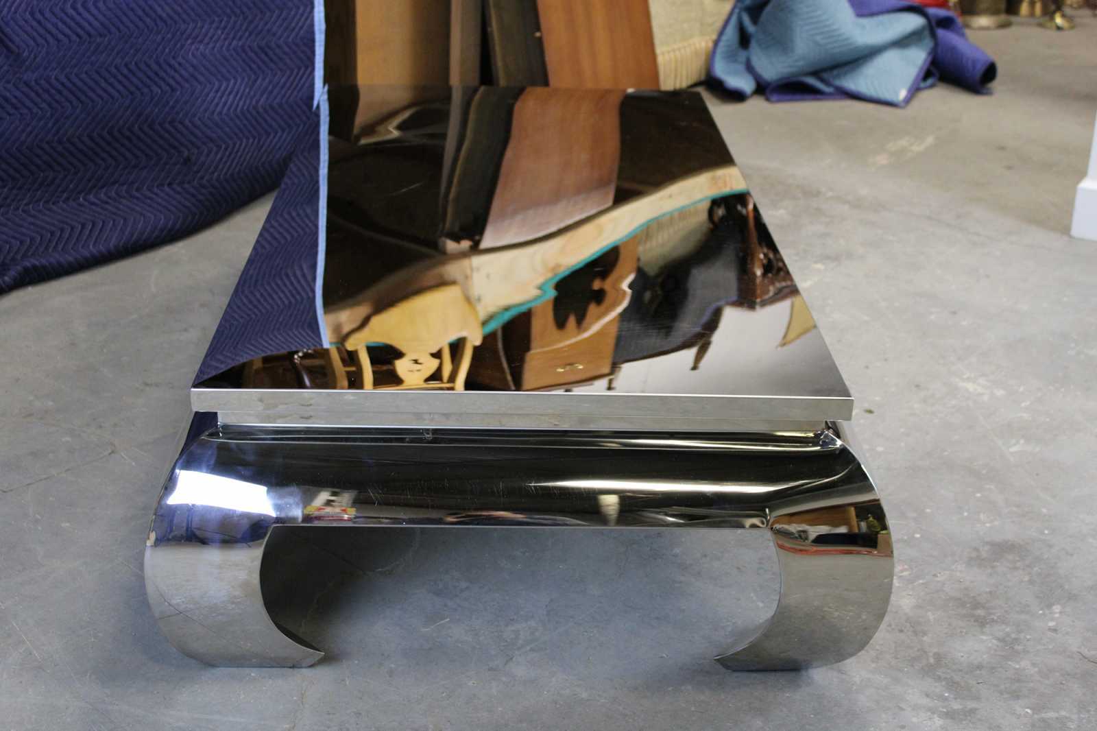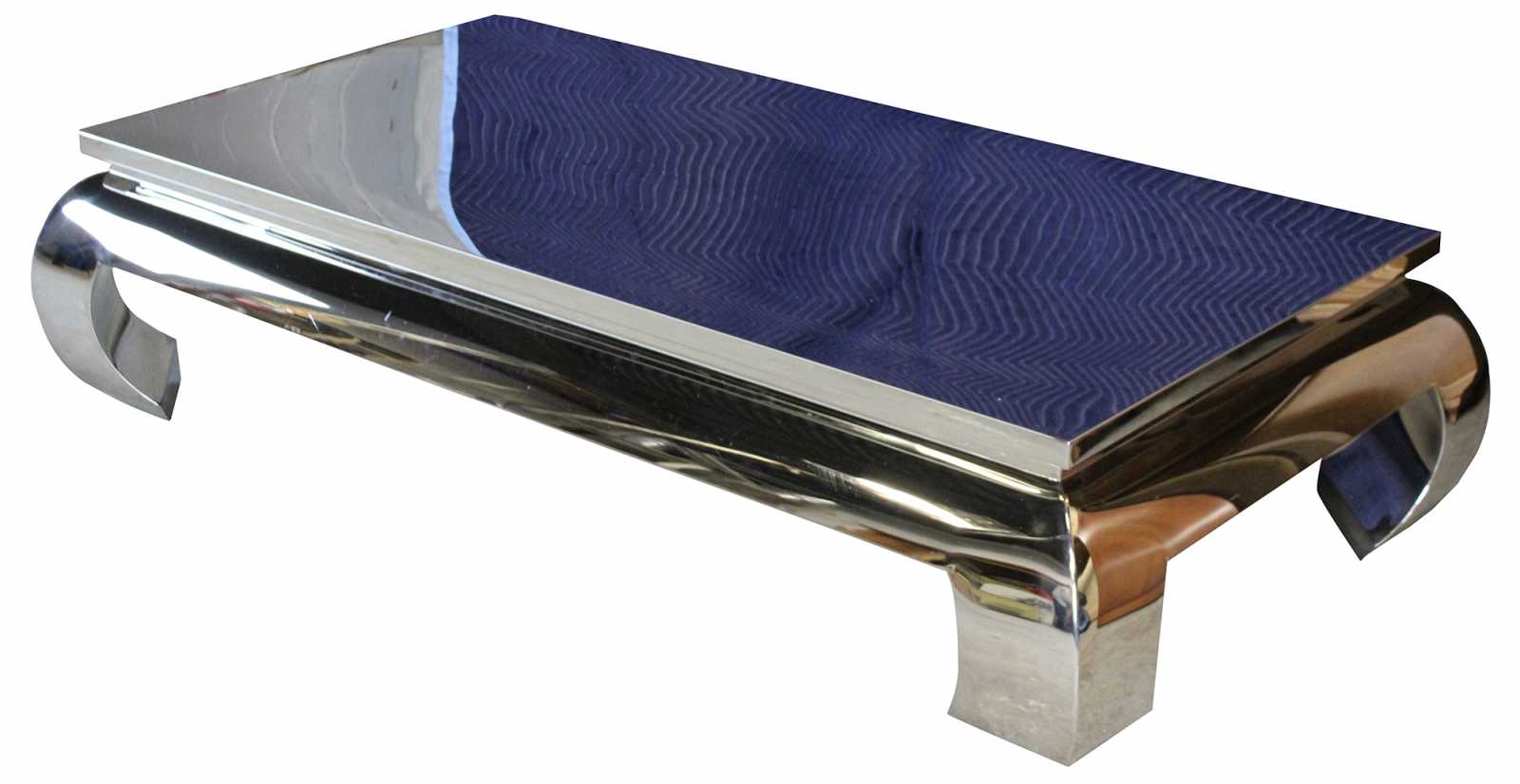 Ming inspired large rectangular coffee table. An eye-catching centrepiece for any living area. Subtle exotic and oriental design with striking stainless steel and opulent mirror finish.