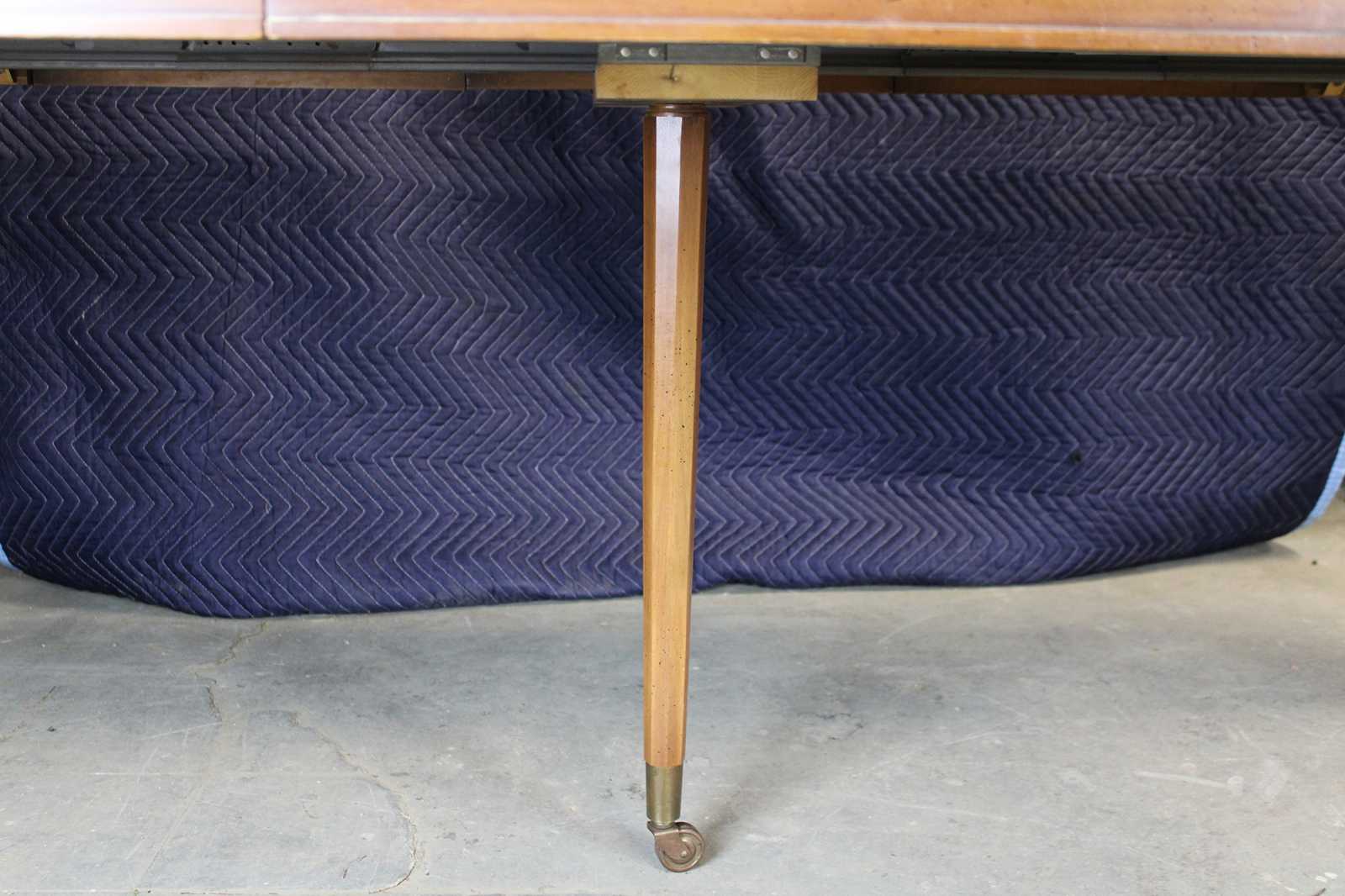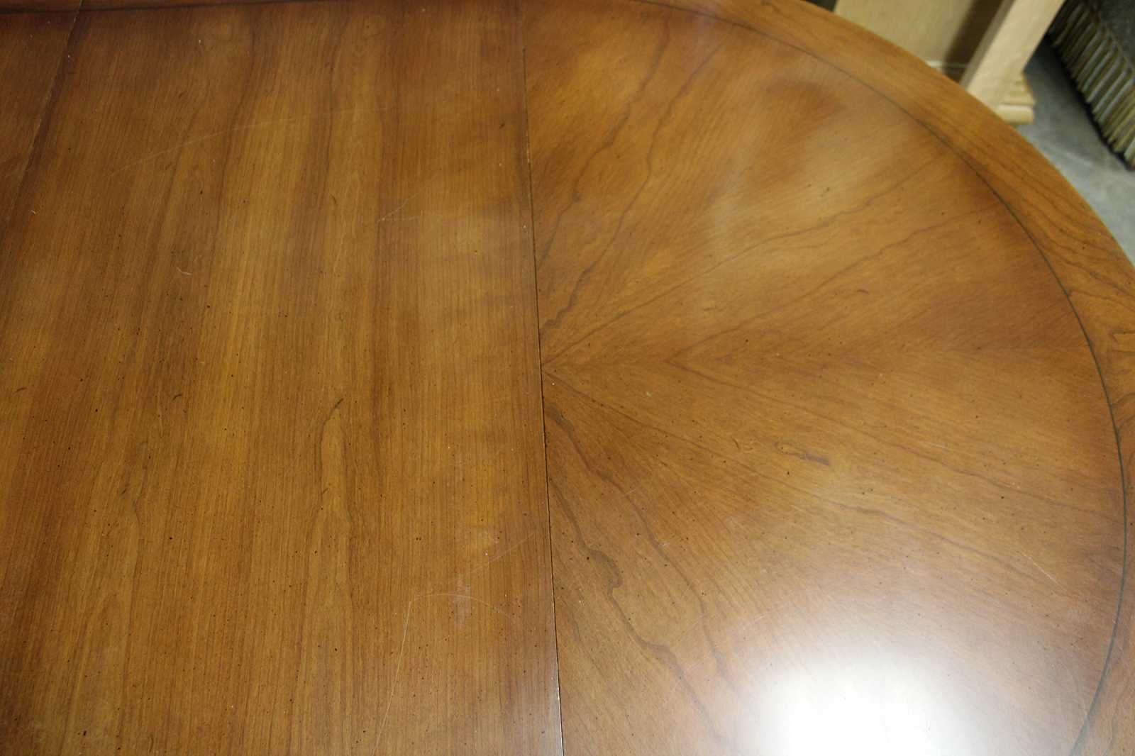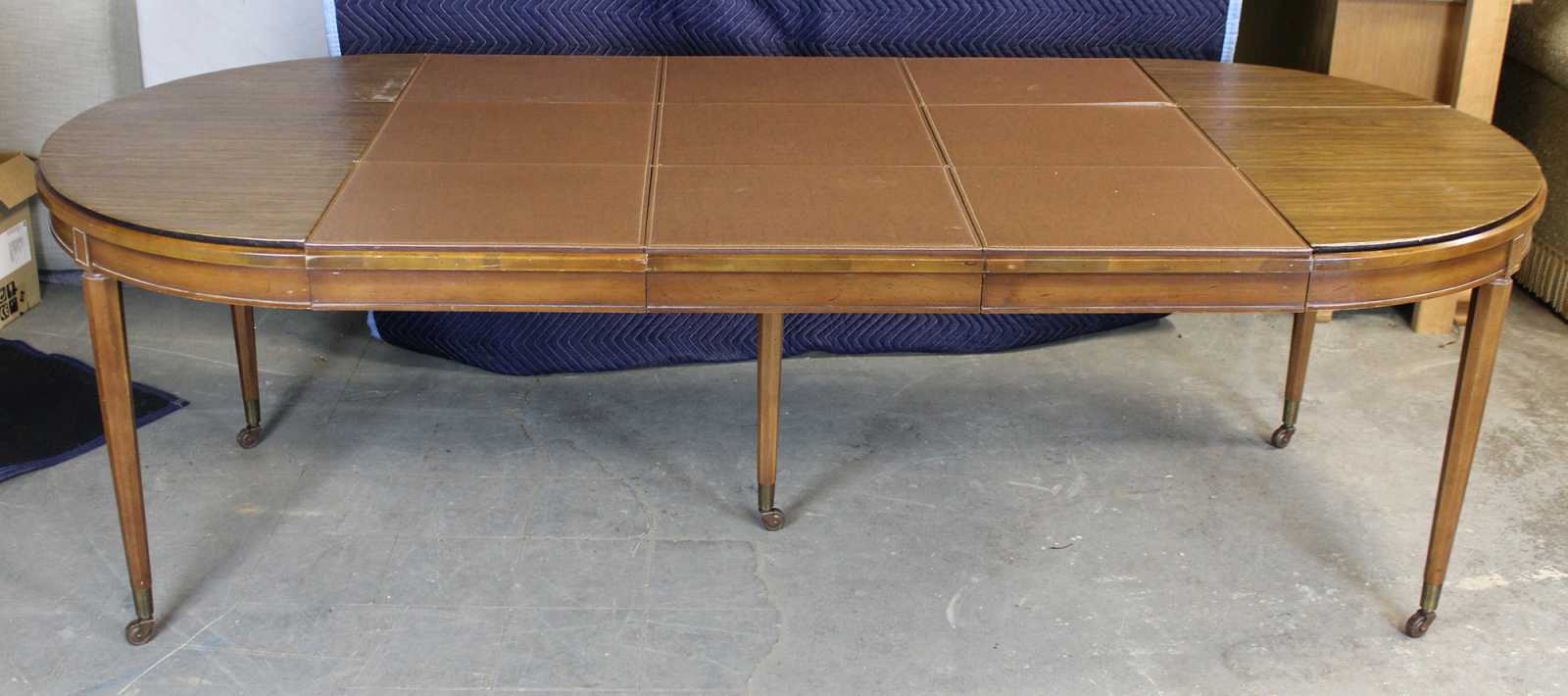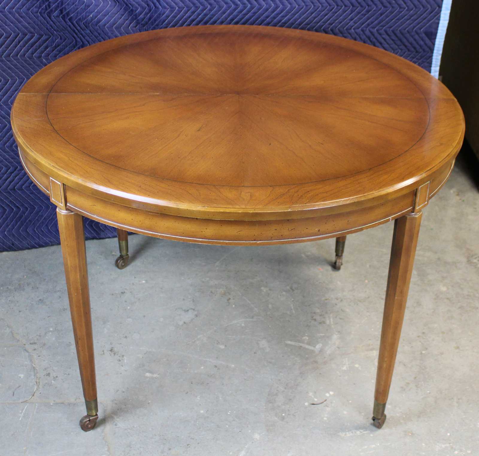 Italian Provincial dining table by Union National of Jamestown New York, circa 1950s. A round extendable table made from fruitwood with parma finish. Features octagonal tapered legs leading to casters.