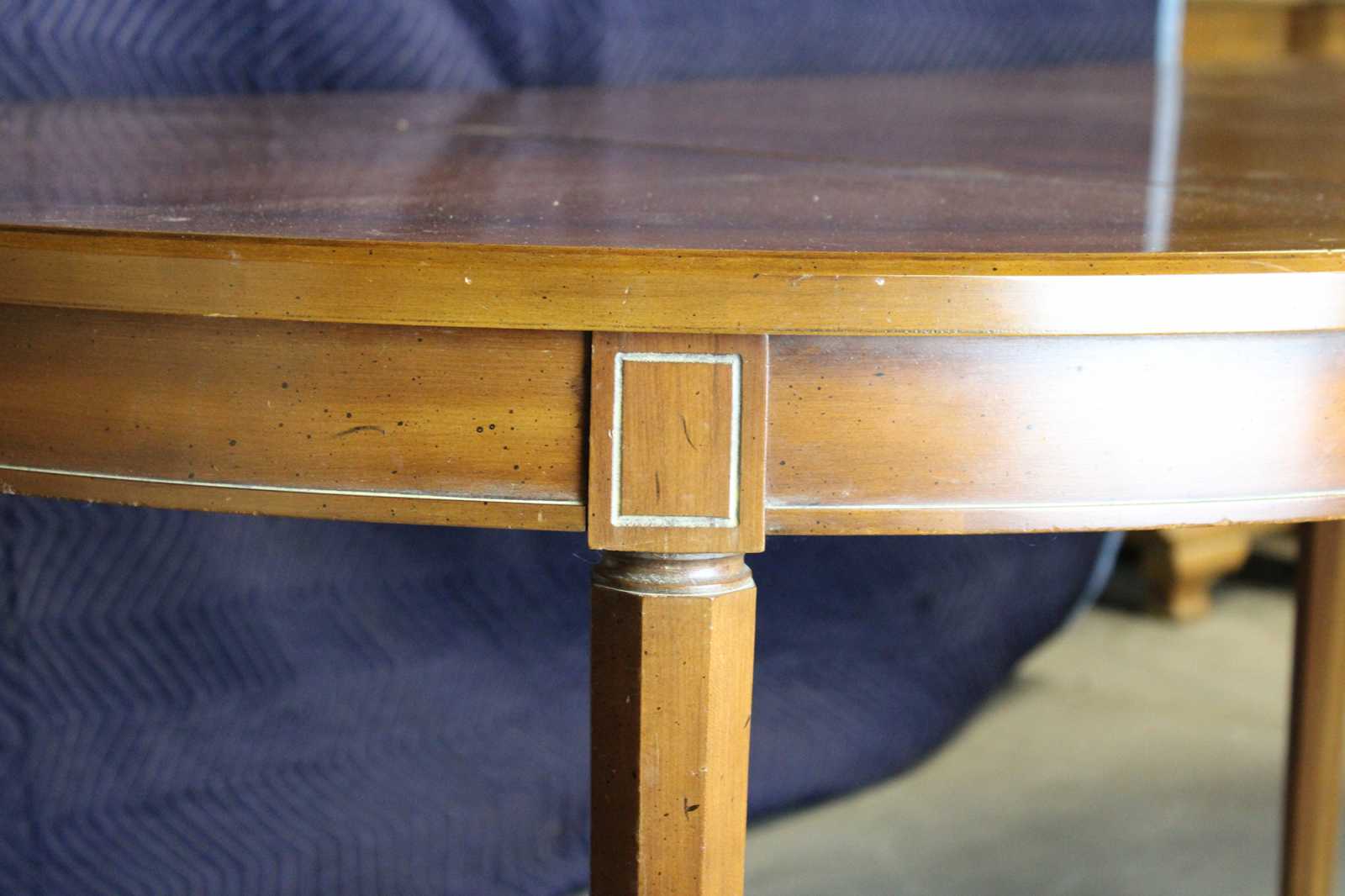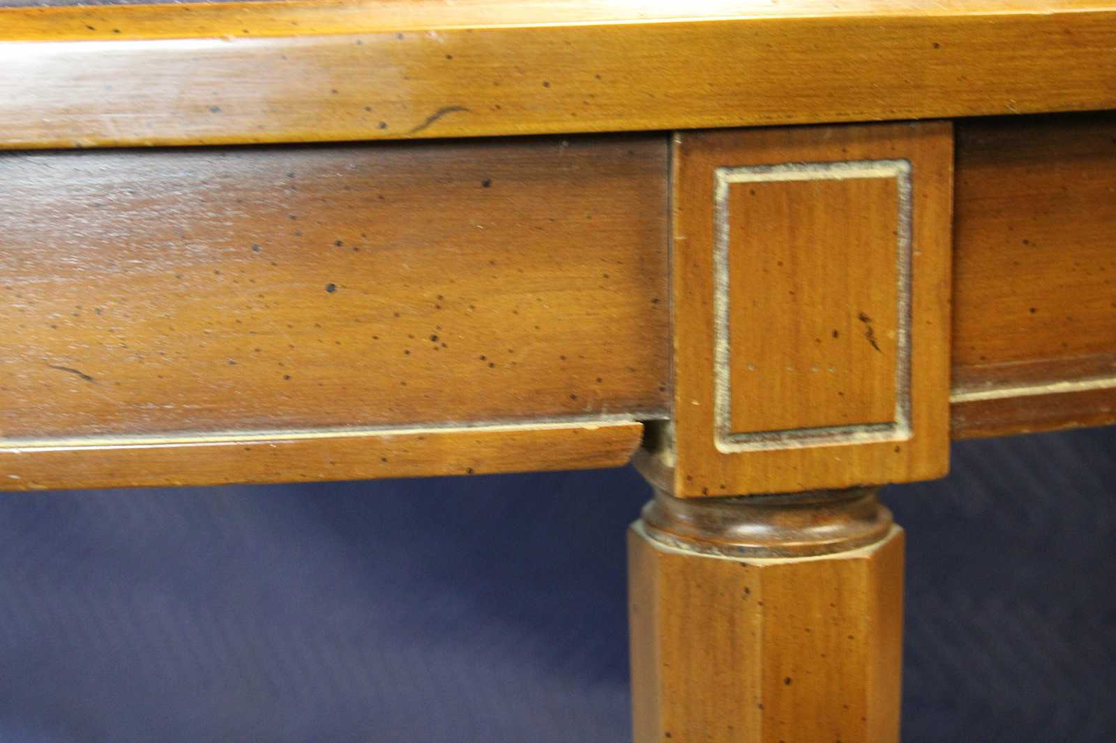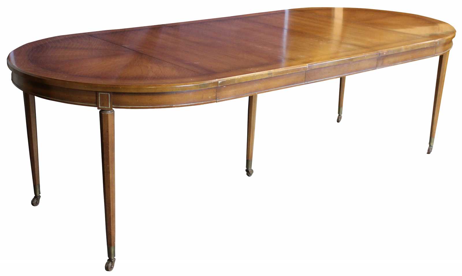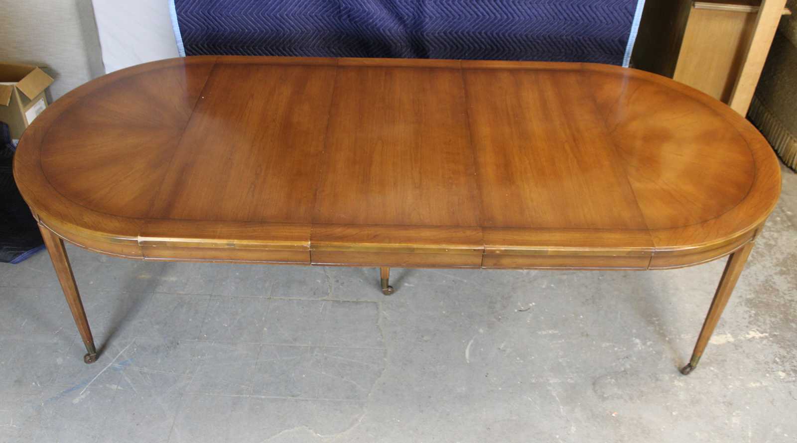 Italian Provincial dining table by Union National of Jamestown New York, circa 1950s. A round extendable table made from fruitwood with parma finish. Features octagonal tapered legs leading to casters.