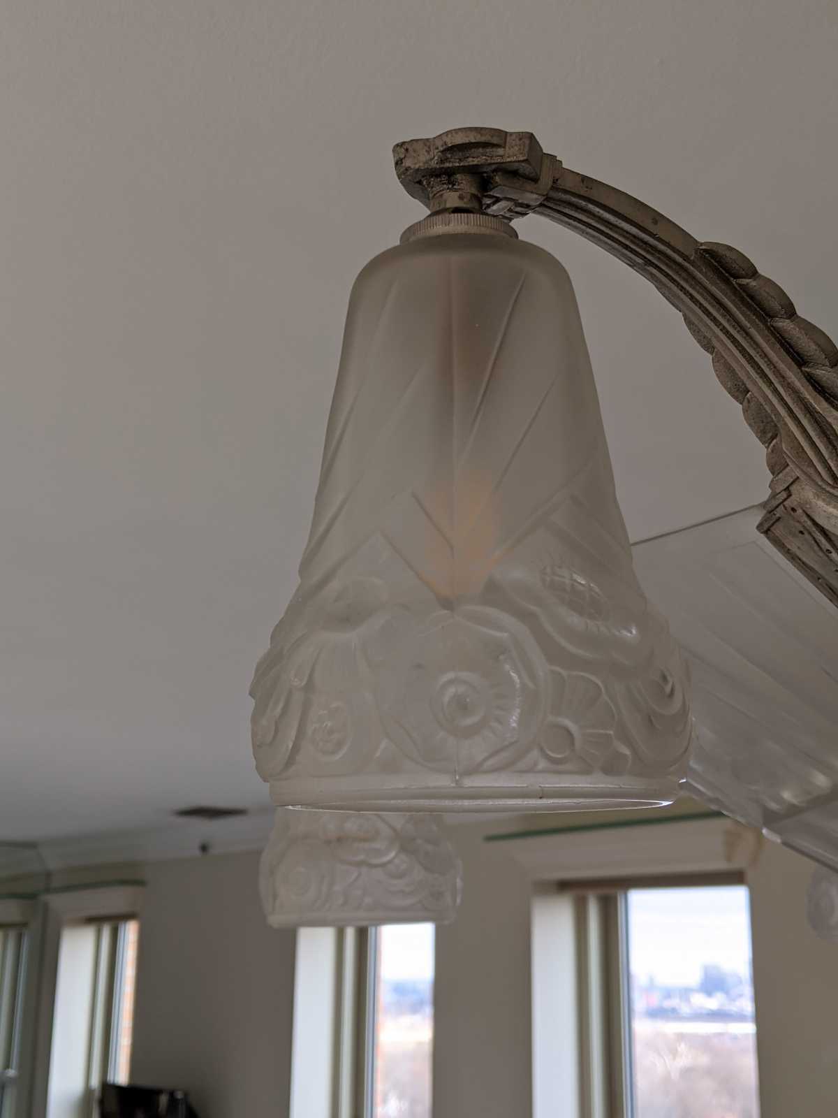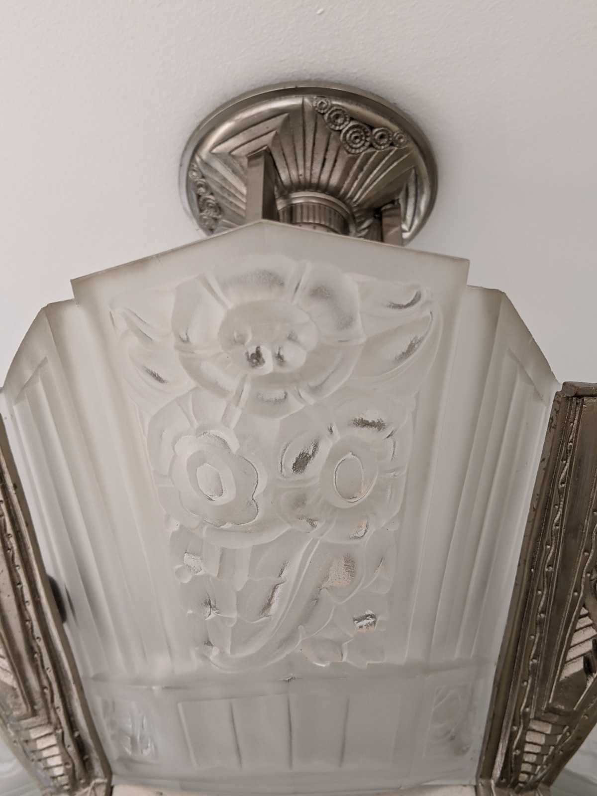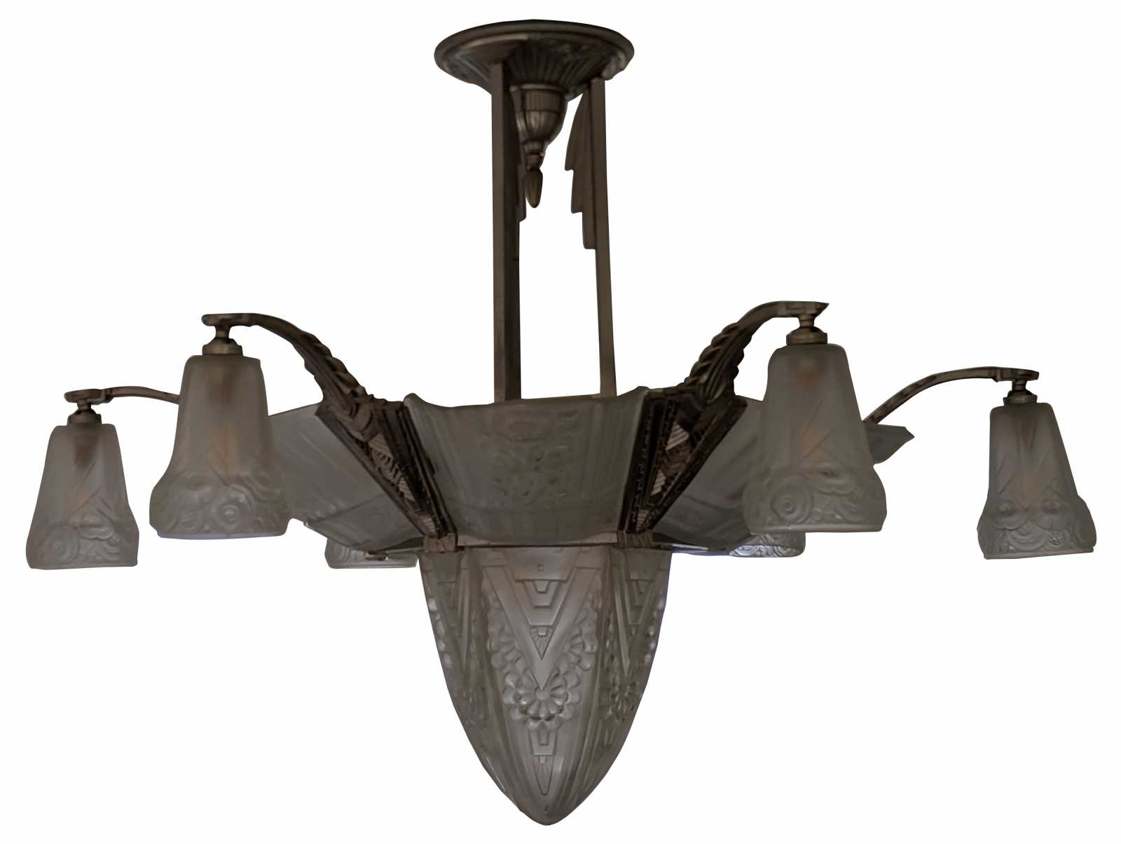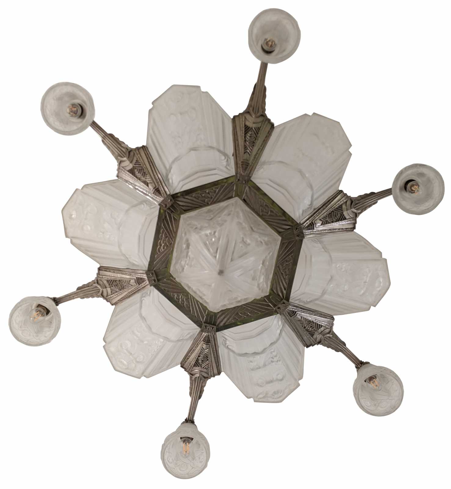 French Art Deco chandelier by Société d'Exploitation des Verreries de Bagneaux, 7 rue de Surène, Paris, France, 1920s. Nickel plated with thick molded glass slip shades and ornate central cone. (S.E.V.B)