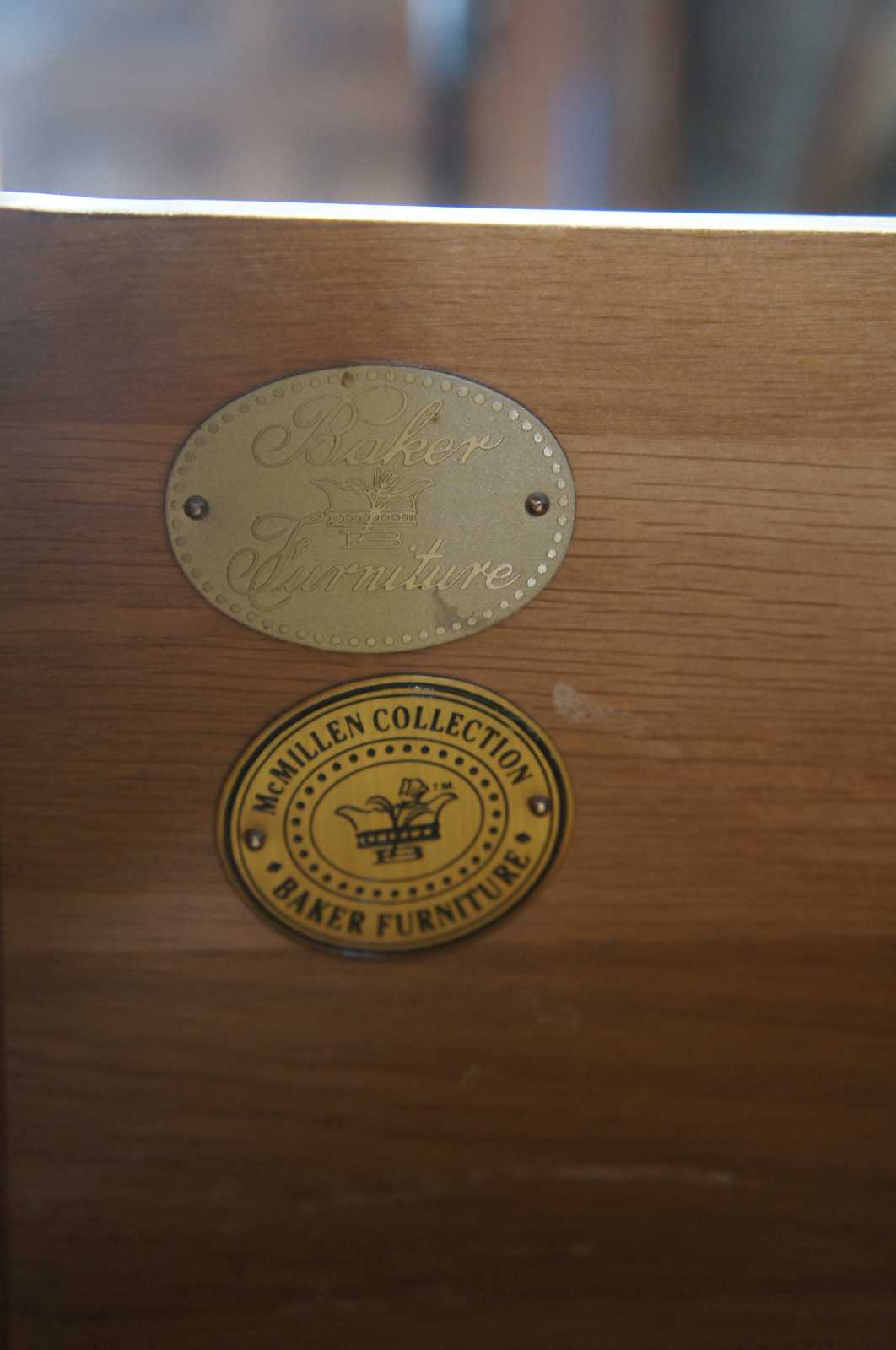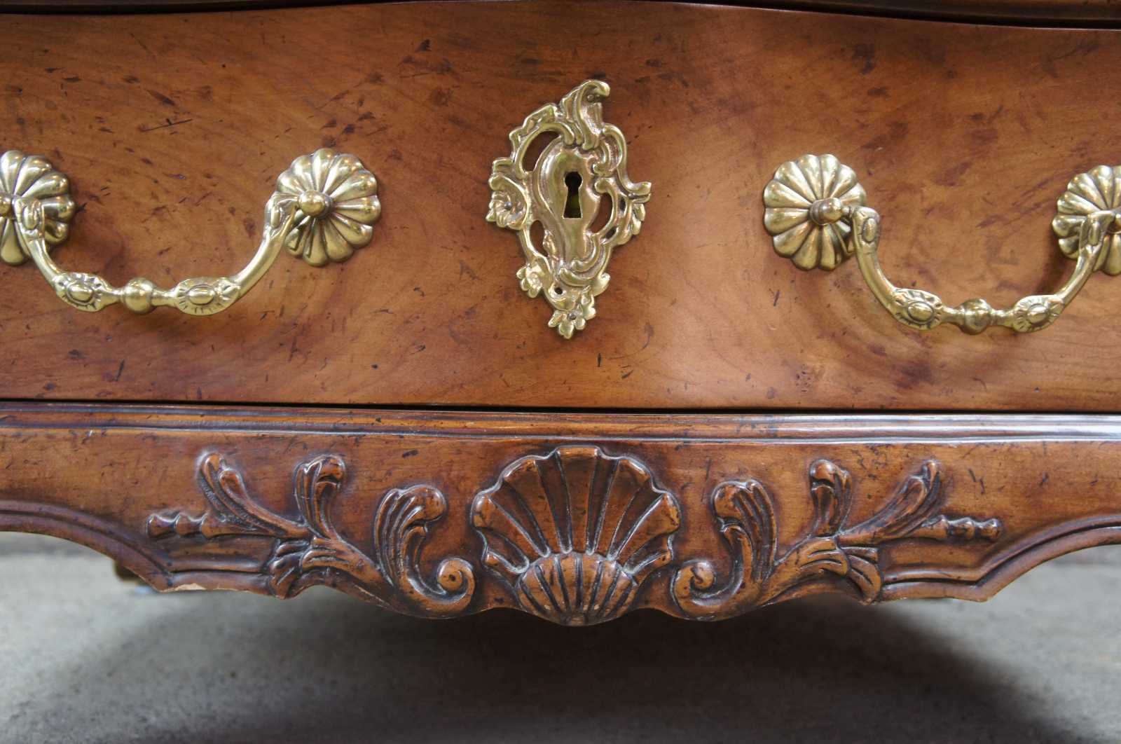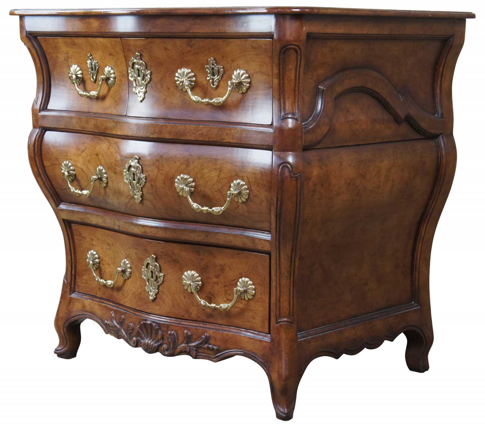 Baker Furniture McMillan Collection Bombe Chest. Inspired by classic Louis XV & French Provincial styling, Naturally distressed shaped walnut with a serpentine top. Features four drawers with brass mounts and faux keyholes, cabriole legs and a lower scalloped apron.