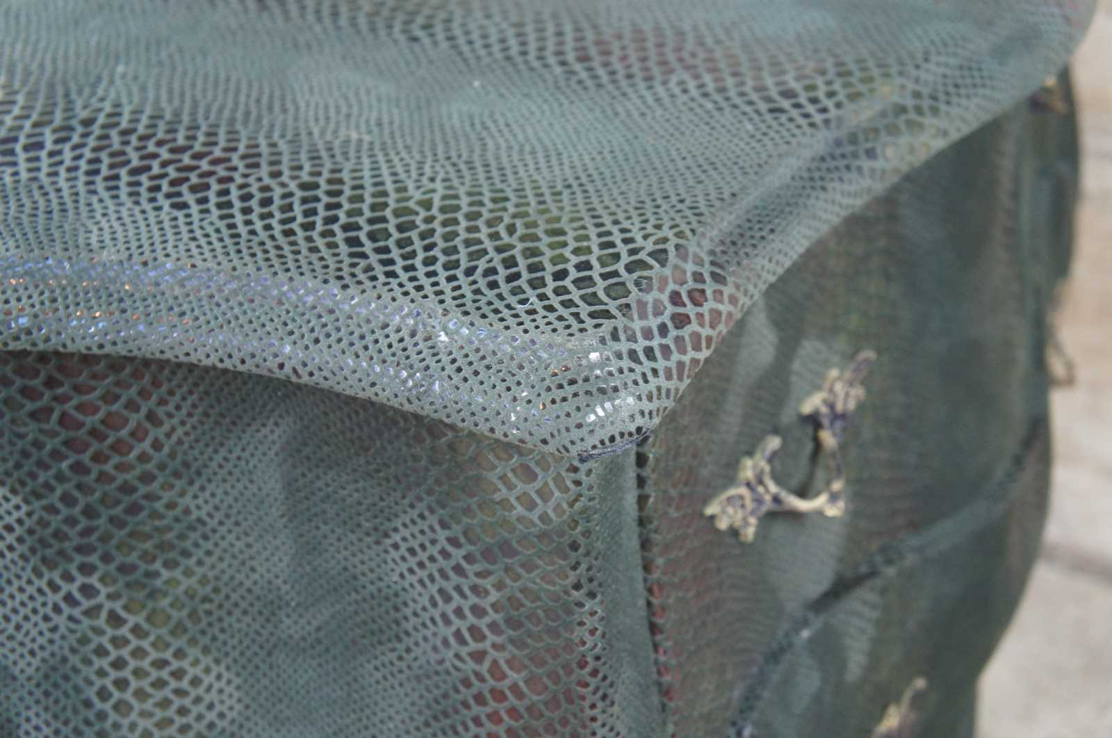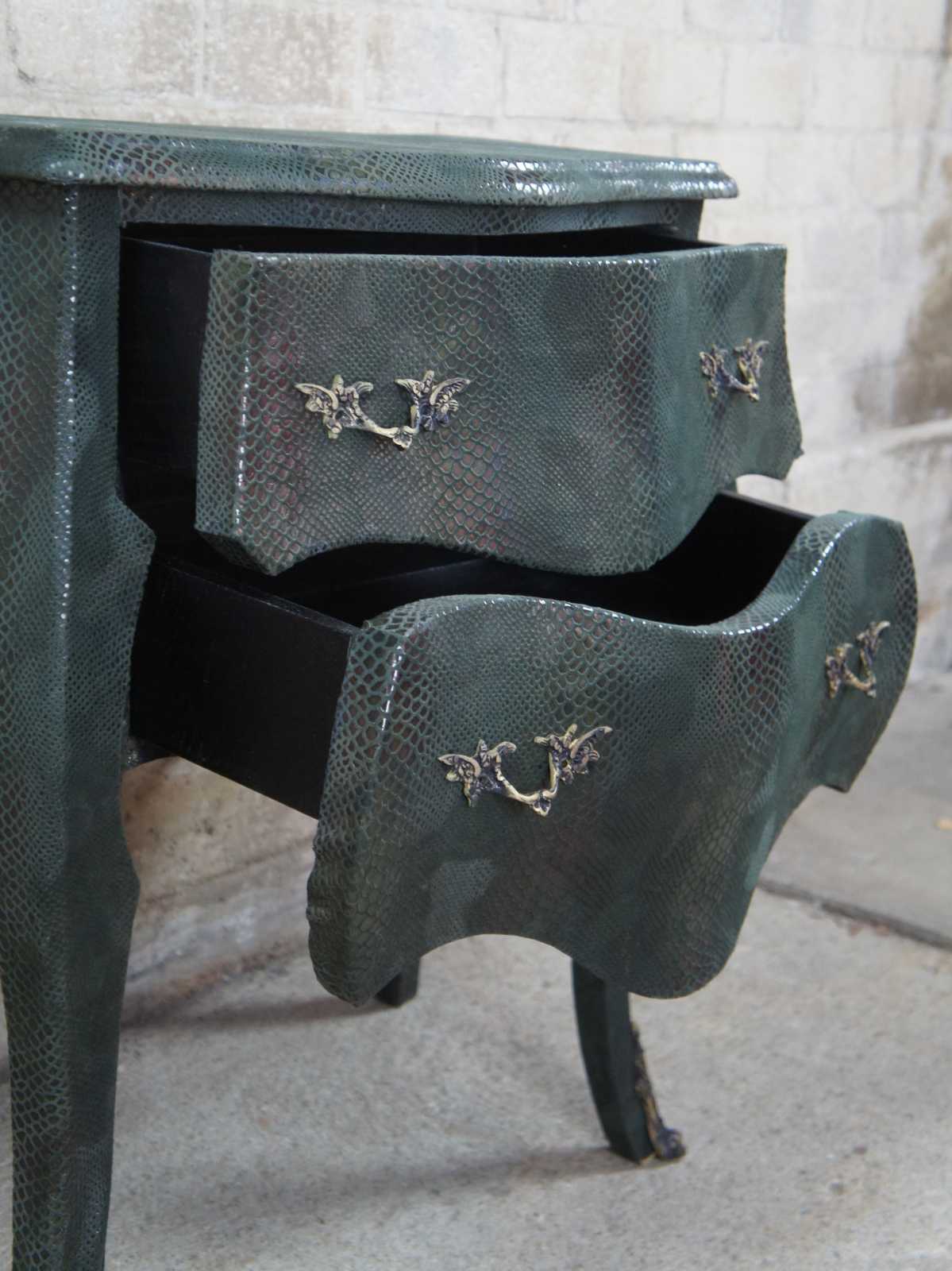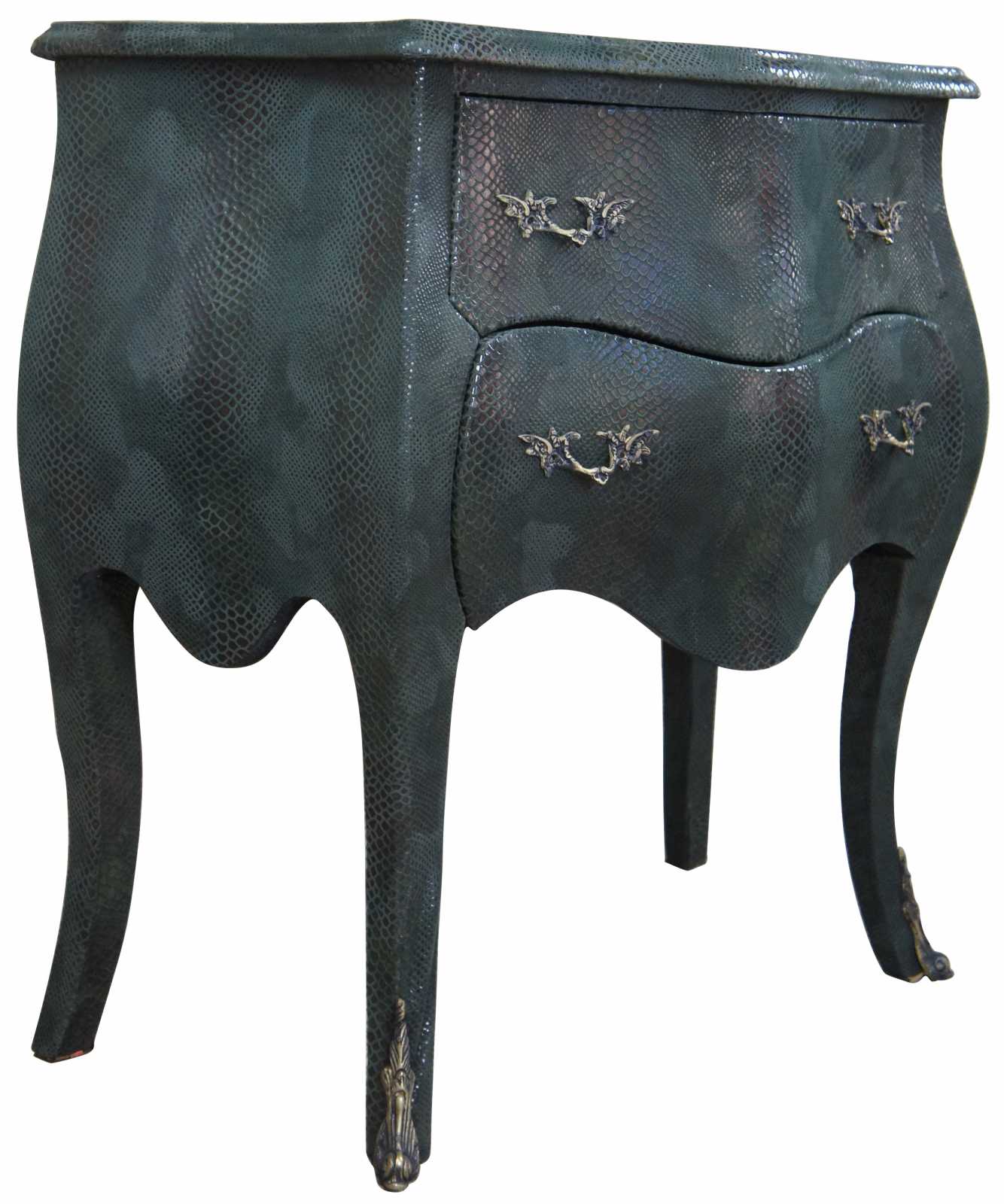 Pair of two vintage French bombe style commodes, nightstands or entry consoles. Made from wood and wrapped in a faux suede snake skin camouflage fabric. Features two upper drawers and serpentine shape.