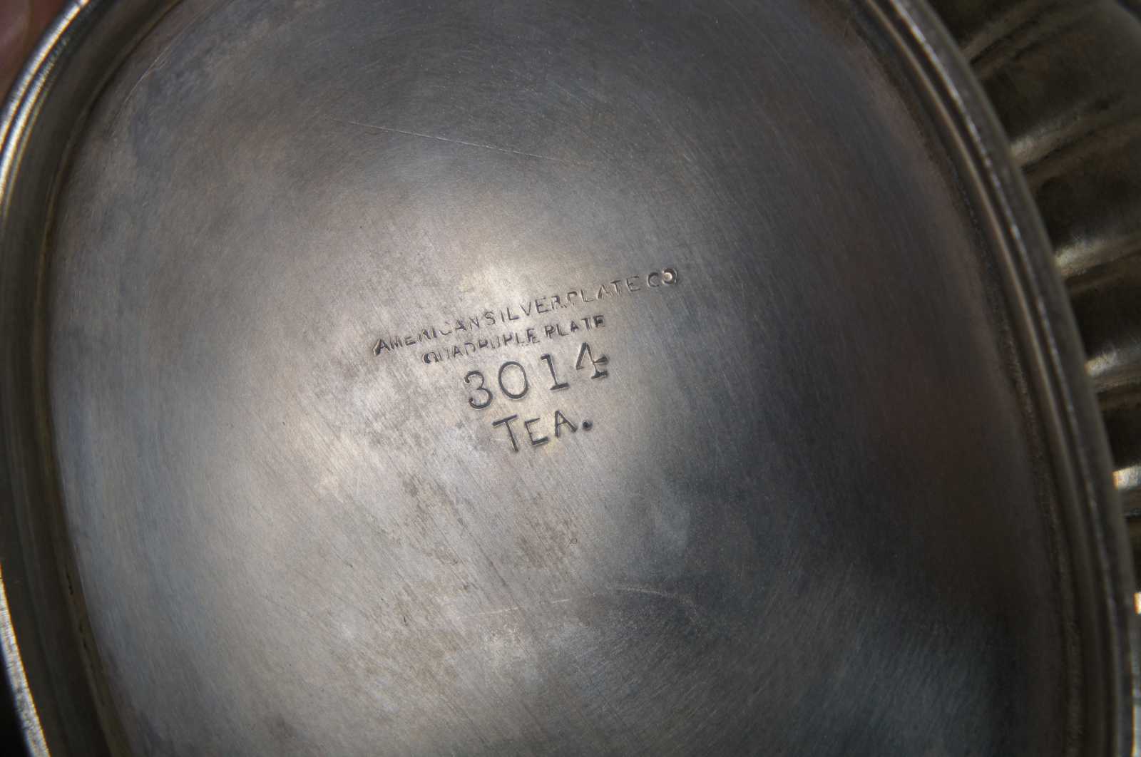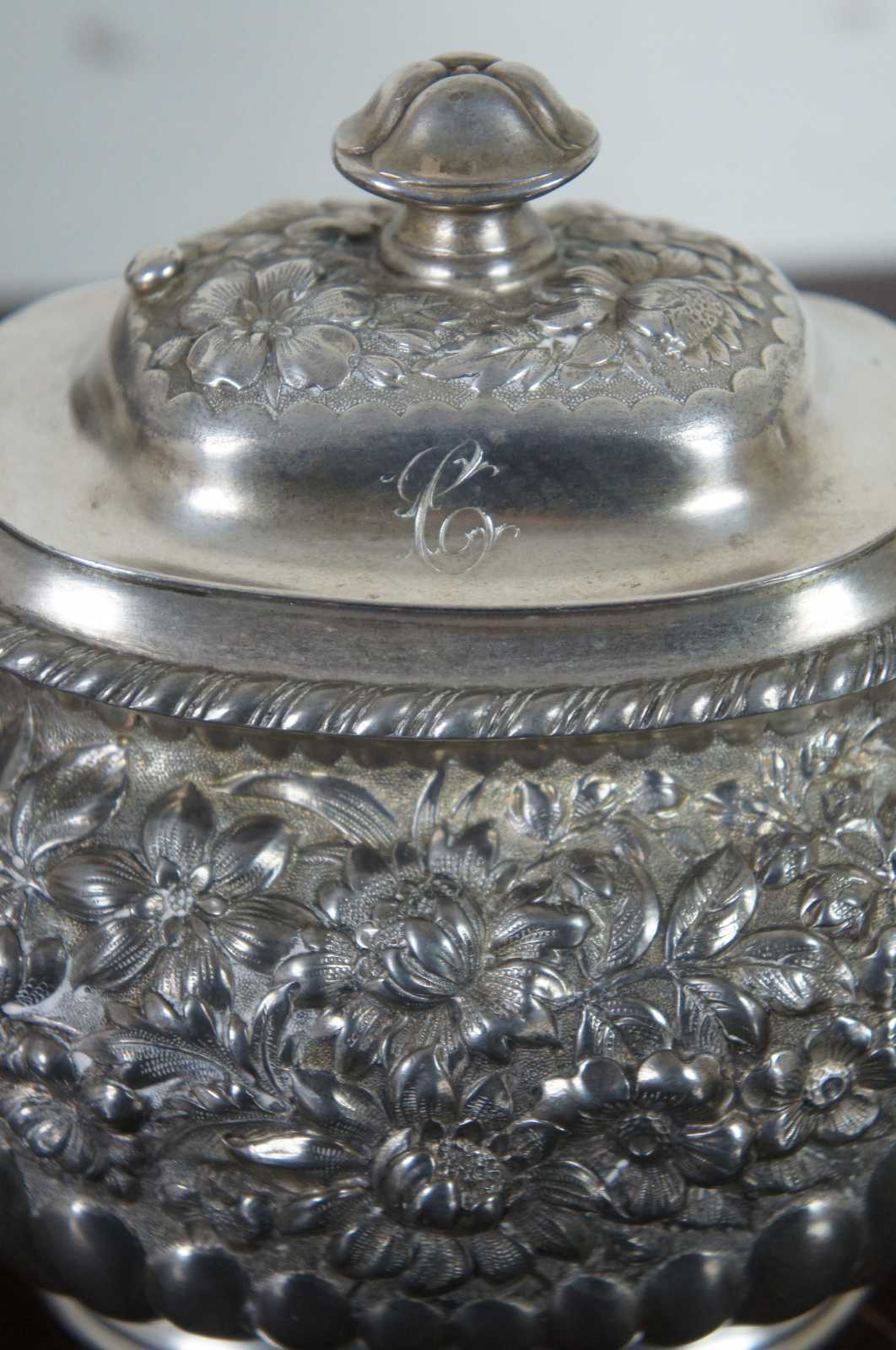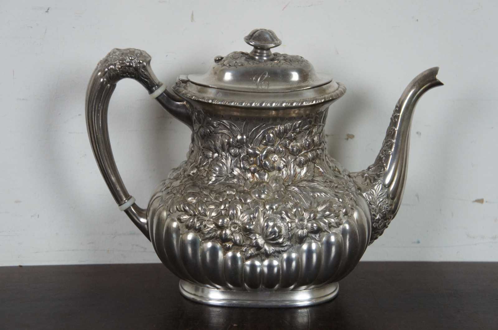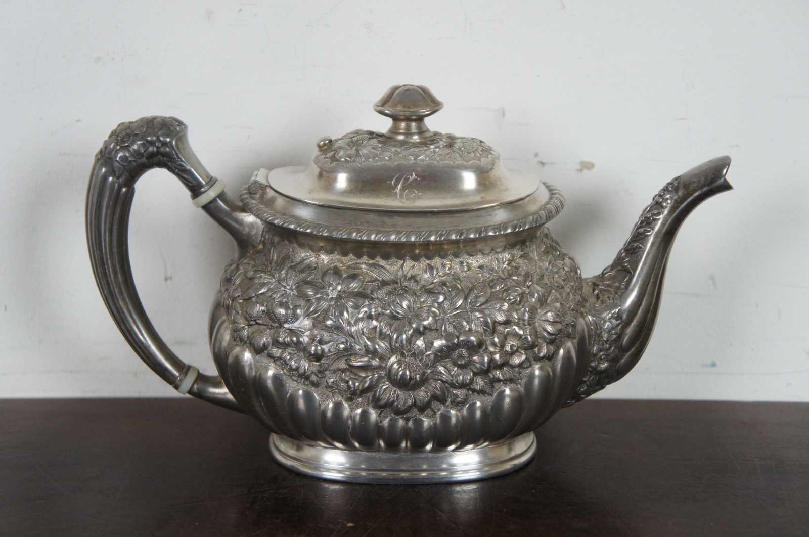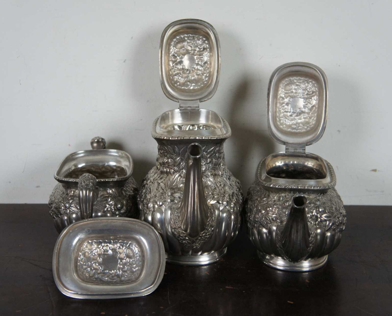 Five piece tea and coffee quadruple plate serving set by American Silver Plate Co, 3014, with a high relief repousse floral design. Made during the Aesthetic movement towards the last part of the Victorian era.