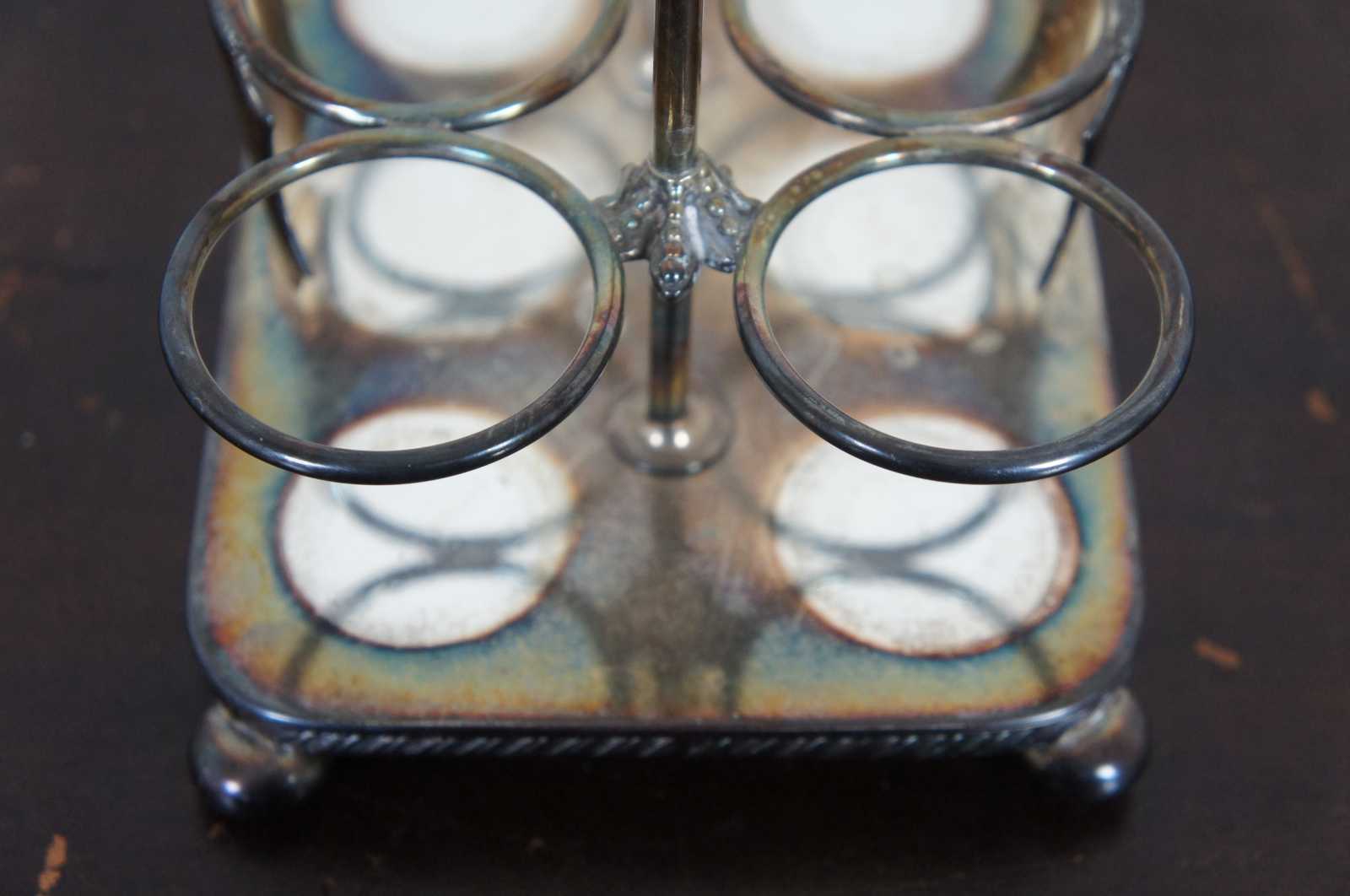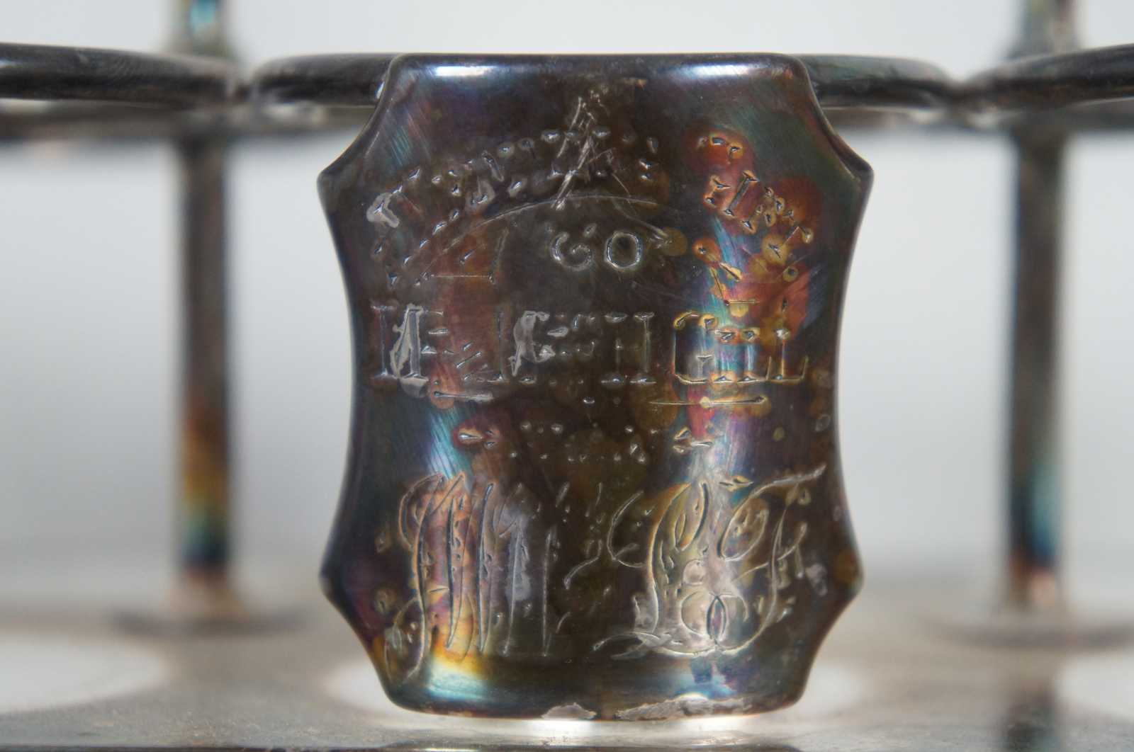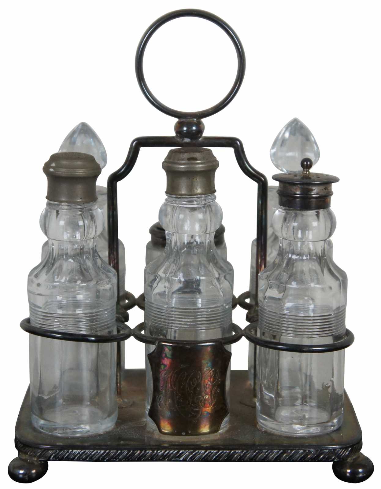 Victorian silver plate cruet set and caddy, engraved as a wedding gift for the original owner. Includes six condiment bottles and shakers.