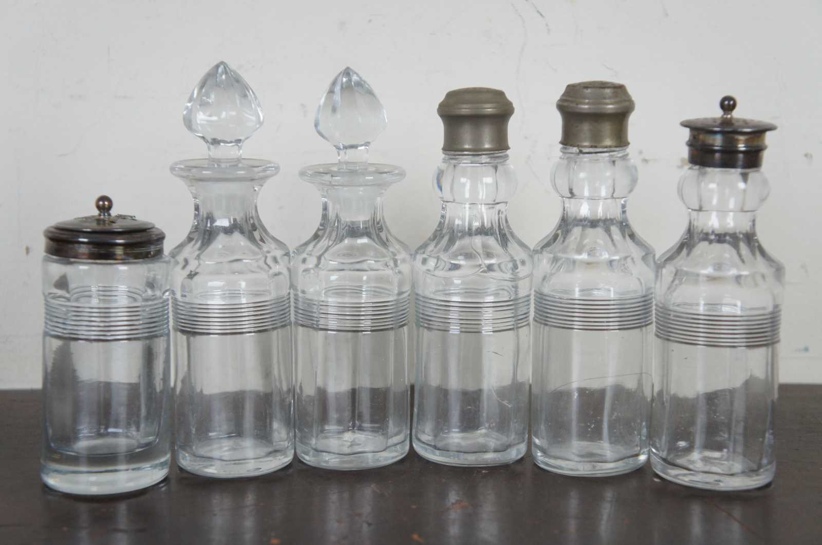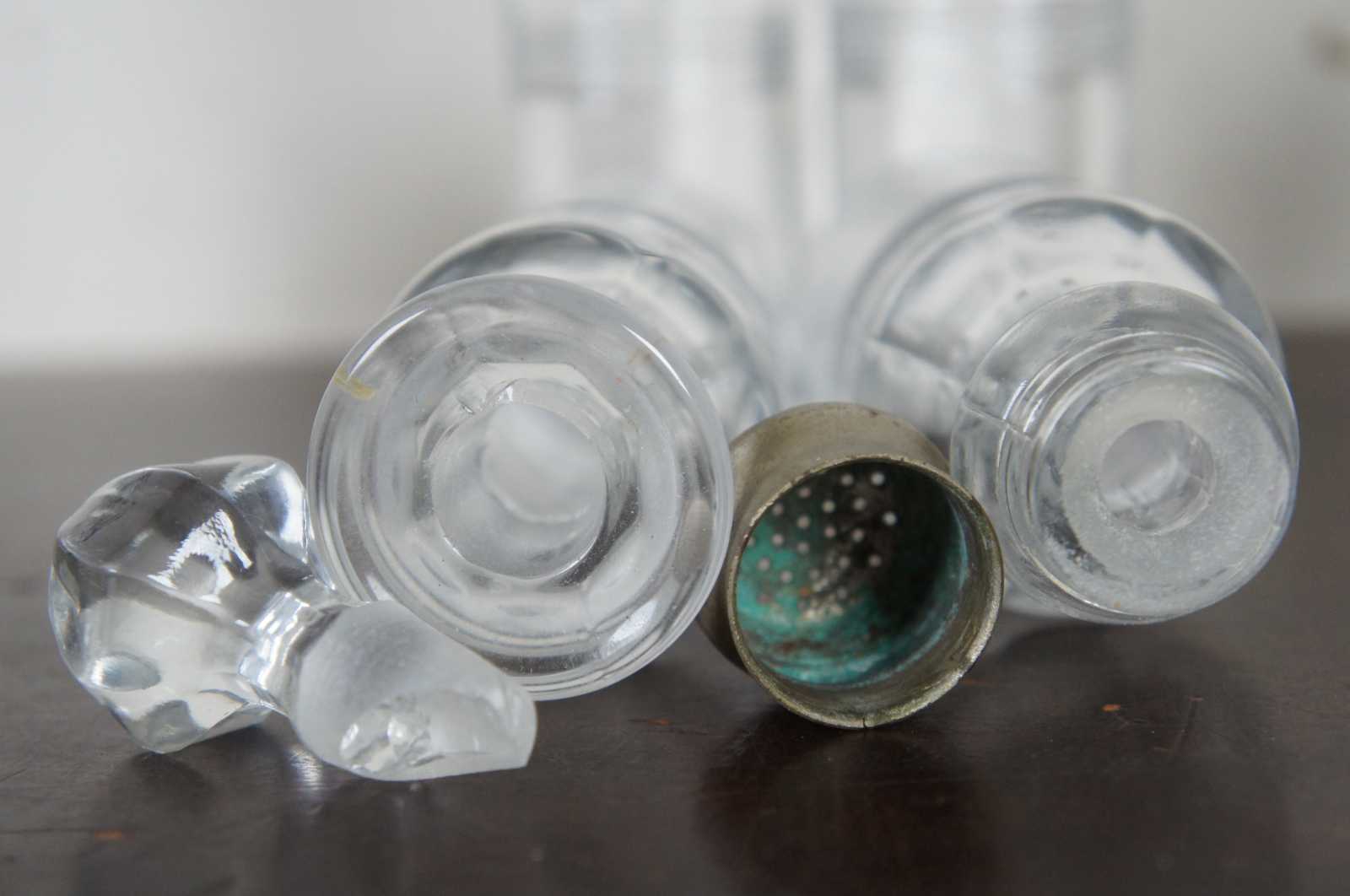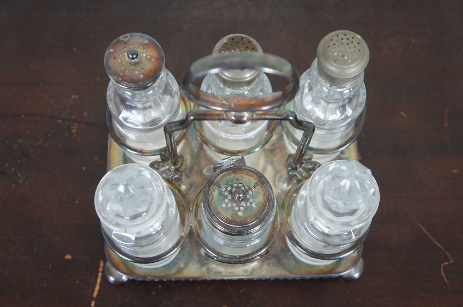 Good Overall - Tarnish throughout; chips around opening of several bottles; one stopper base chipped; smaller shaker hinged lid broken; see pictures