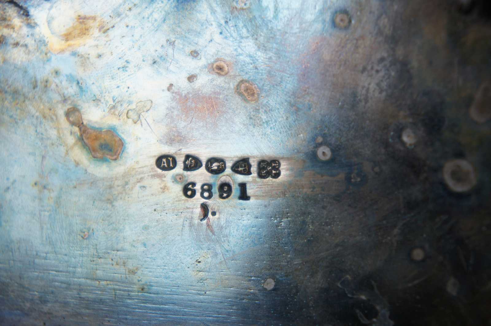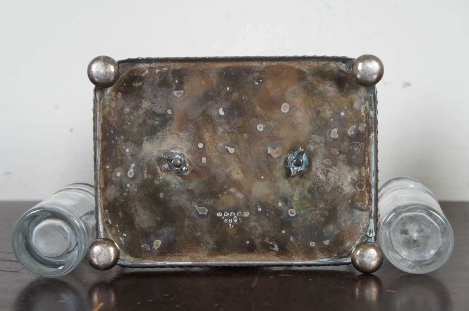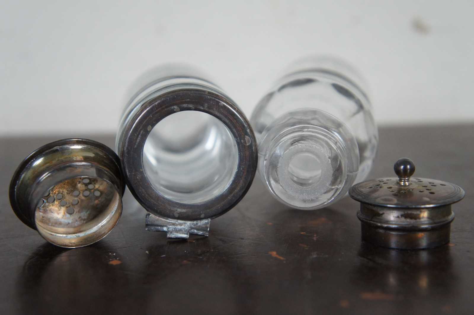 Good Overall - Tarnish throughout; chips around opening of several bottles; one stopper base chipped; smaller shaker hinged lid broken; see pictures