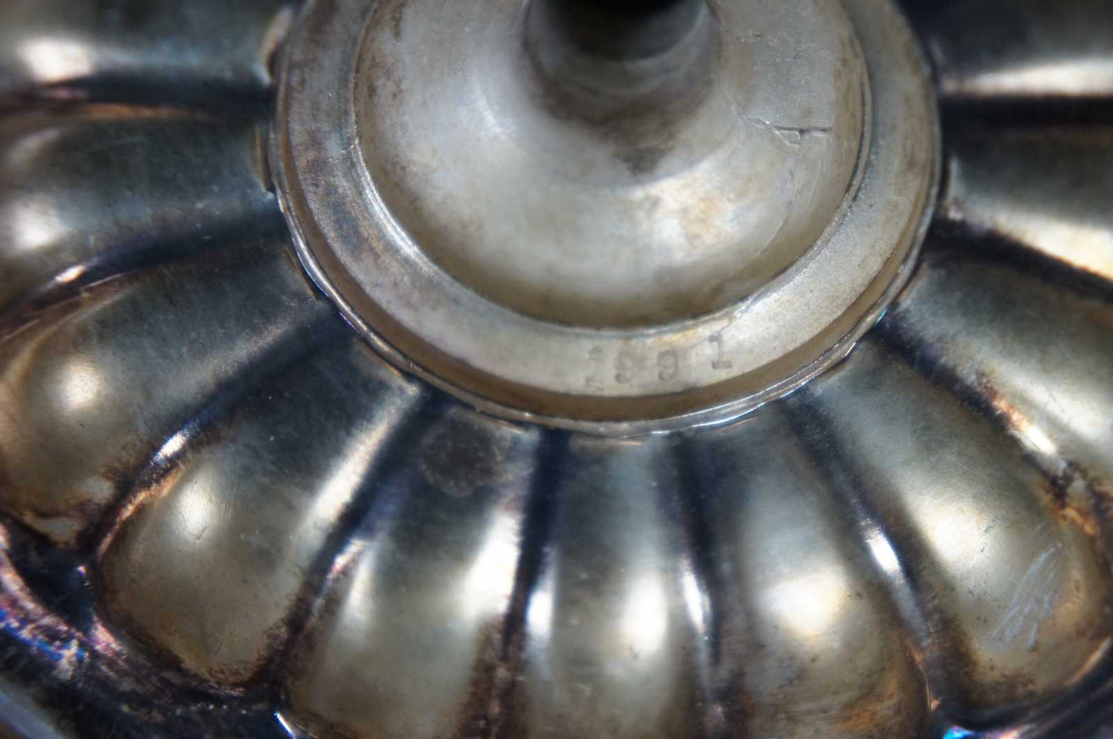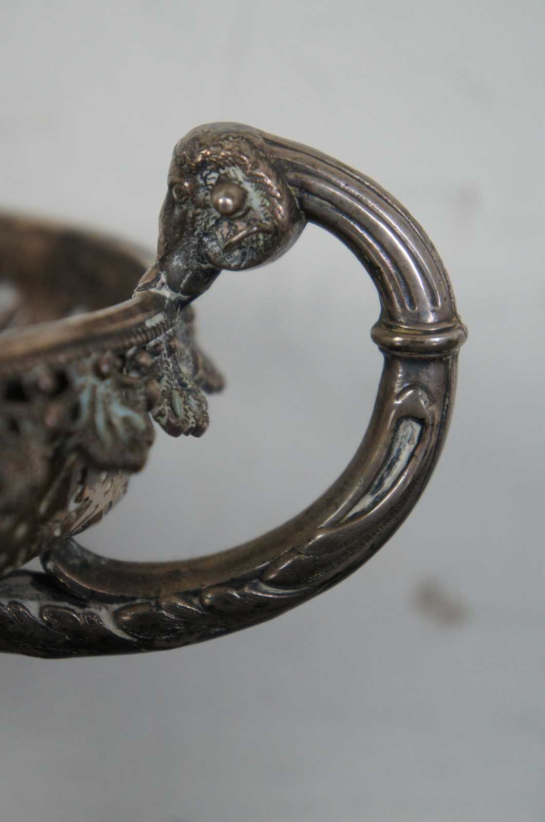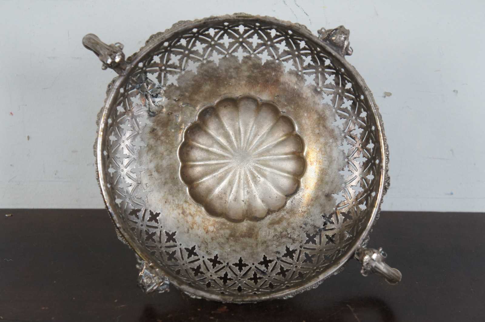 Antique Reed and Barton silver plated bride’s basket or footed compote with reticulated sides, two handles, and ram’s head accents.