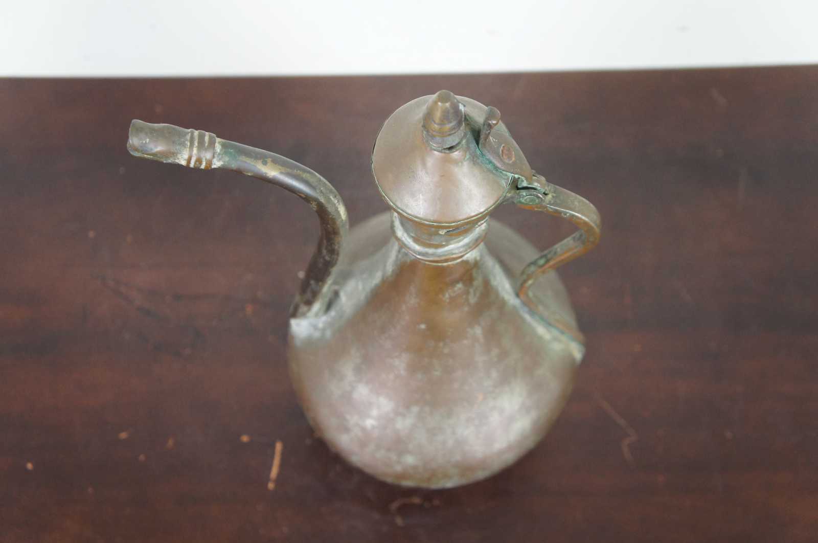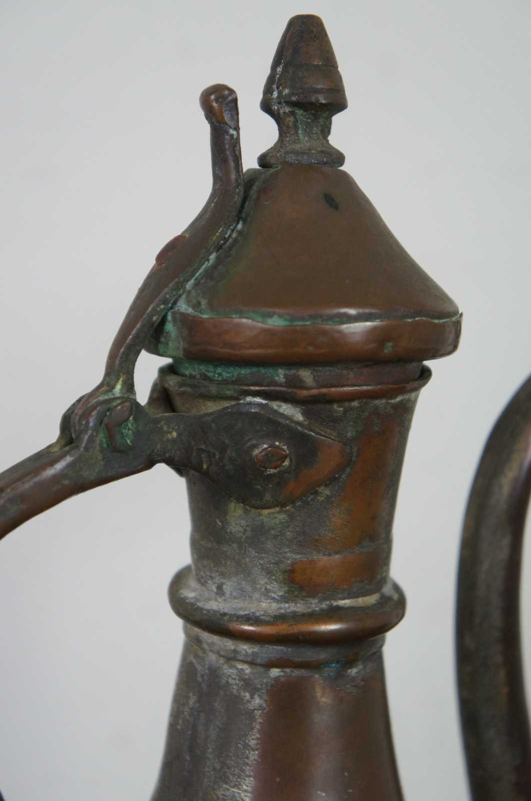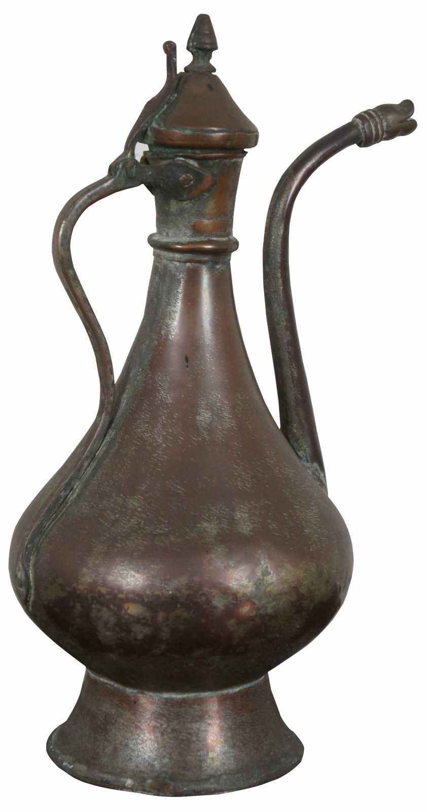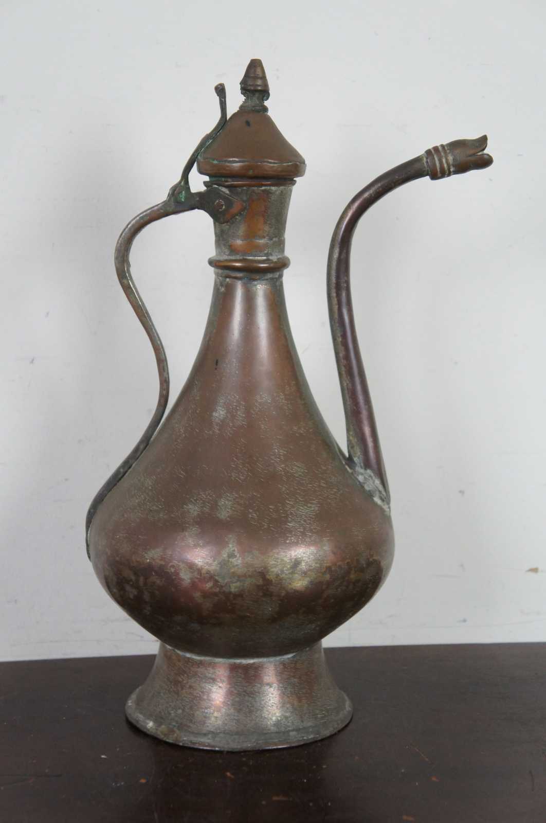 Antique dovetailed hammered copper pitcher / ewer / carafe with hinged lid and goose neck spout.