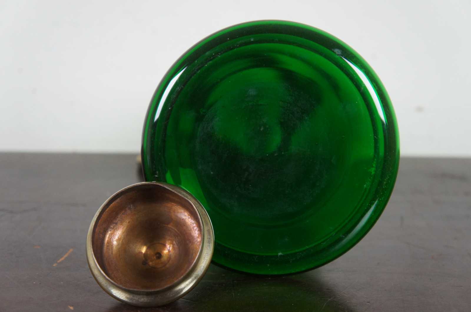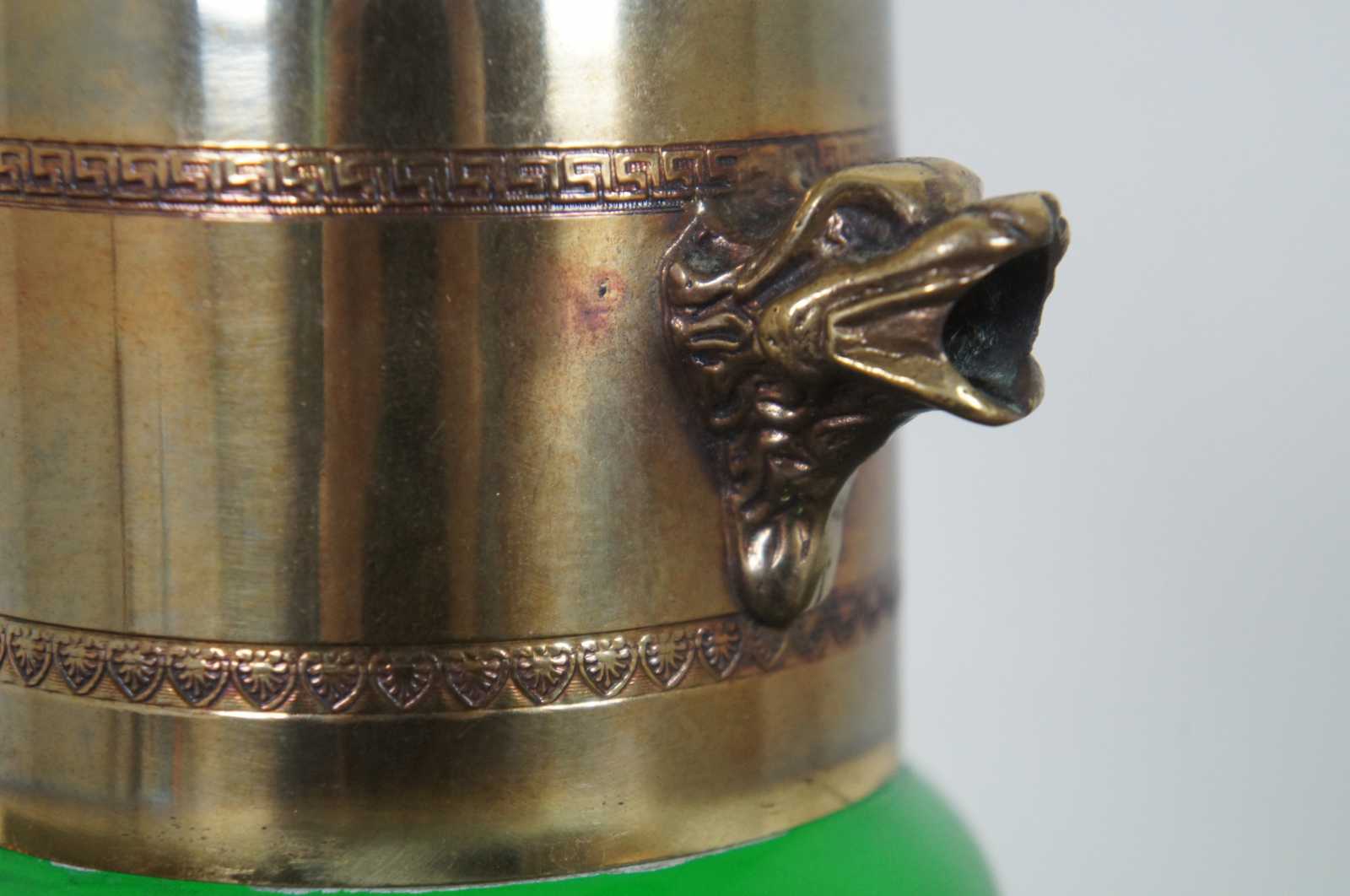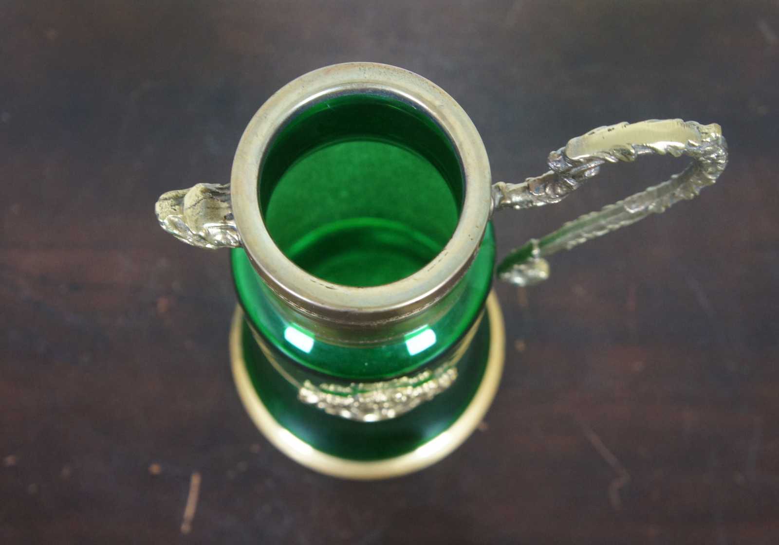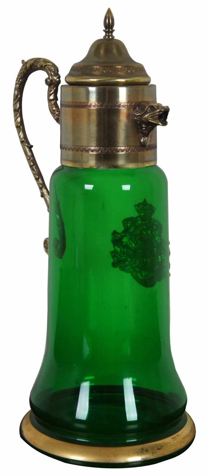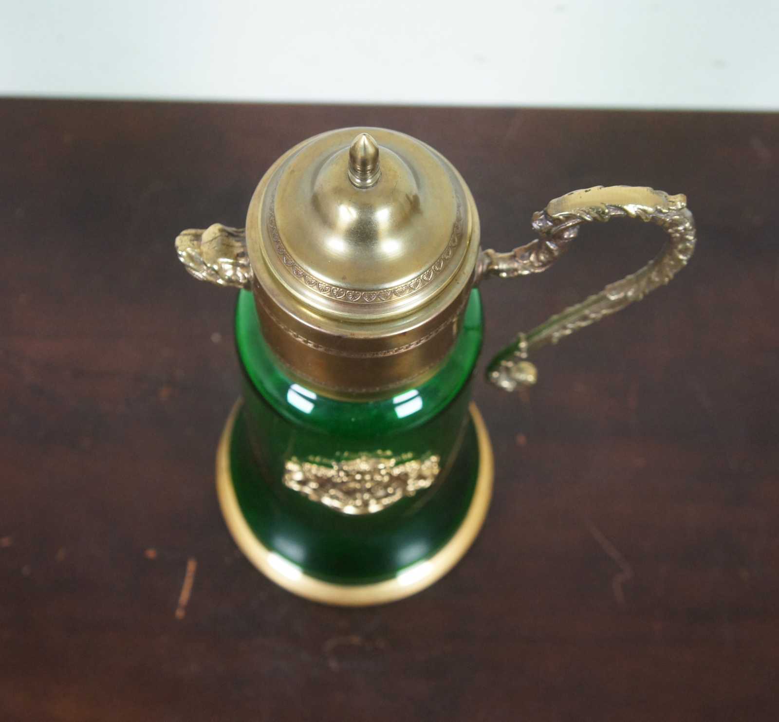 Vintage bohemian green glass pitcher with glass top and handle, griffin shaped spout, and a coat of arms with the motto Spes Ultima Dea (Latin for “Hope is the last goddess.”).