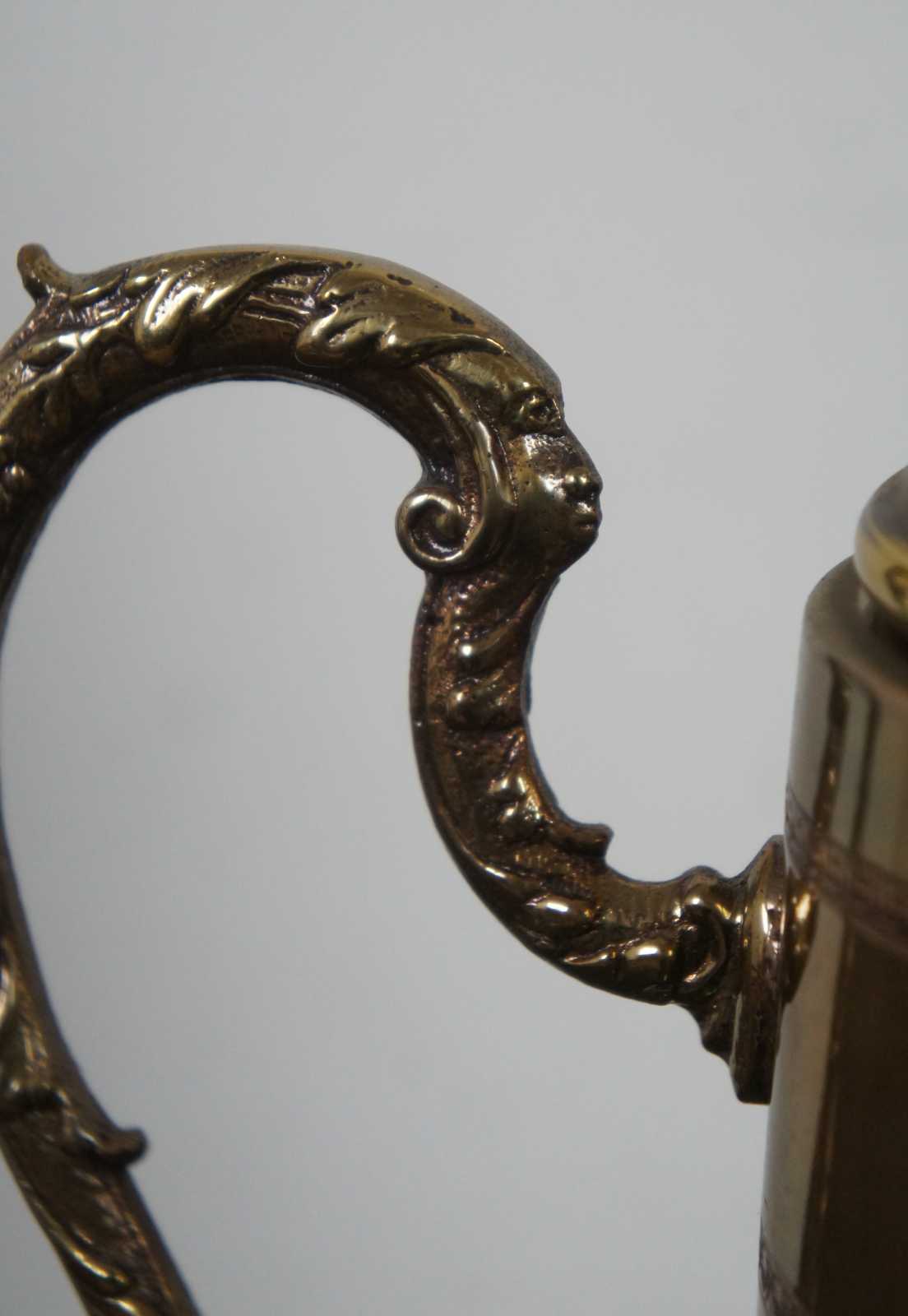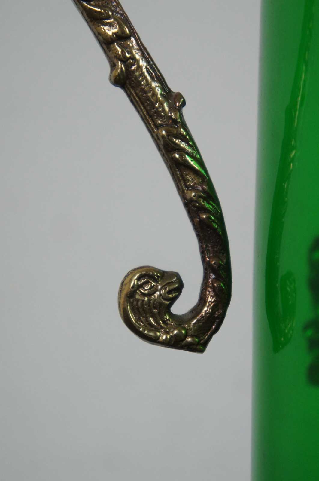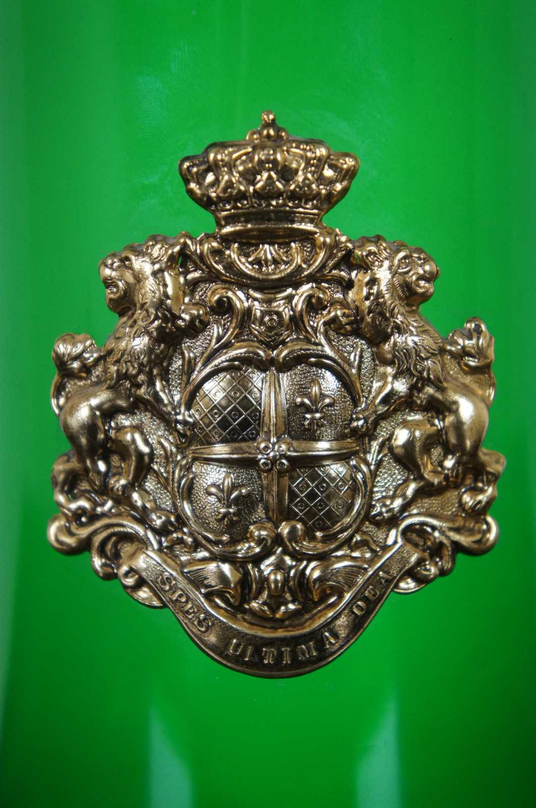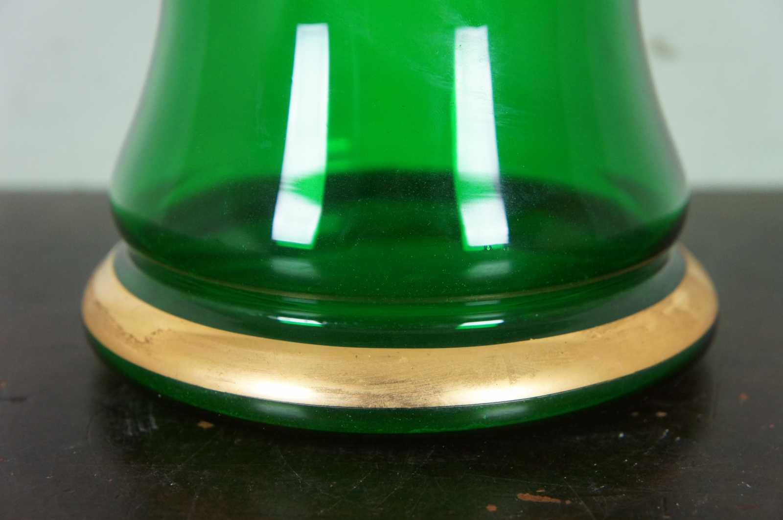 Vintage bohemian green glass pitcher with glass top and handle, griffin shaped spout, and a coat of arms with the motto Spes Ultima Dea (Latin for “Hope is the last goddess.”).