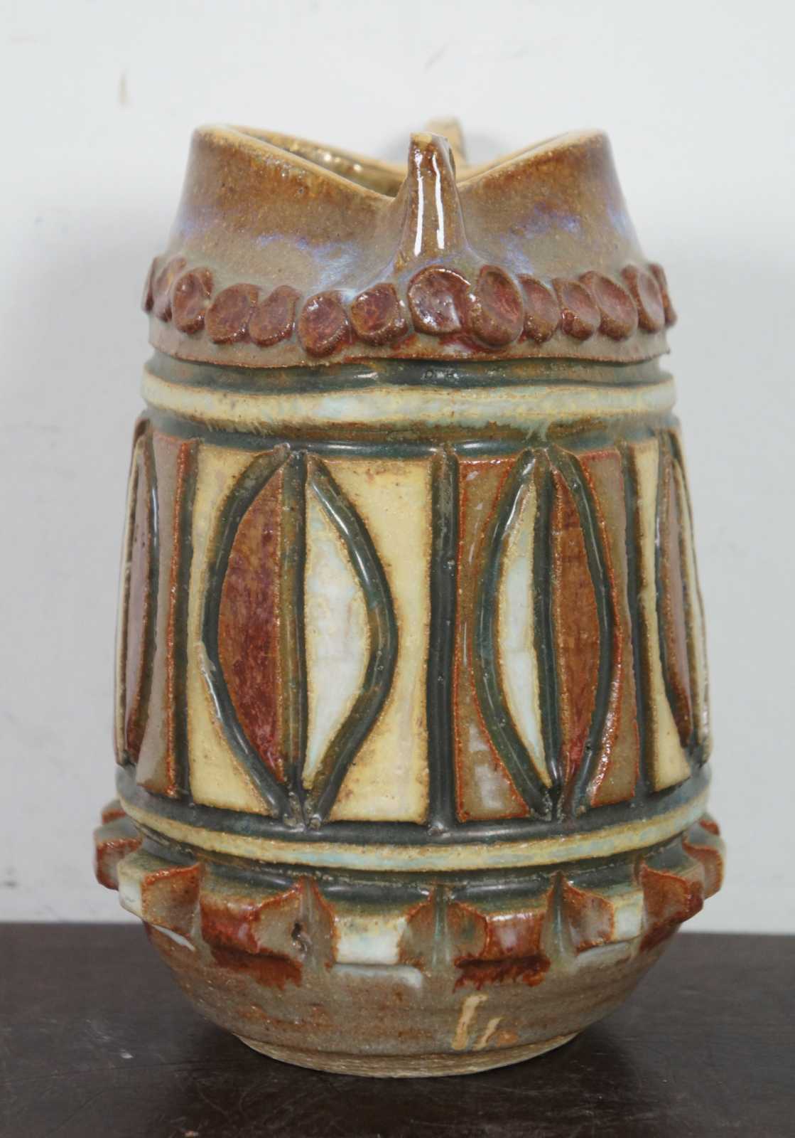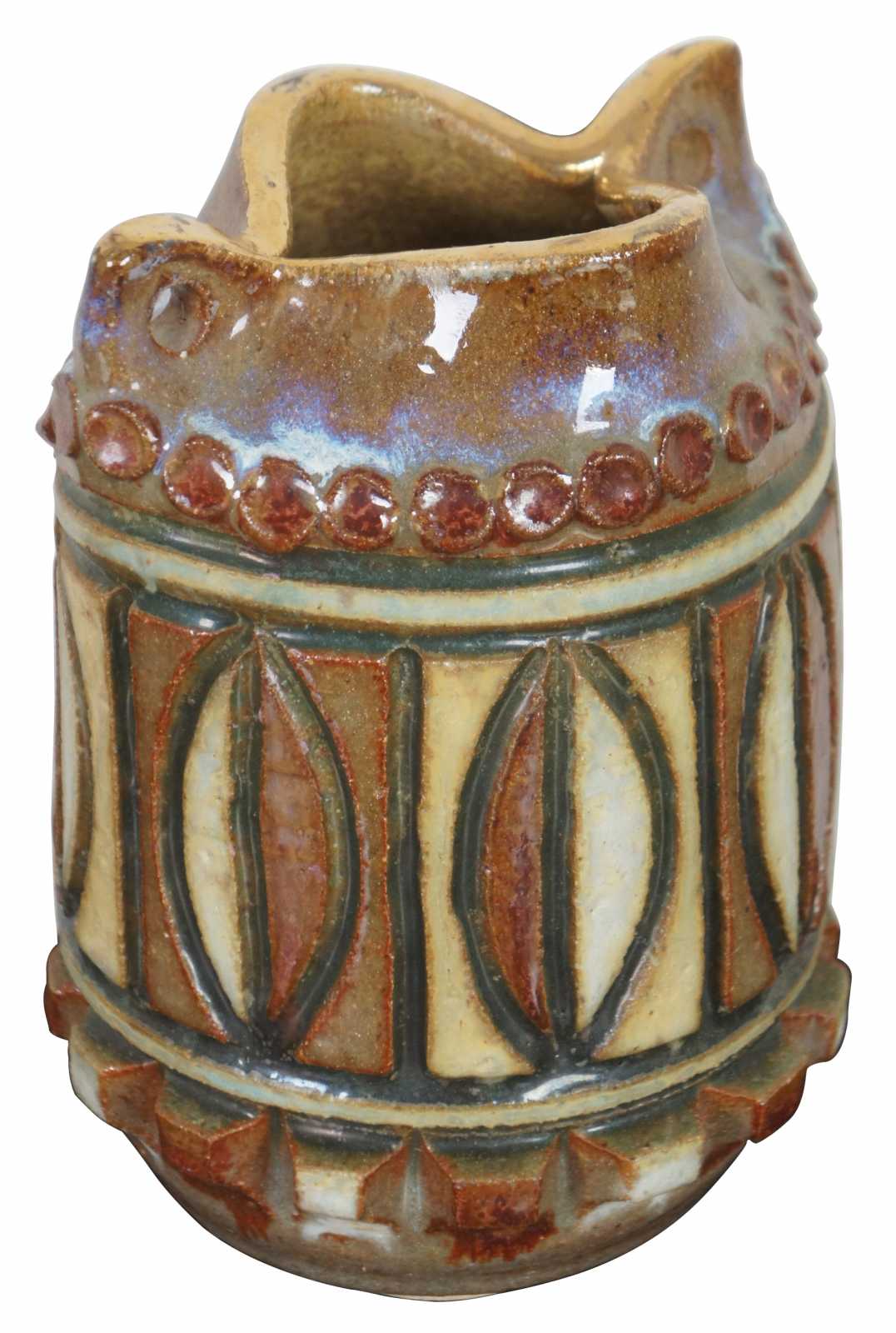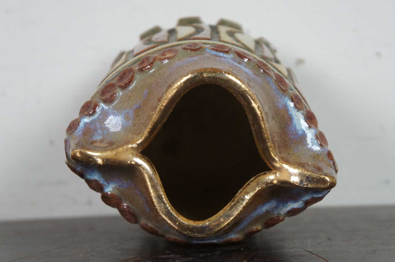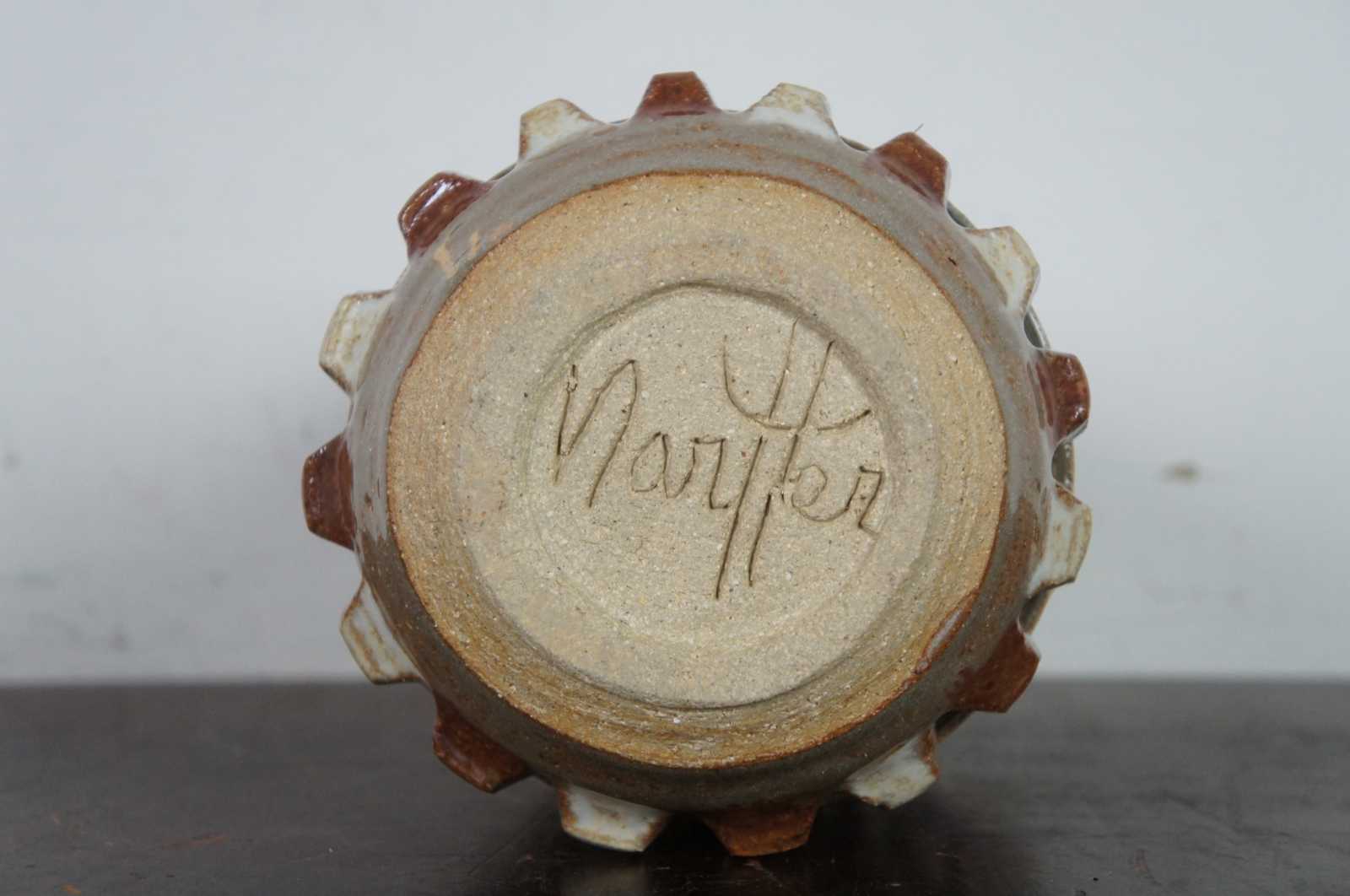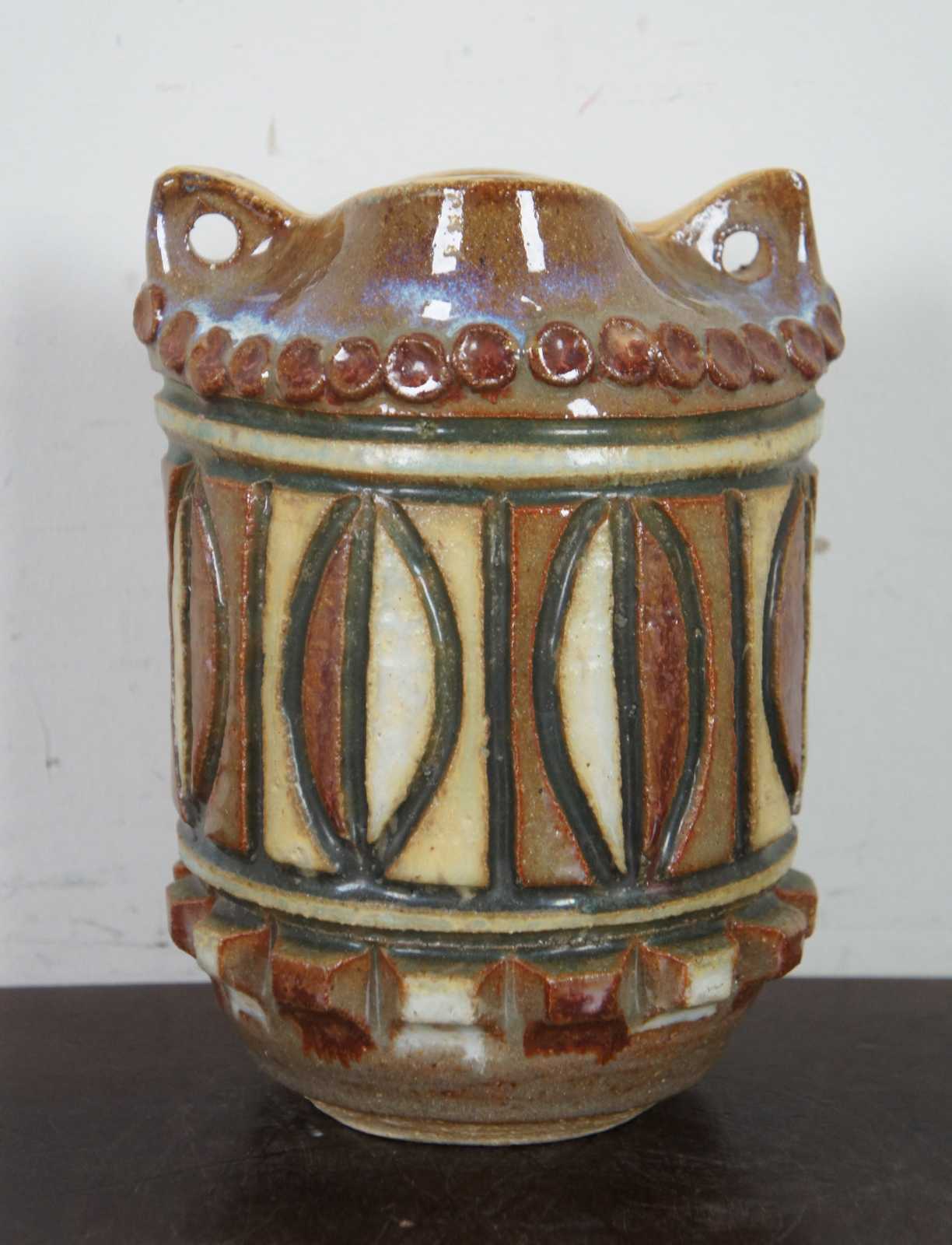 Vintage hand made ceramic vase or planter by John Nartker, featuring multiple shades of brown glaze, an American Southwest inspired design, and loops at the top for hanging. Signed on base. BIO: John Nartker (1930-1988) is a multi-media artist whose specialties are painting, printmaking, and designing in clay. His works have been shown in over 250 one-man, group, and invitational exhibitions both in the United States and abroad, and are included in public, private and corporate collections. John was awarded the Ohioana Citation as the outstanding visual artist in Ohio for the year 1985 and is the recipient of an Outstanding Educator in American Colleges and Universities award. His works have been published in “The Guild” by Kraus-Sikes of New York City. “The Great Chess Set” was included in the 1987 “Guiness Book of World Records. Kalida native John Nartker resided many years with his family in Cincinnati, OH and served as Professor of art at the College of Mount St. Joseph.