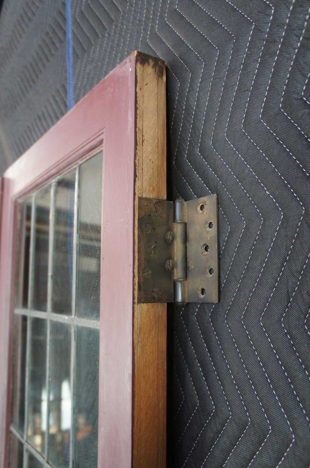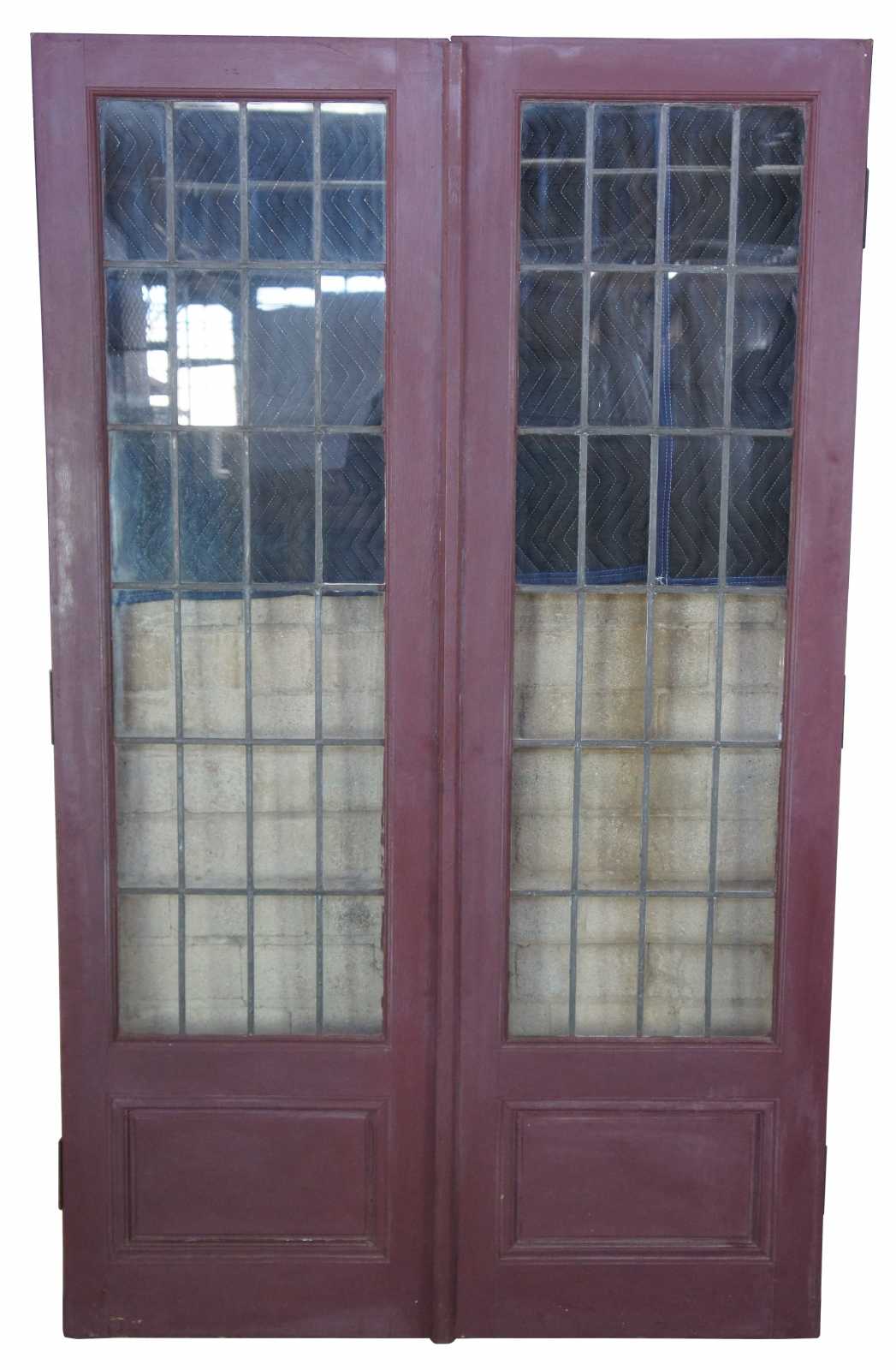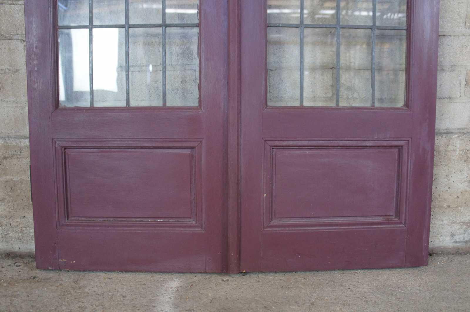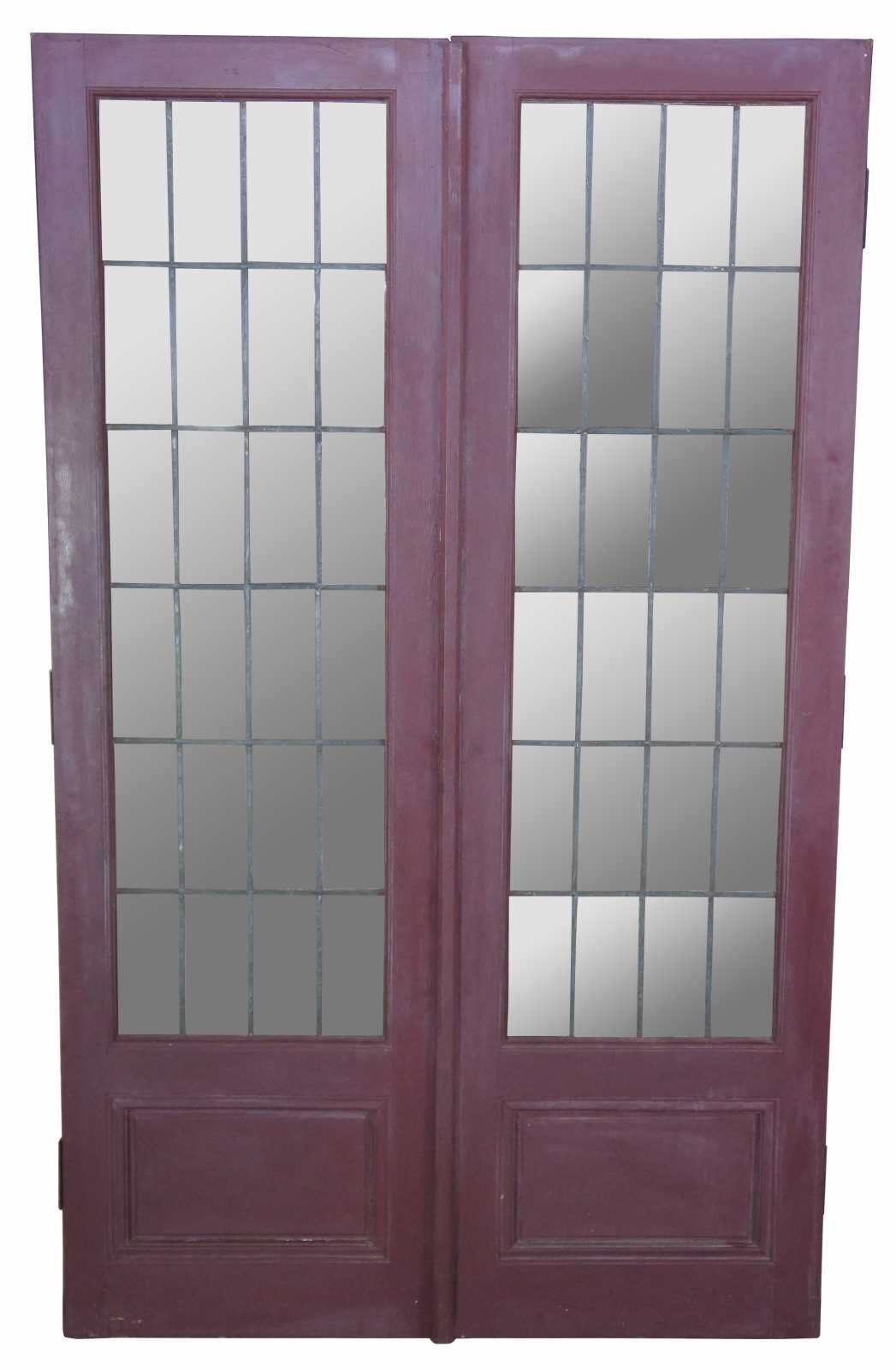 Ealy 20th century French doors. Made from solid oak with 24 panel leaded glass sections over paneled accent. Reclaimed from one of the first homes built in Oakwood, Ohio by Harry I Schenck, circa early 1900s. These doors were originally used between a patio and interior room, so they are painted red along one side.