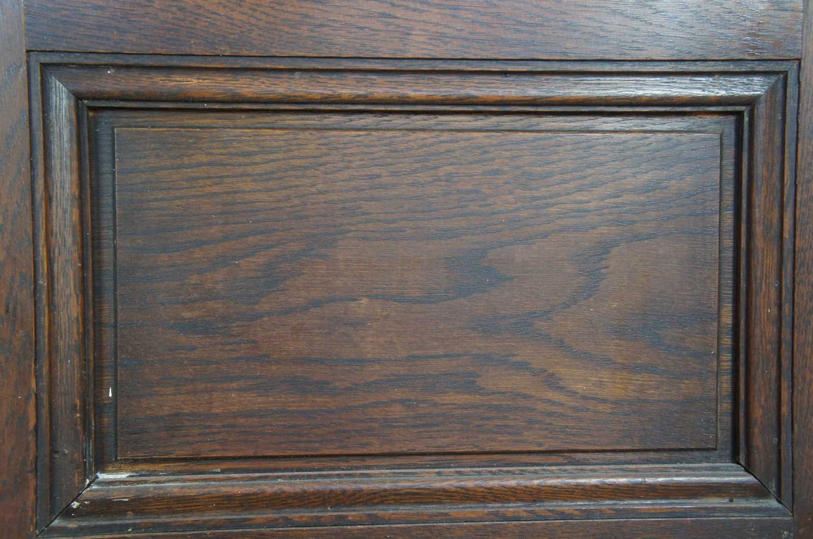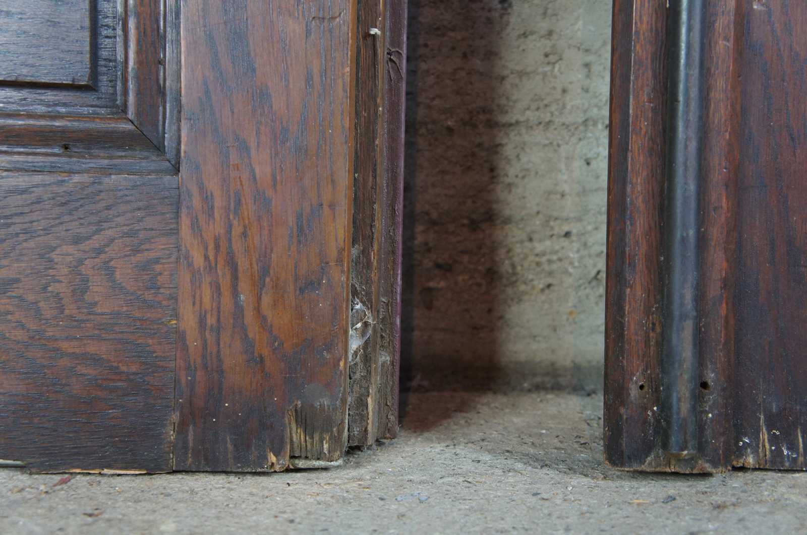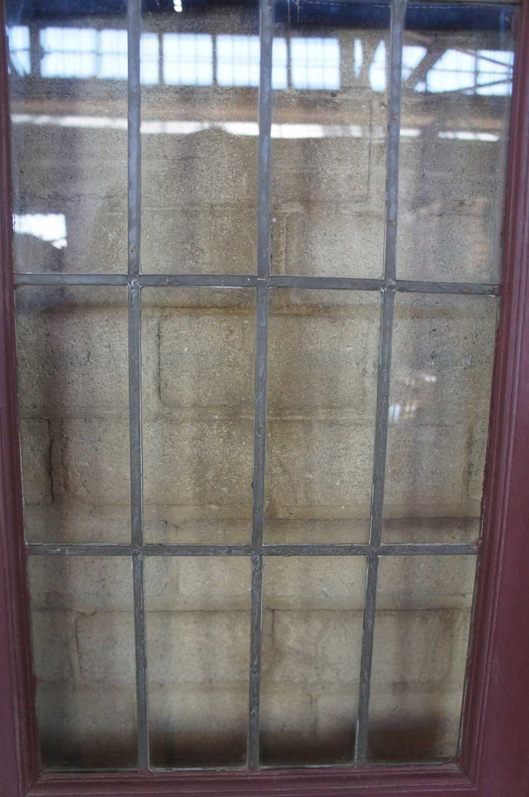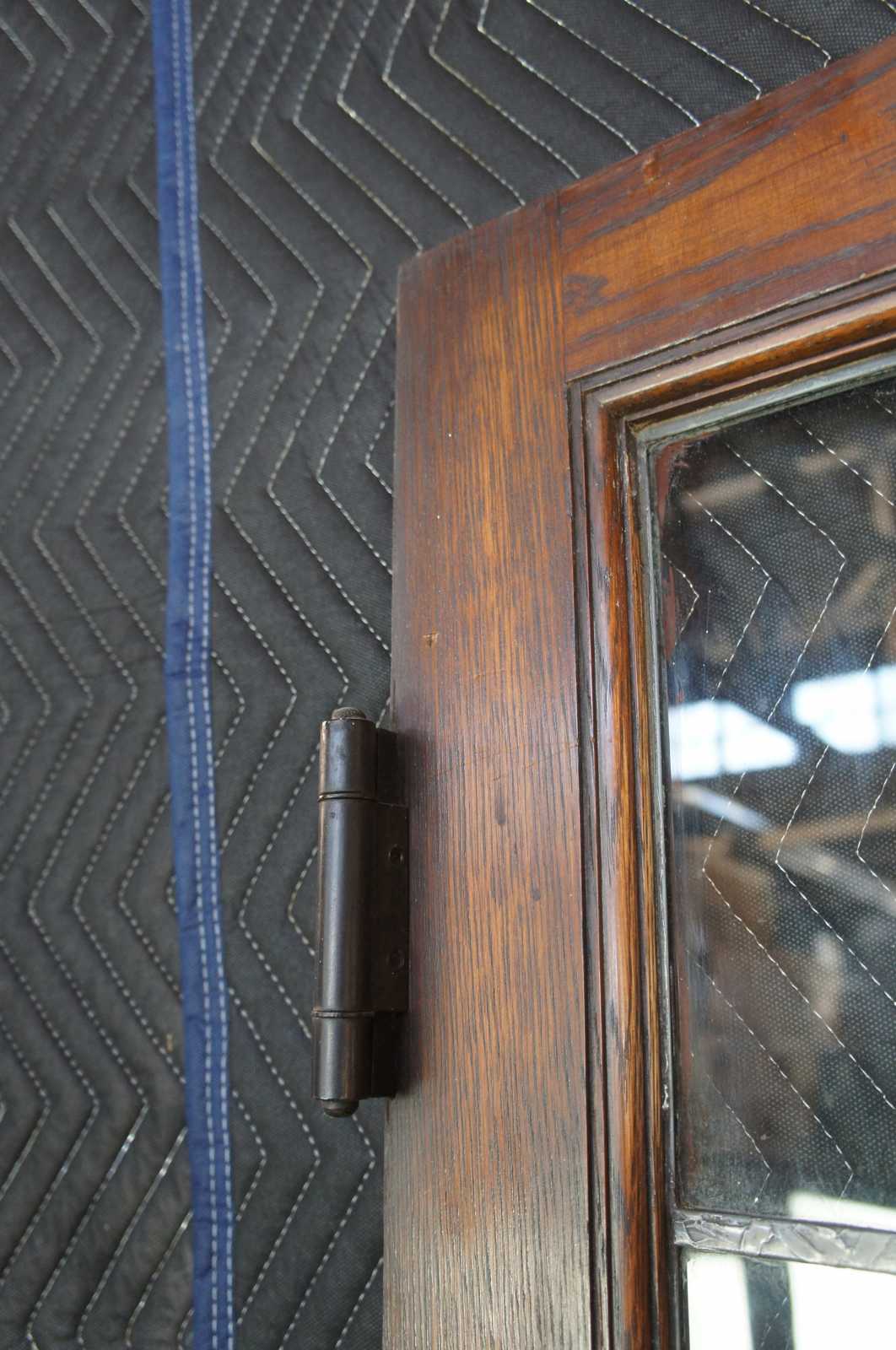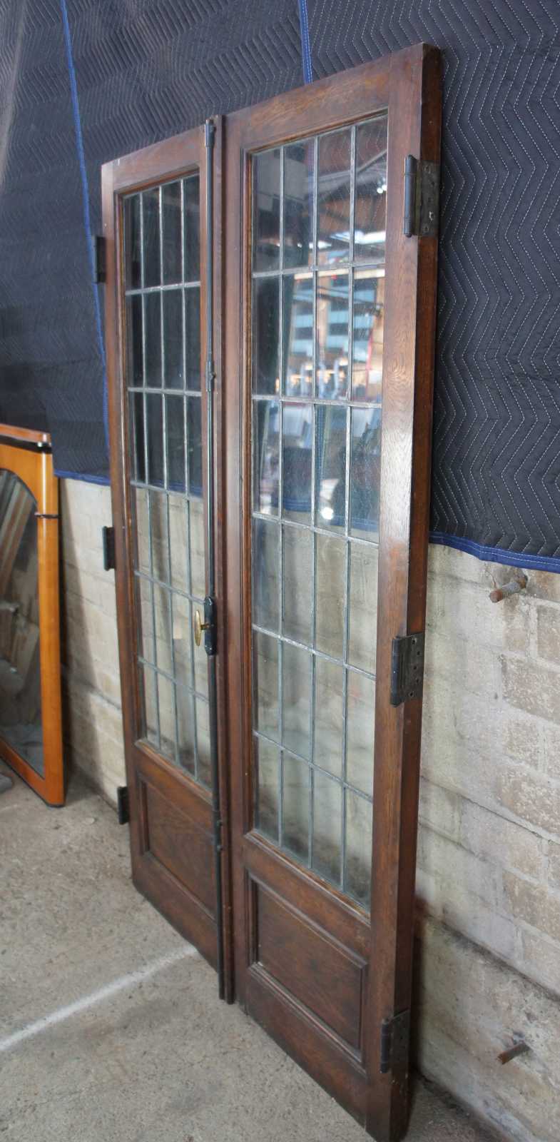 Ealy 20th century French doors. Made from solid oak with 24 panel leaded glass sections over paneled accent. Reclaimed from one of the first homes built in Oakwood, Ohio by Harry I Schenck, circa early 1900s. These doors were originally used between a patio and interior room, so they are painted red along one side.