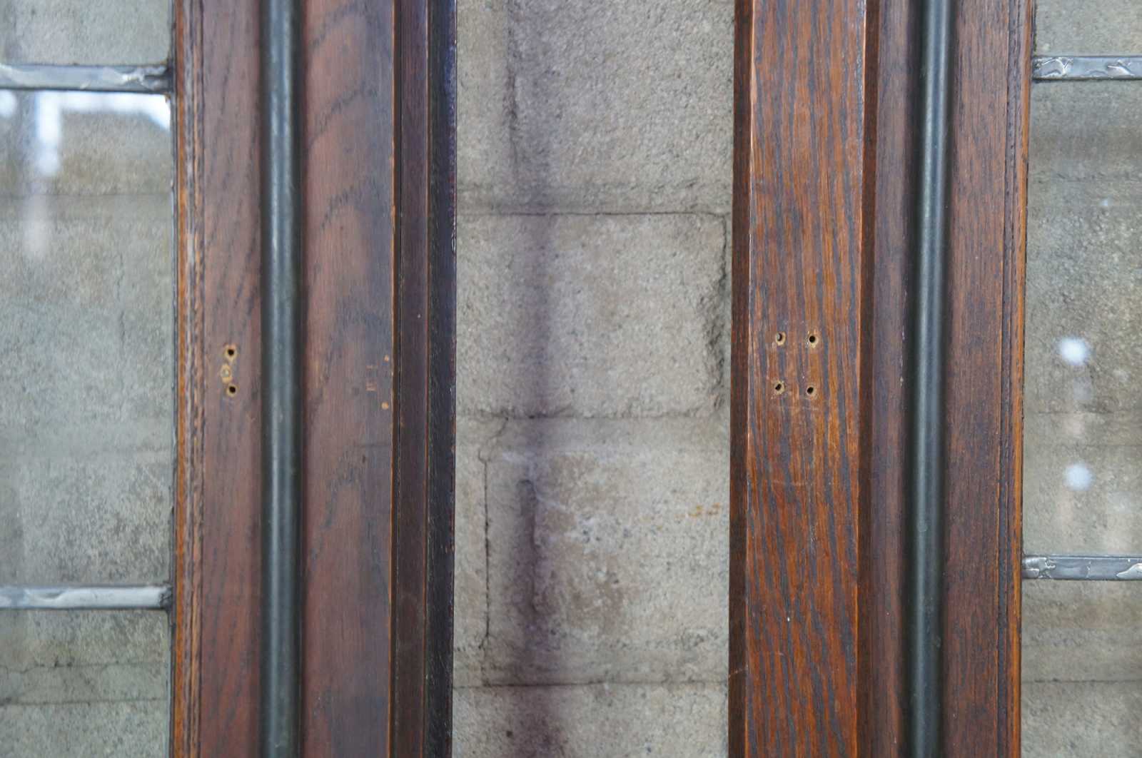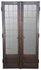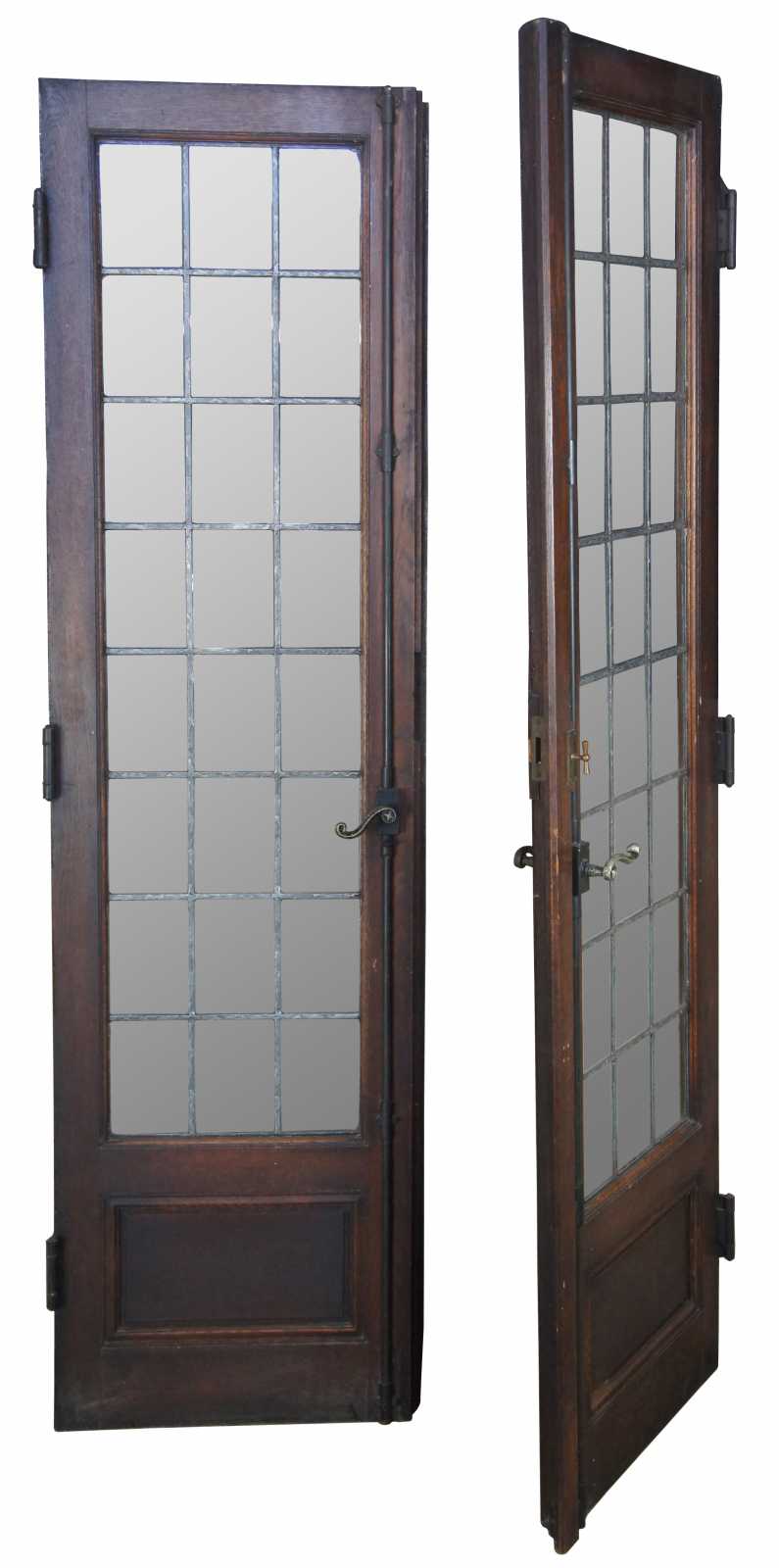 Ealy 20th century French doors. Made from solid oak with 24 panel leaded glass sections over paneled accent and spanish revival door handles. Reclaimed from one of the first homes built in Oakwood, Ohio by Harry I Schenck, circa early 1900s.