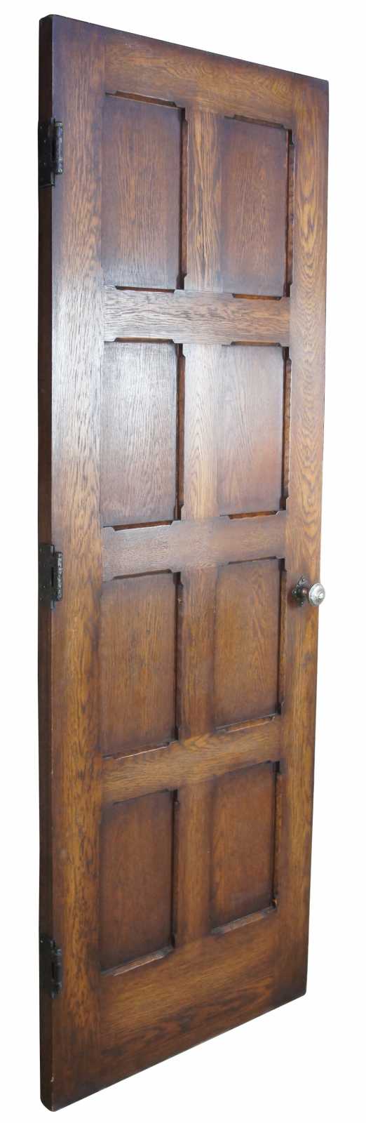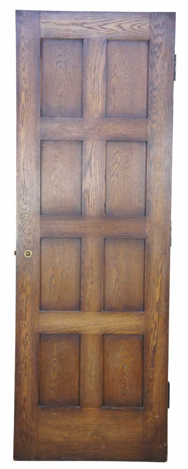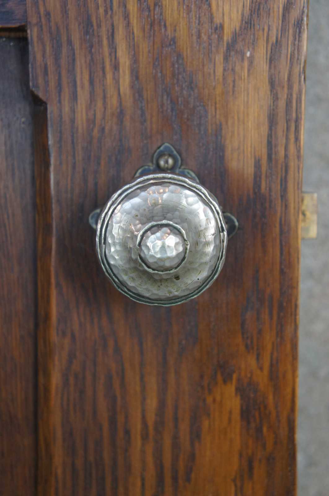 Early 20th century oak reclaimed door. Features eight panels in a grid pattern with Spanish Revival design hammered hardware with a knob on one side and push button on the other. Comes from one of the first homes built in Oakwood, Ohio by Harry I Schenck, circa early 1900s.