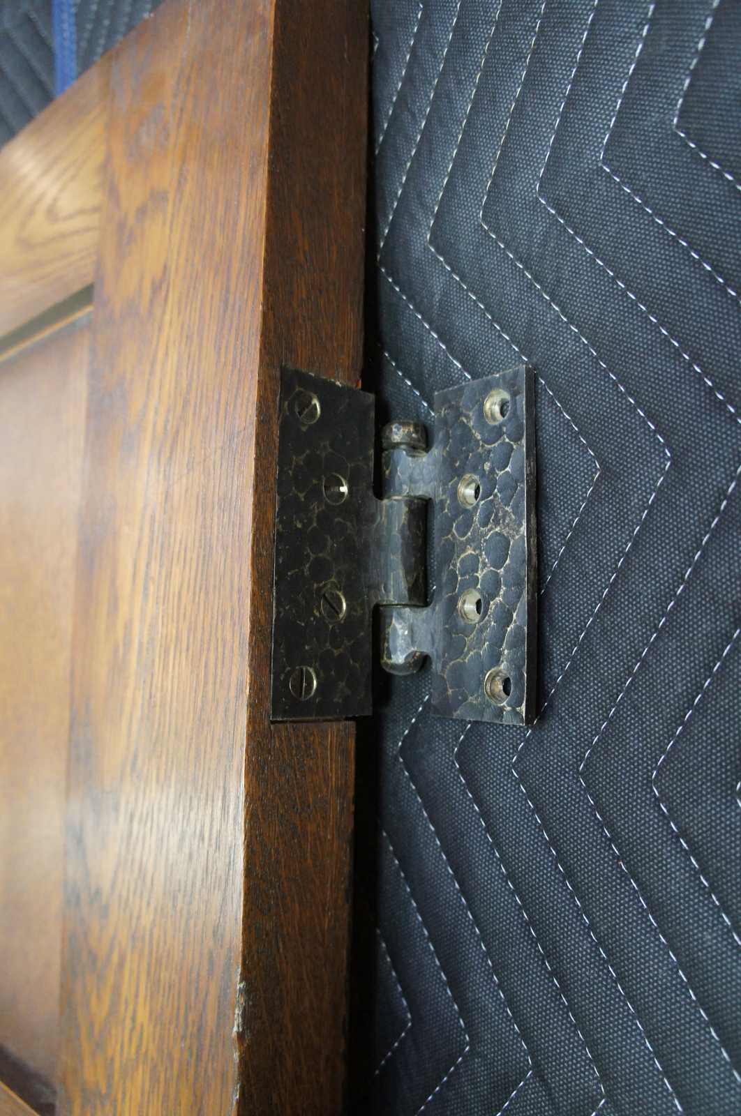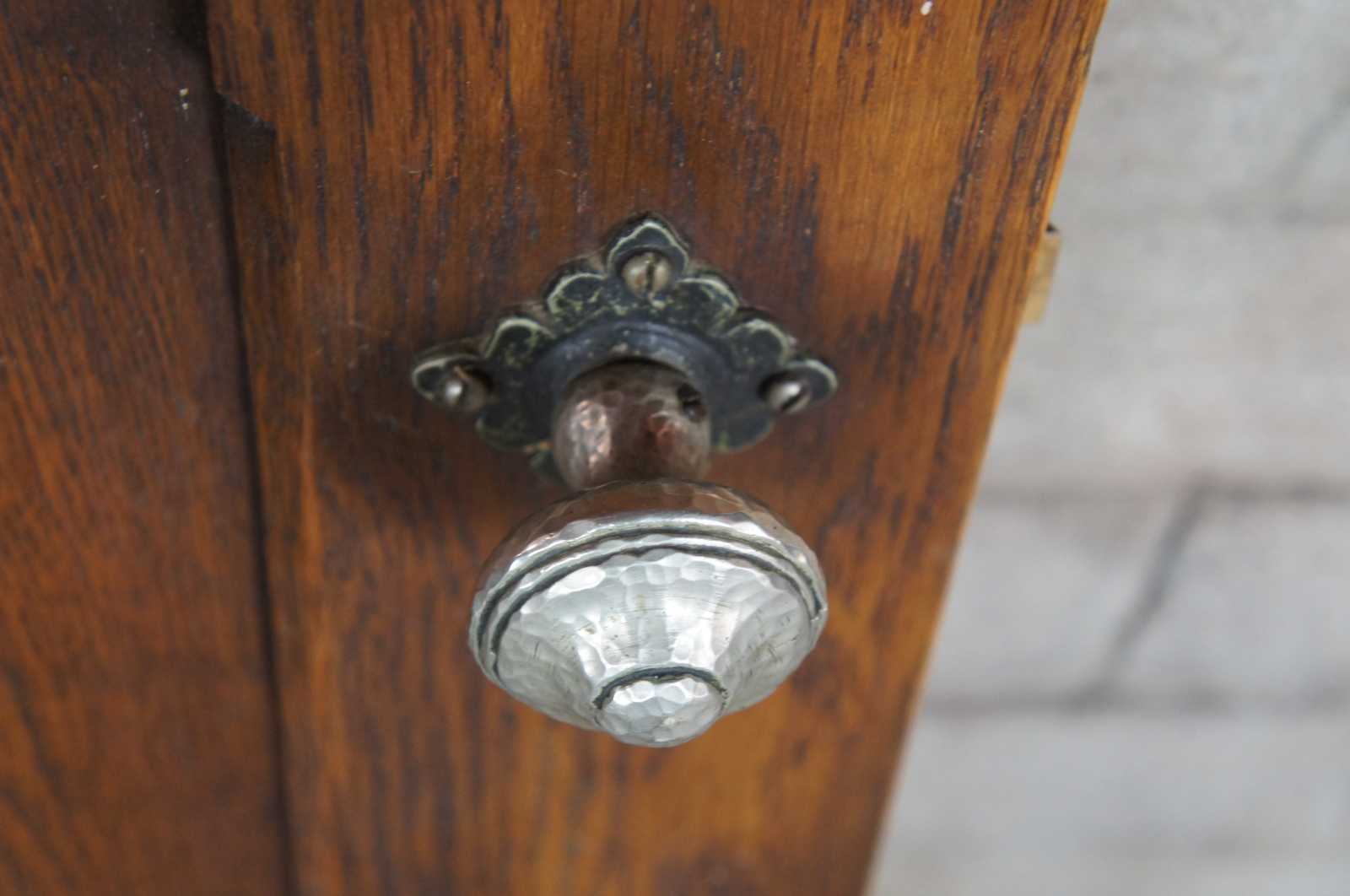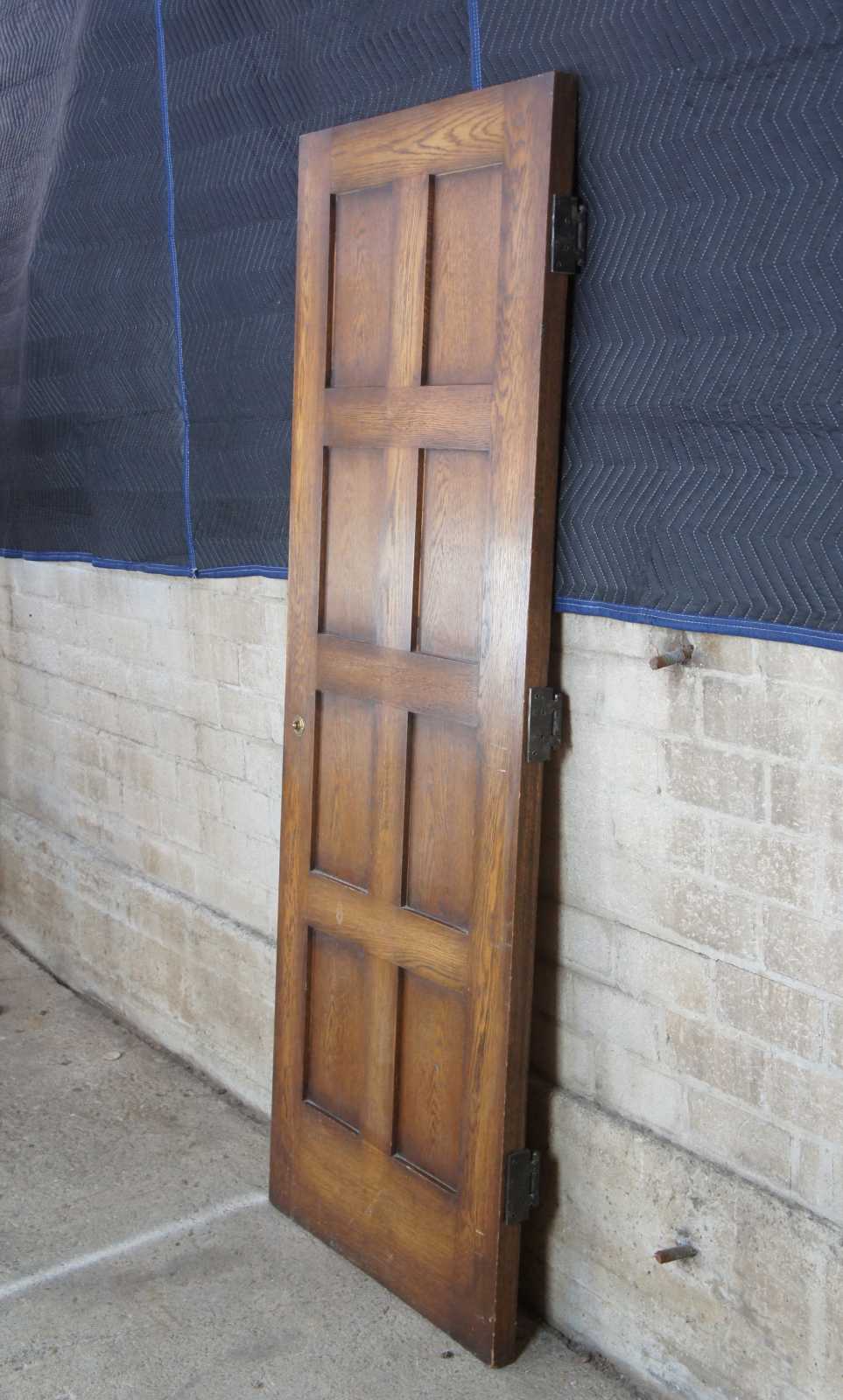 Early 20th century oak reclaimed door. Features eight panels in a grid pattern with Spanish Revival design hammered hardware with a knob on one side and push button on the other. Comes from one of the first homes built in Oakwood, Ohio by Harry I Schenck, circa early 1900s.