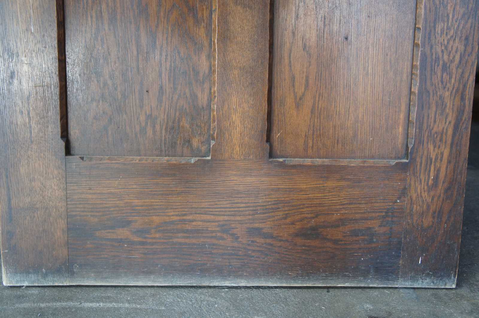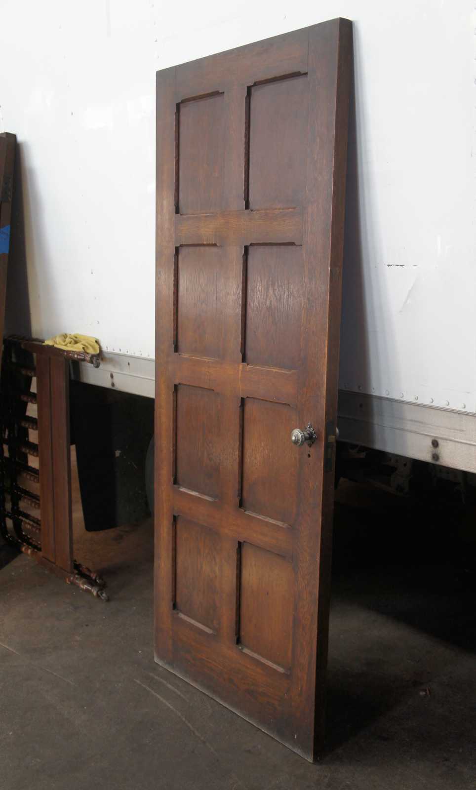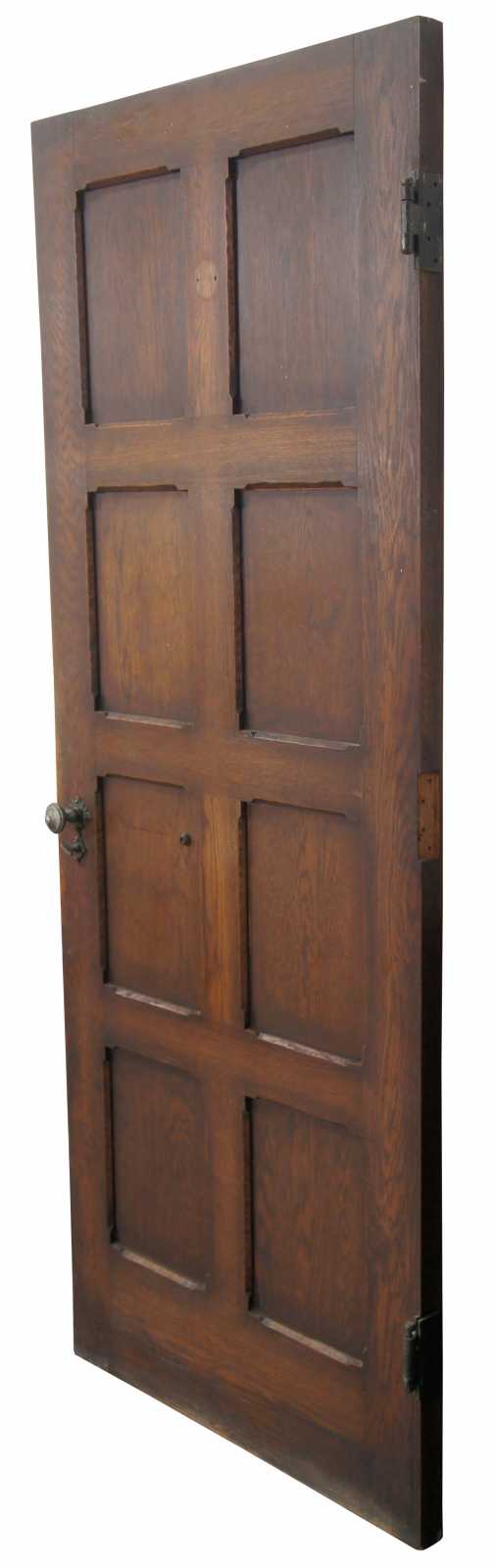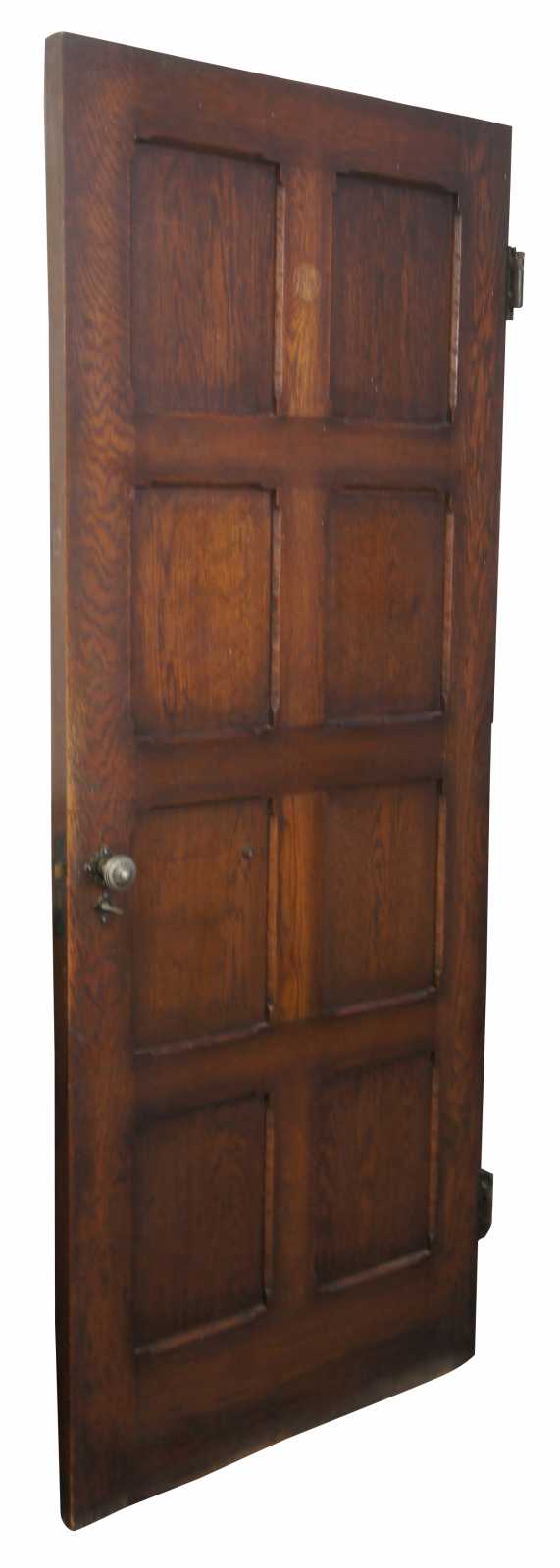 Early 20th century oak reclaimed door. Features eight panels in a grid pattern with Spanish Revival design hammered hardware with knobs and deadbolt. Comes from one of the first homes built in Oakwood, Ohio by Harry I Schenck, circa early 1900s.