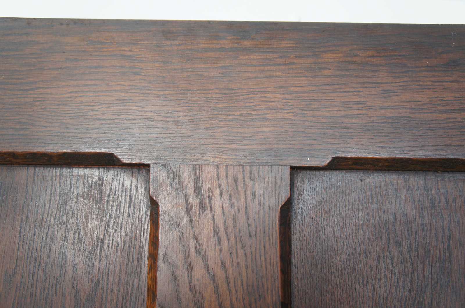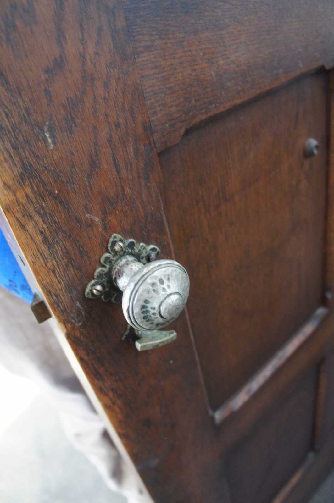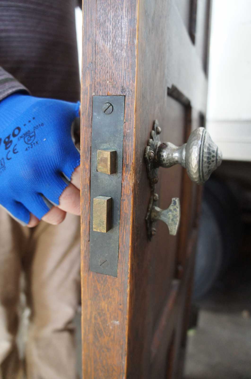 Early 20th century oak reclaimed door. Features eight panels in a grid pattern with Spanish Revival design hammered hardware with knobs and deadbolt. Comes from one of the first homes built in Oakwood, Ohio by Harry I Schenck, circa early 1900s.