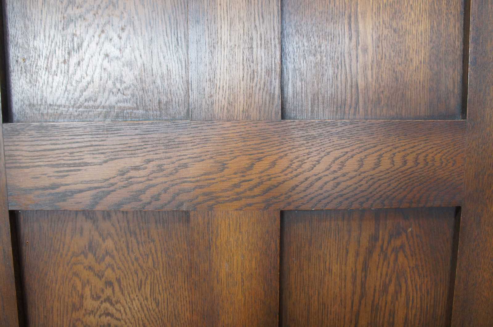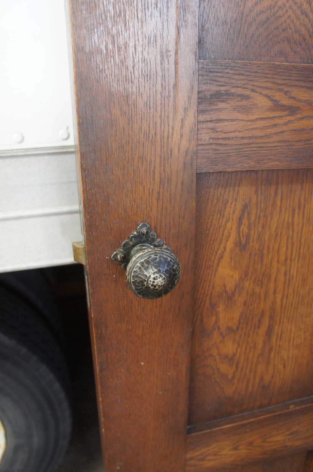 Early 20th century oak reclaimed door. Features eight panels in a grid pattern with Spanish Revival design and hammered hardware with knobs. Comes from one of the first homes built in Oakwood, Ohio by Harry I Schenck, circa early 1900s.