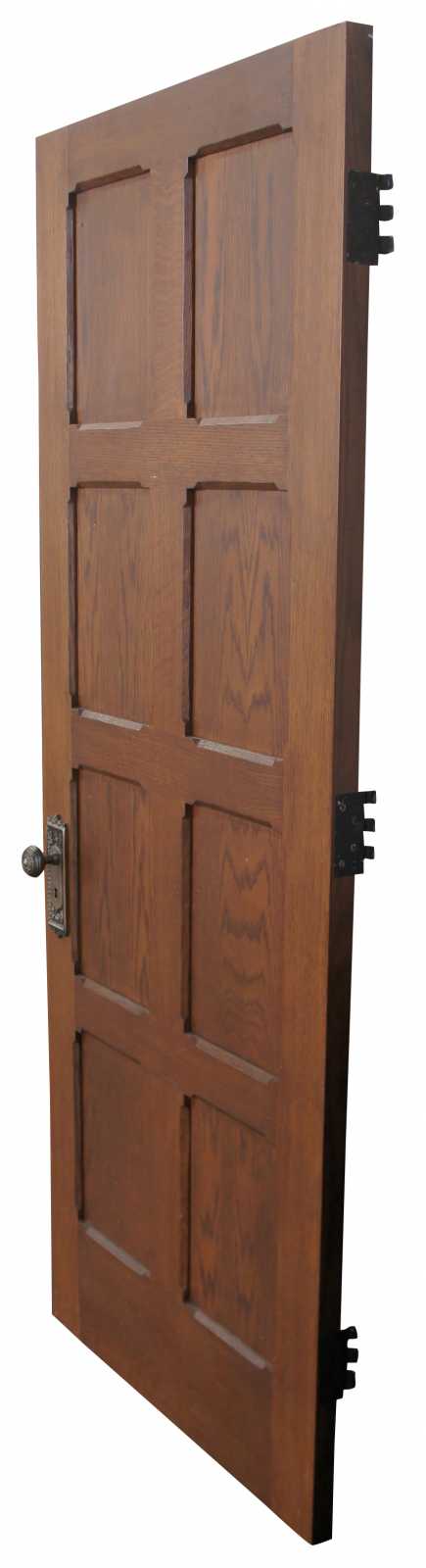 Vintage oak panel door. Features eight panels in a grid pattern with Spanish Revival design.