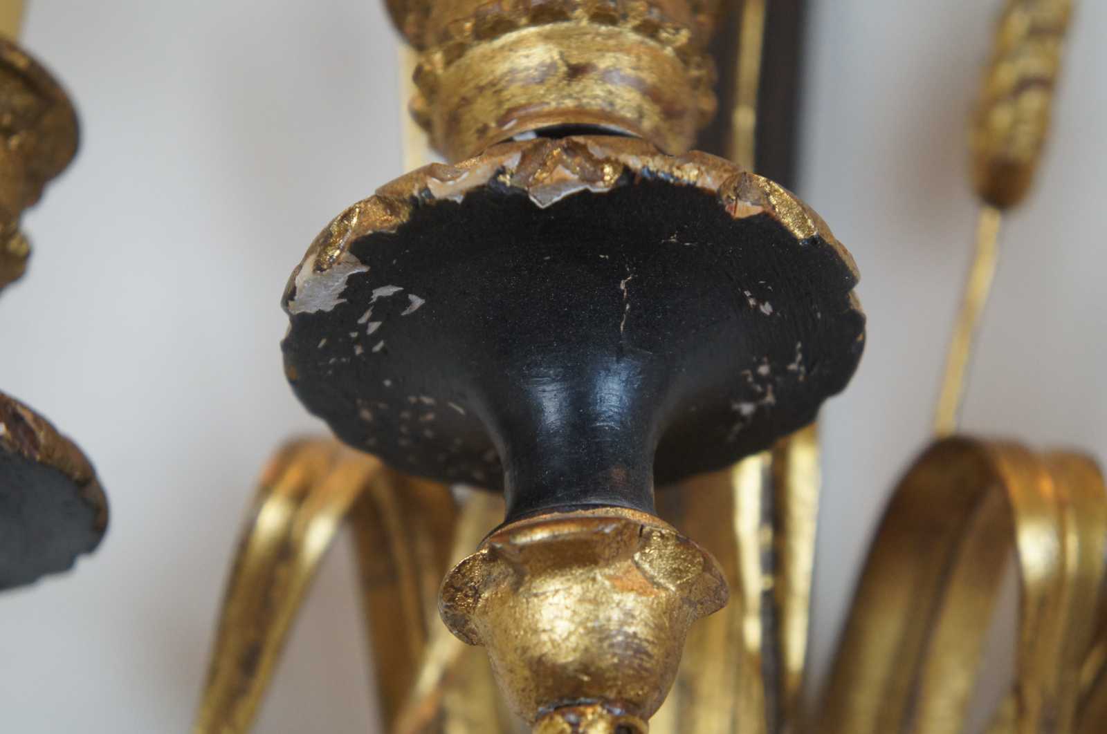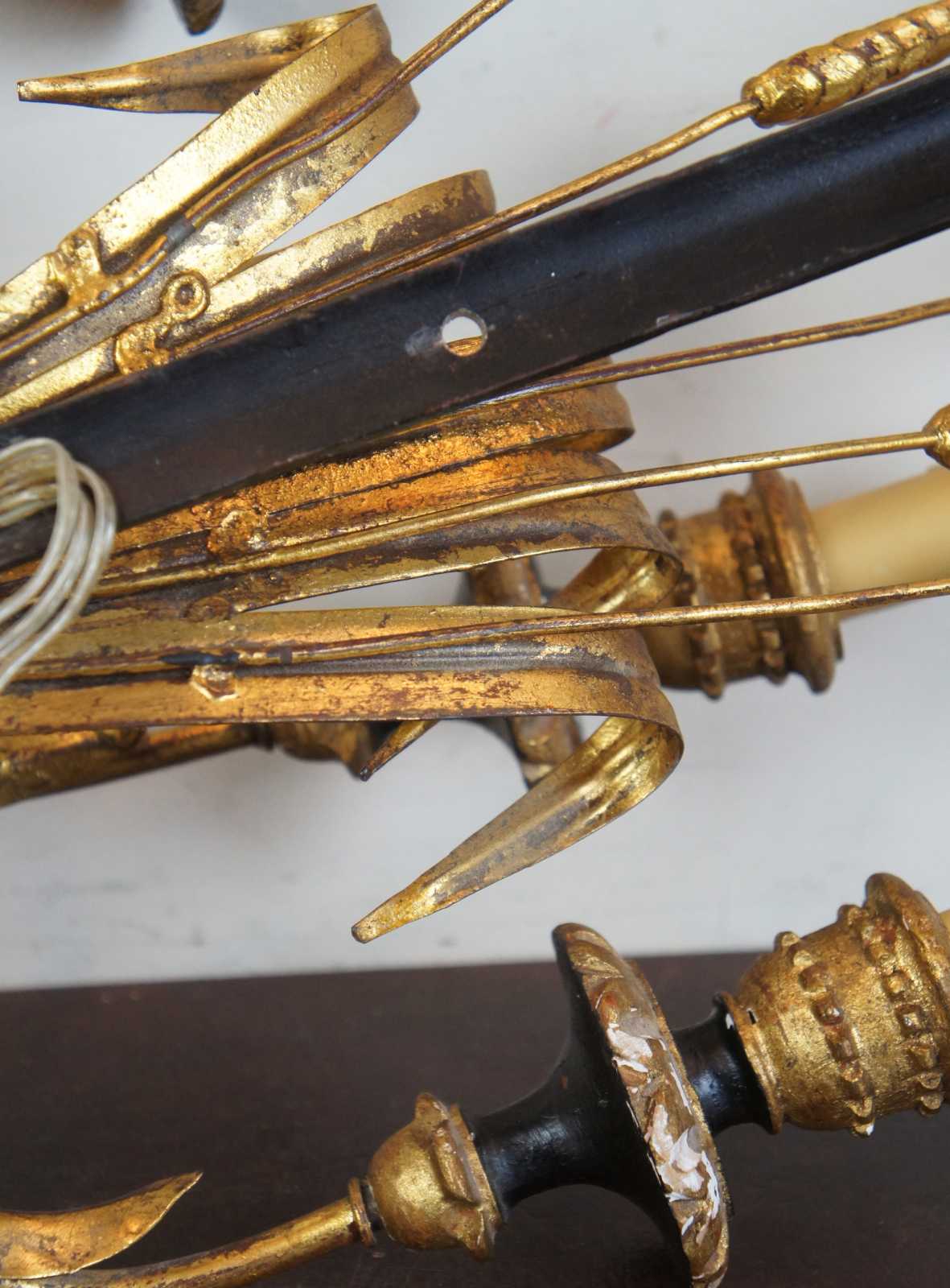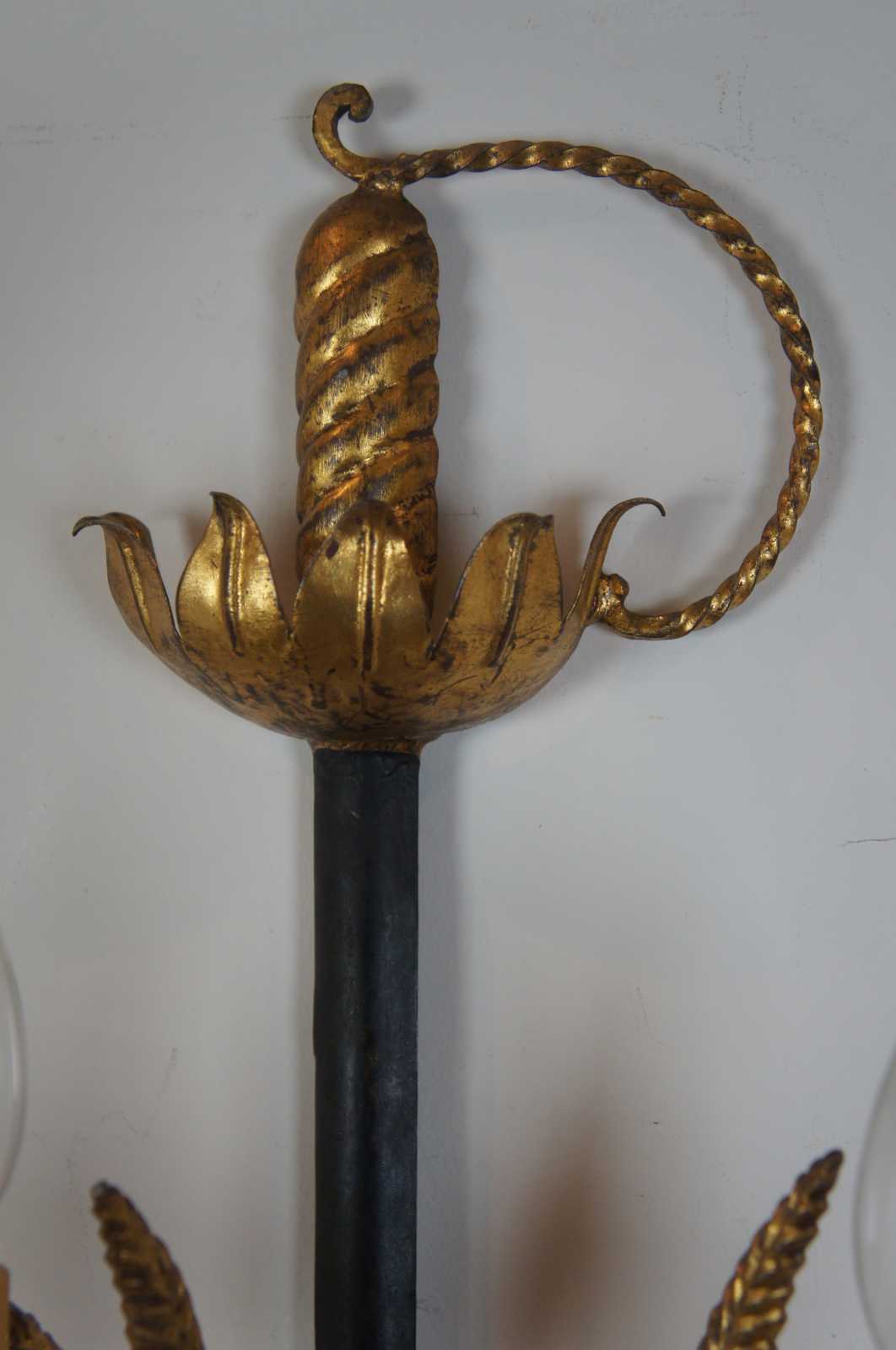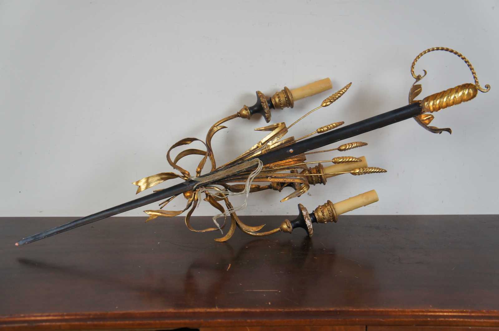 Vintage Italian toleware Florentine three-light wall sconce shaped like a small sheaf of wheat tied with a bow to a rapier or sword.