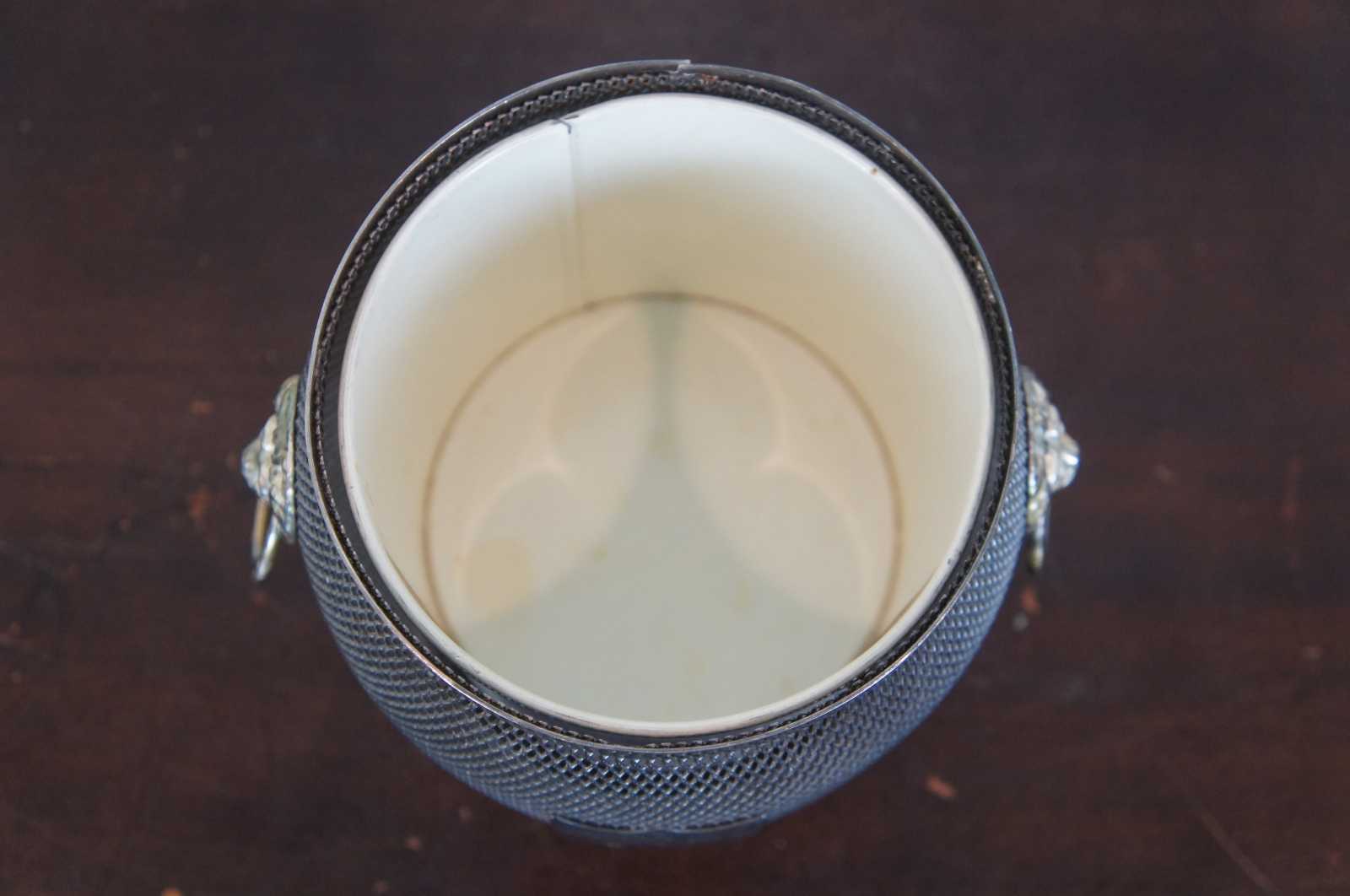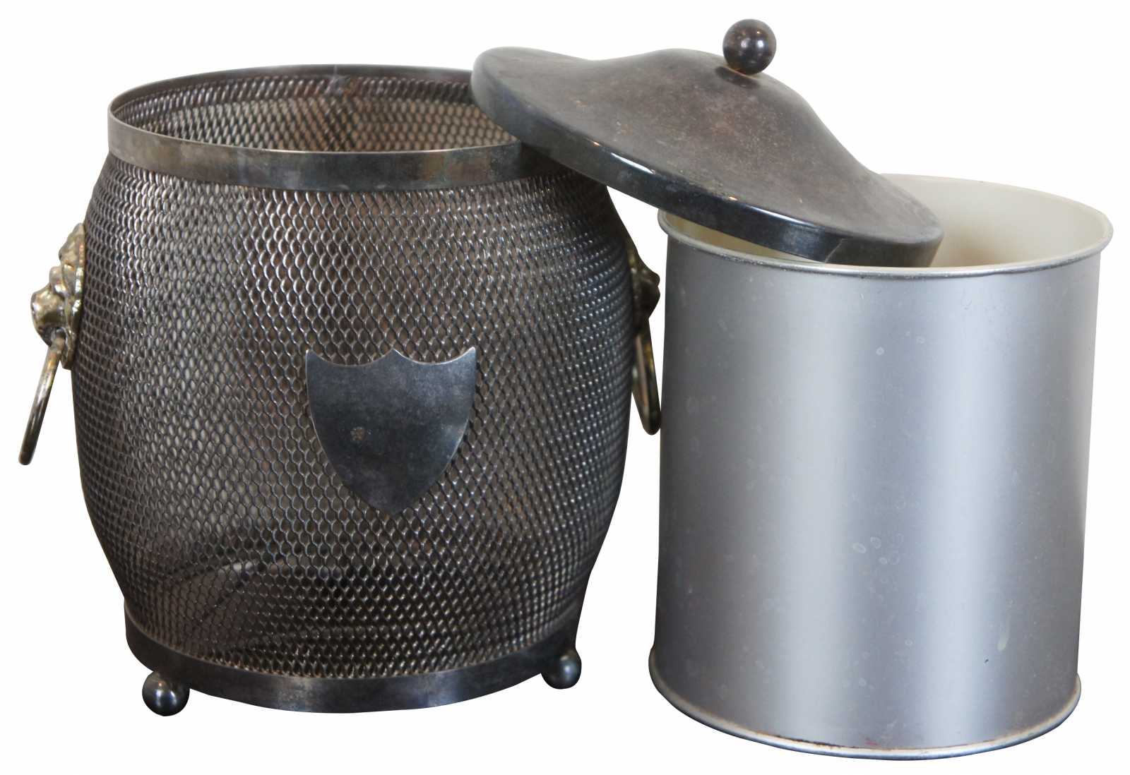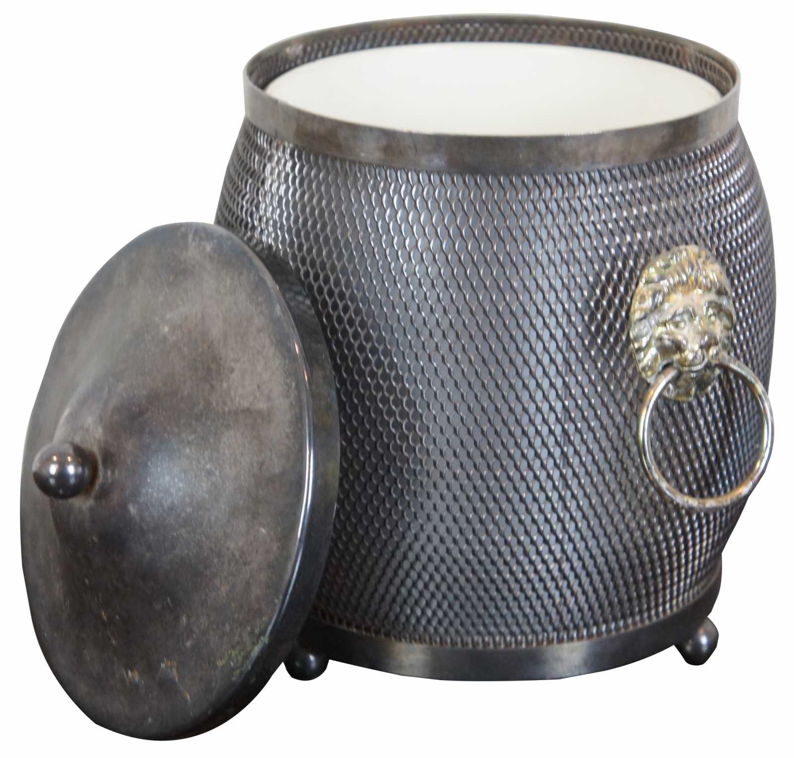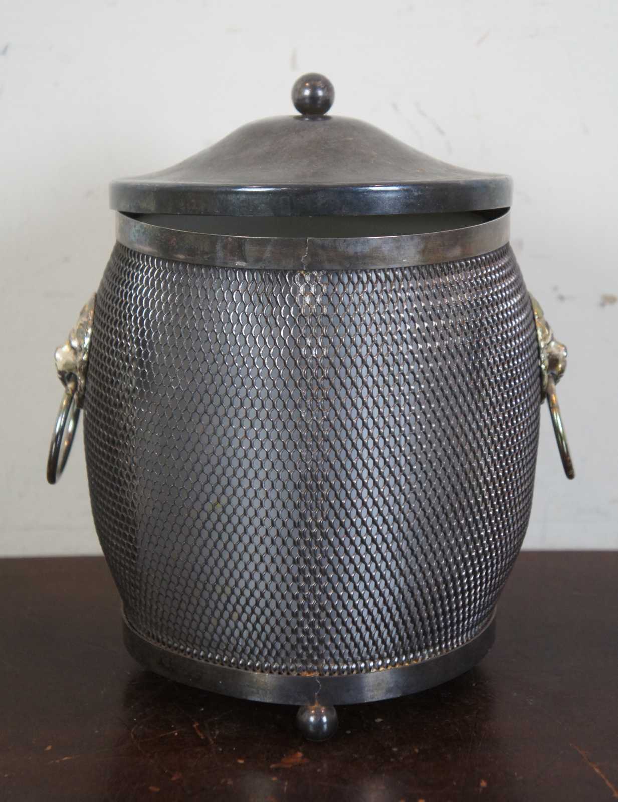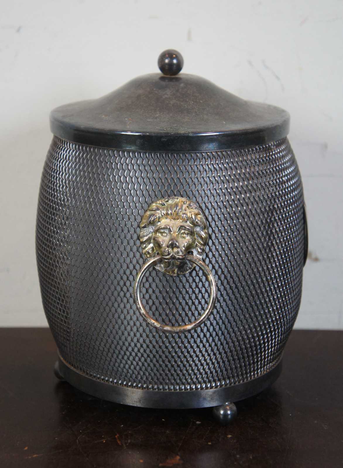 Vintage made in England biscuit barrel, tea caddy or small ice bucket made of metal mesh with shield accent (no monogram) and lions head handles. Includes tin insert.