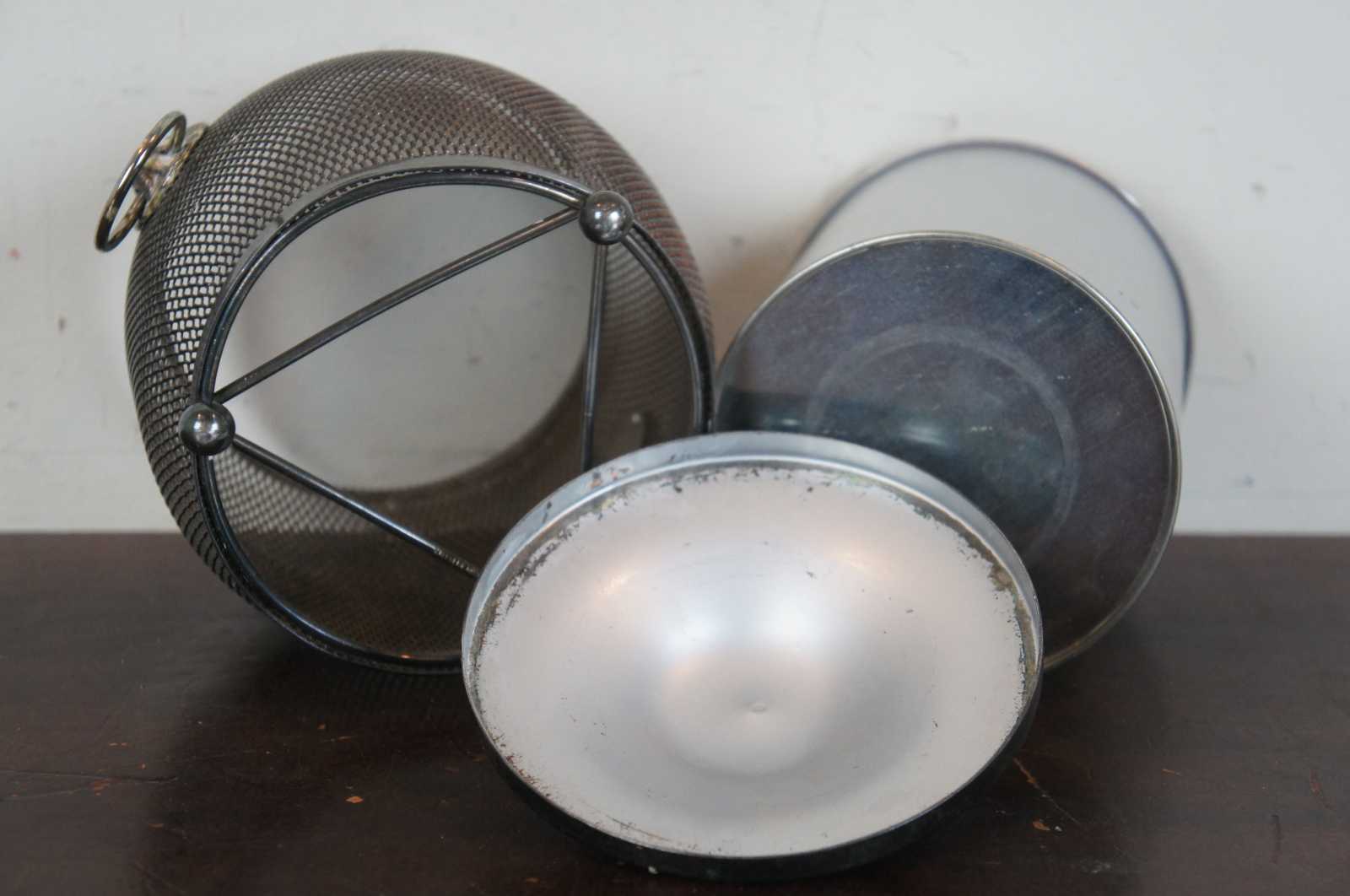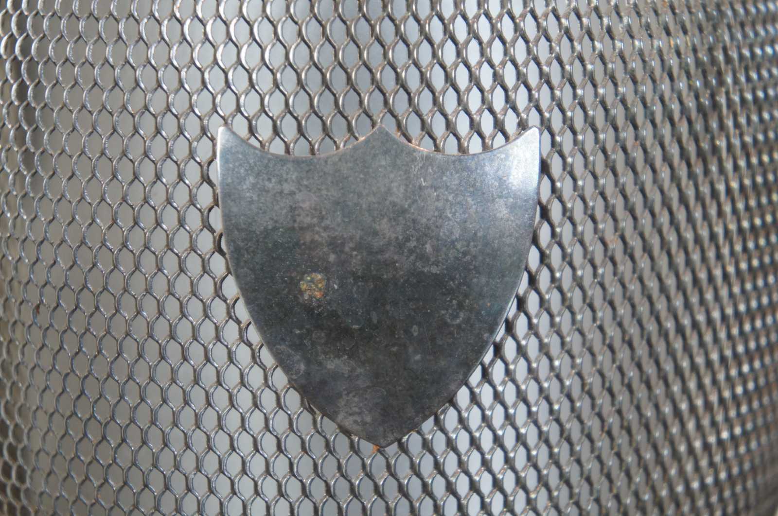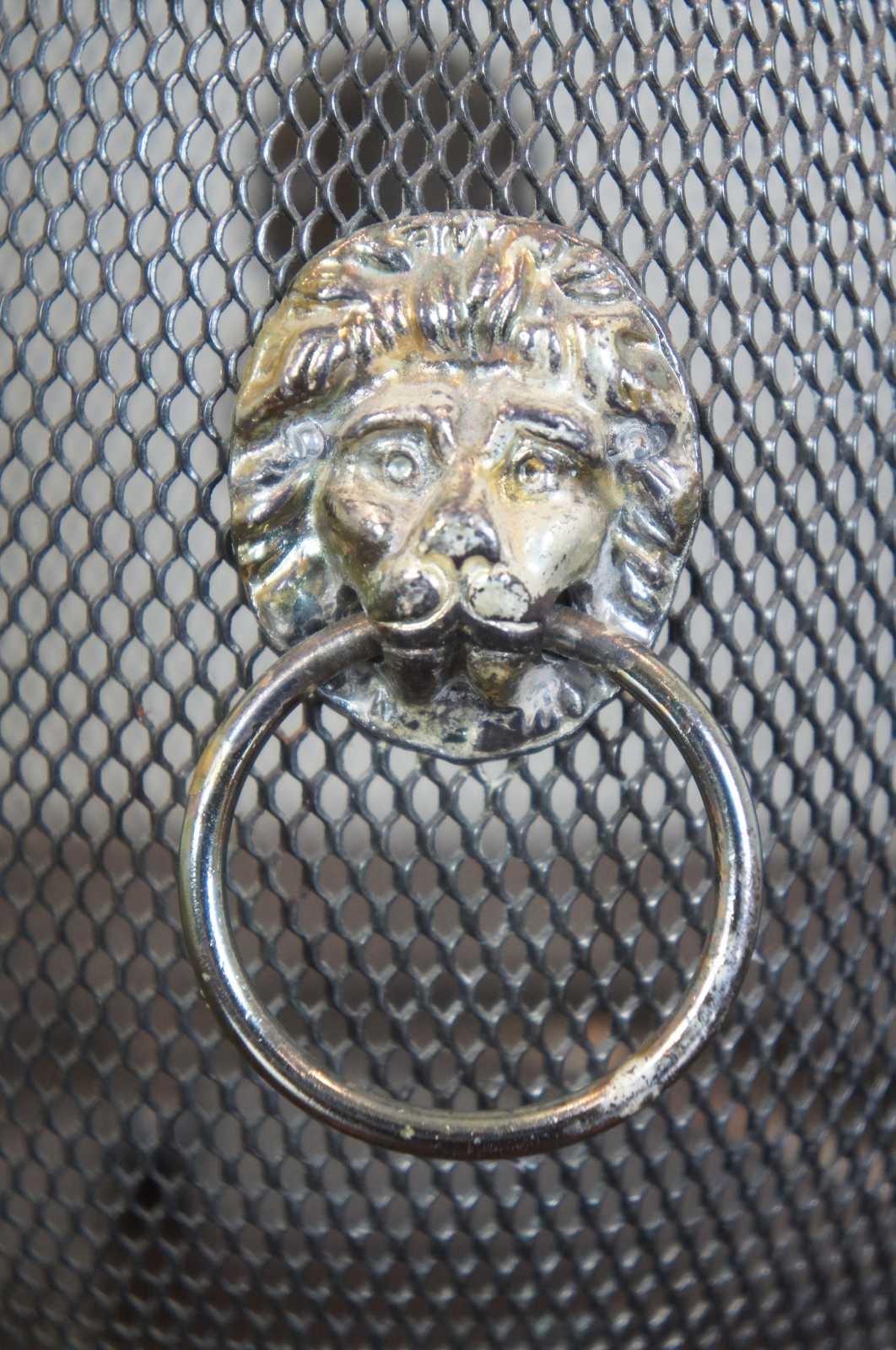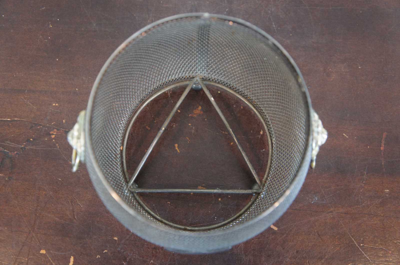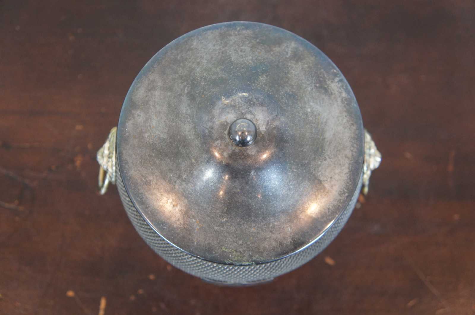 Vintage made in England biscuit barrel, tea caddy or small ice bucket made of metal mesh with shield accent (no monogram) and lions head handles. Includes tin insert.