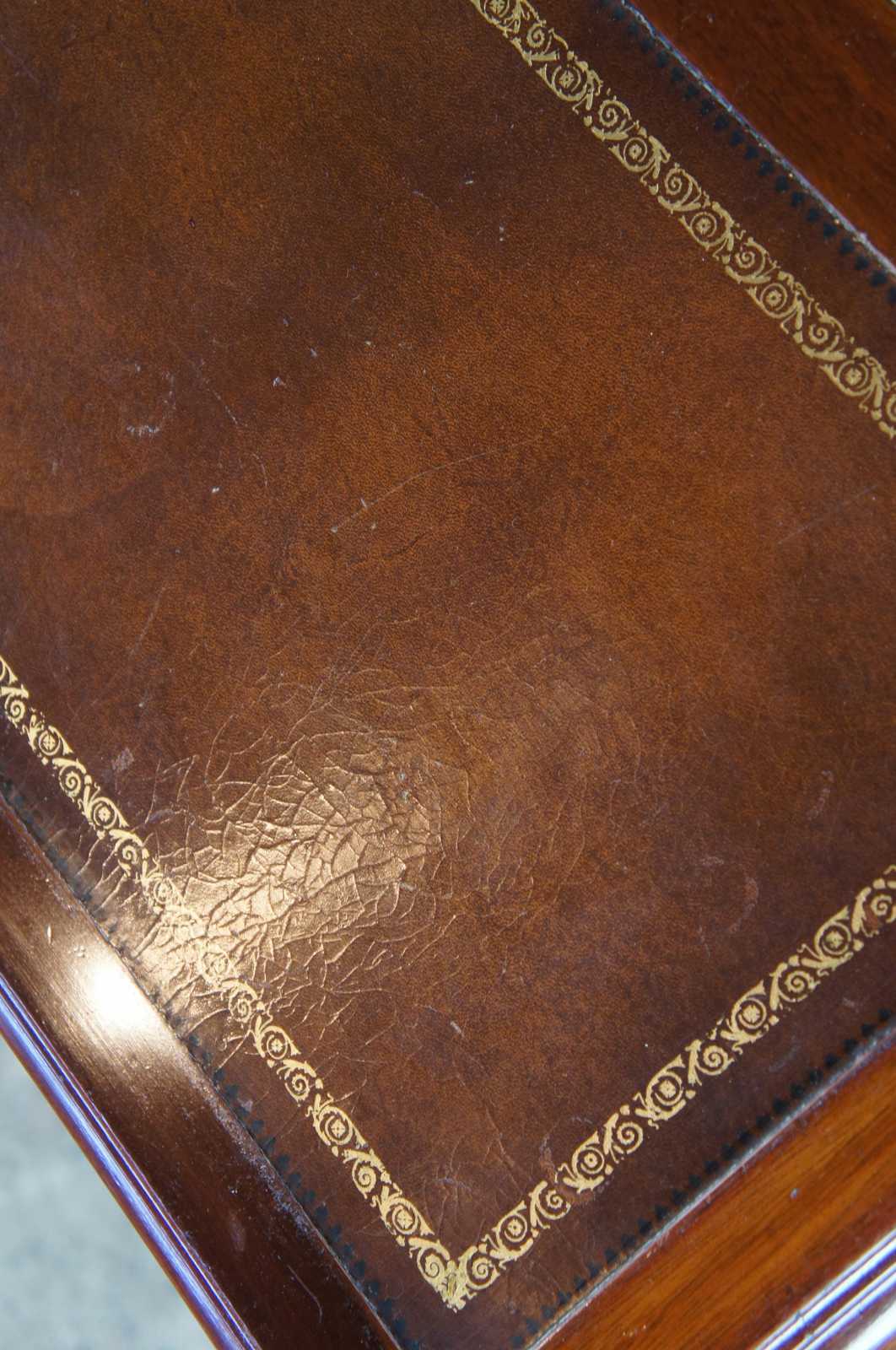 Mid century Sligh-Lowry desk. Made of mahogany featuring a tooled leather top and eight drawers.