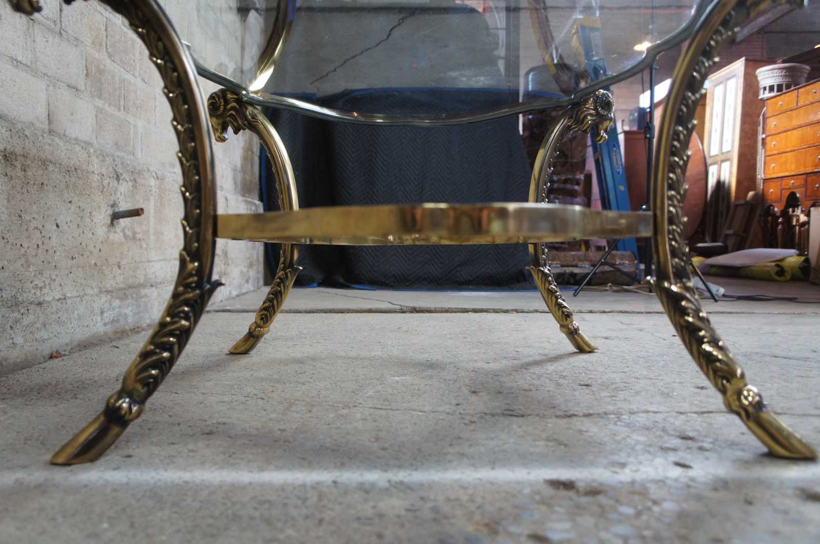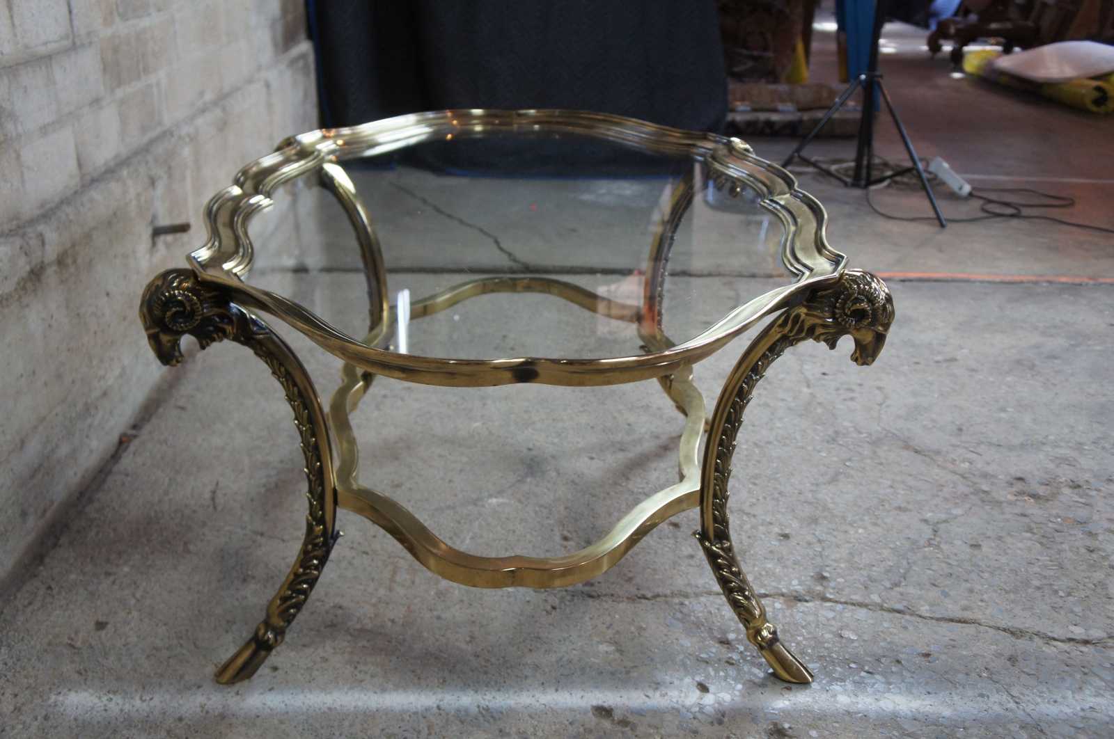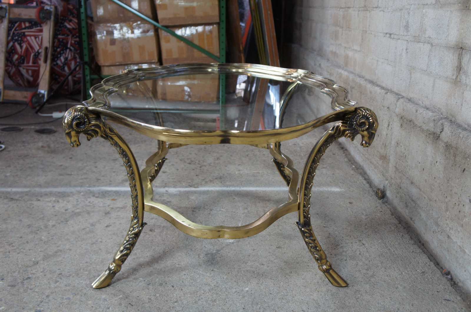 Solid brass sculptural rams head coffee table in Maison Charles and Hollywood Regency Style . Features scalloped edge border and intricately detailed rams head table feetering hoove feet.