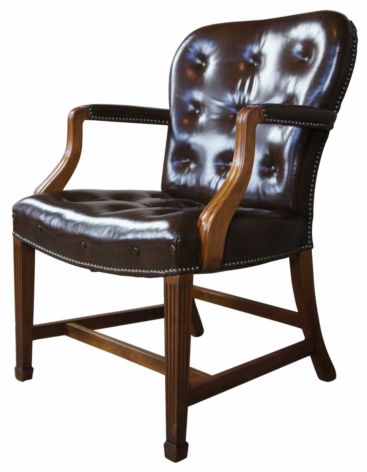 Mid Century walnut and brown leather arm chair. Features nailhead accent and tufting with square tapered and fluted legs.