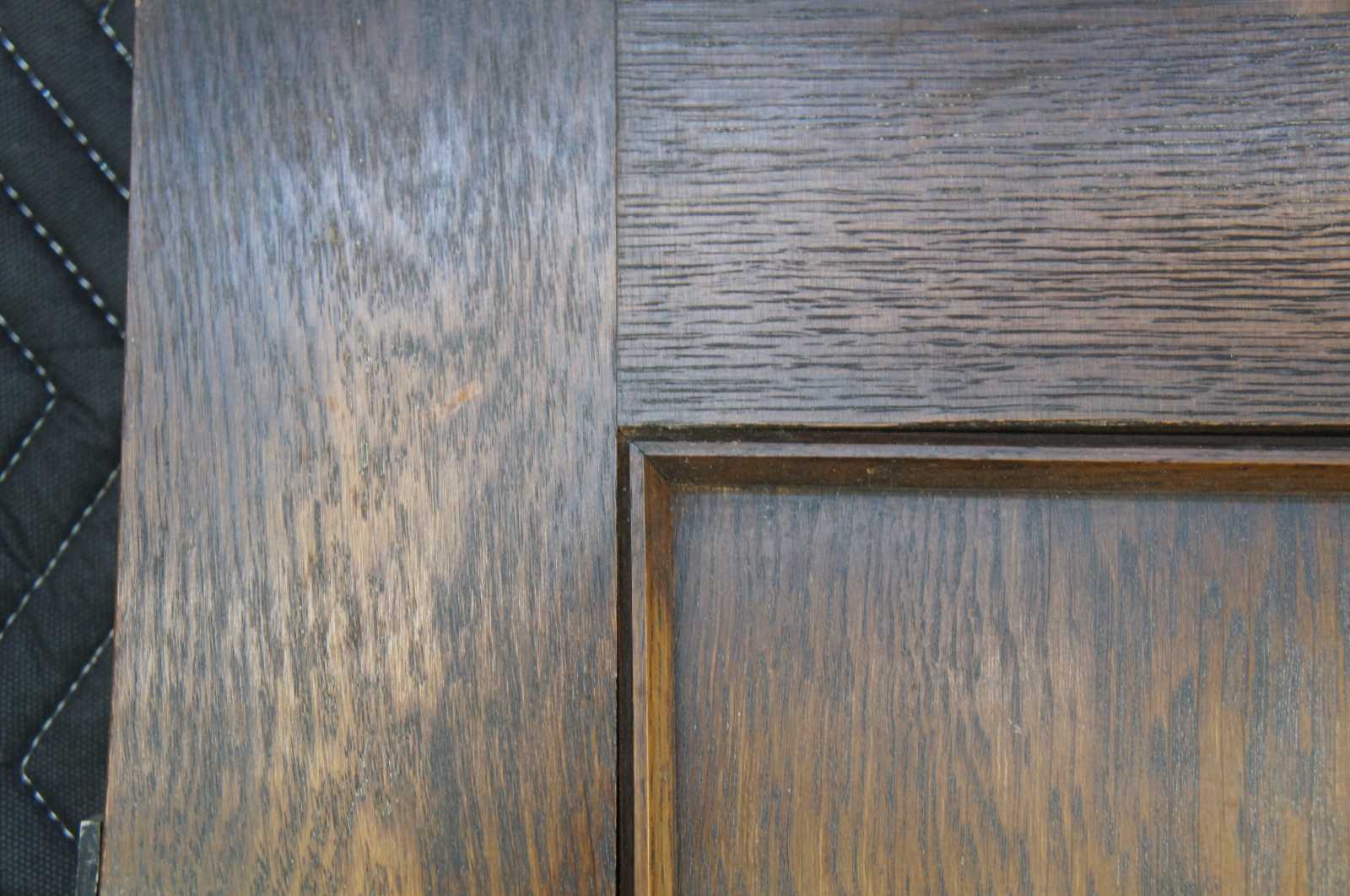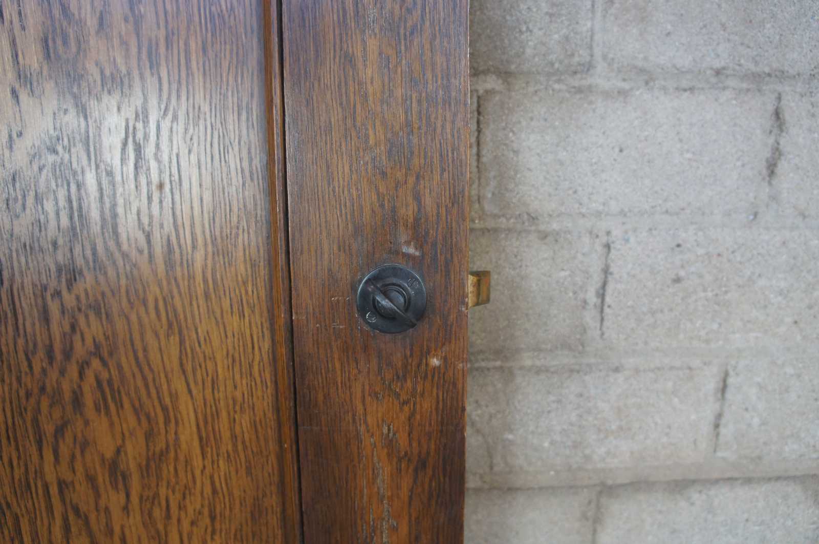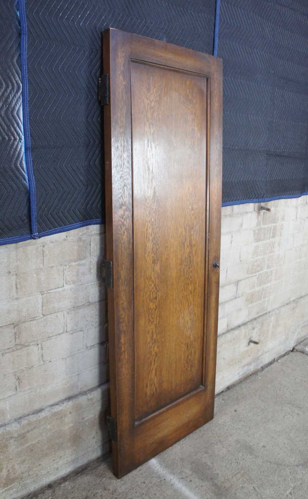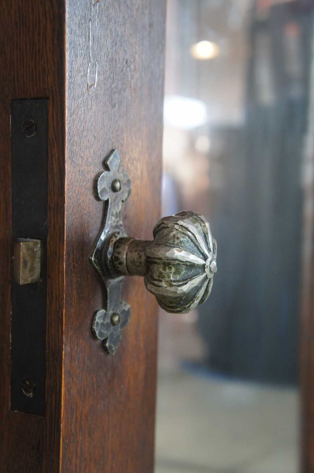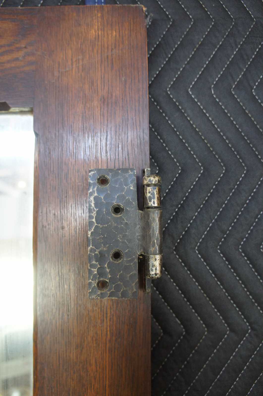 Early 20th century oak door. Features a large crental mirror and Spanish Revival hammered hardware. Reclaimed from one of the first homes built in Oakwood, Ohio by Harry I Schenck, circa early 1900s. Great for use as a dressing mirror. 5 Available