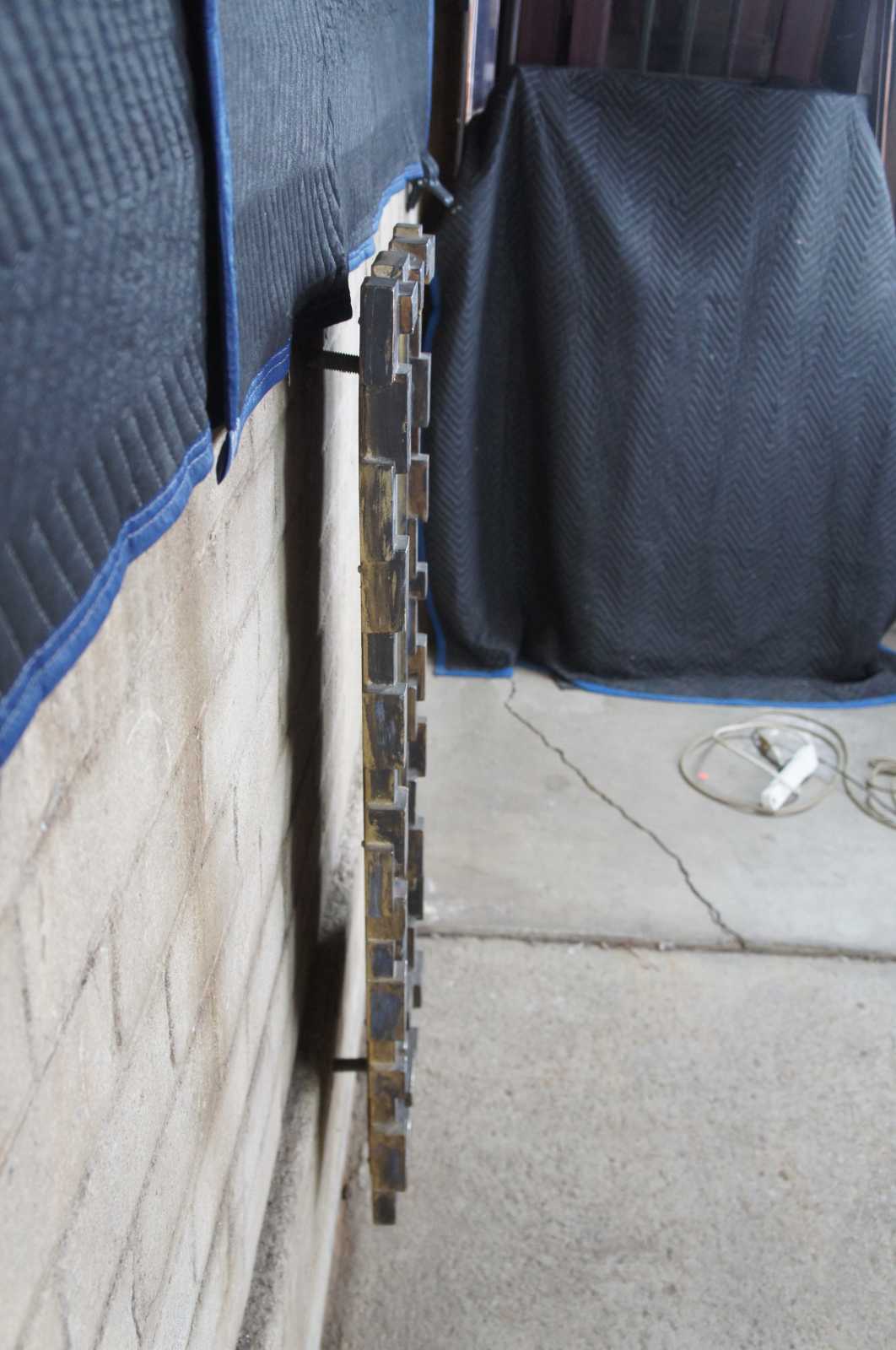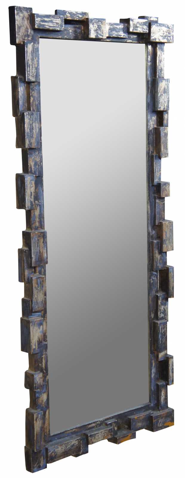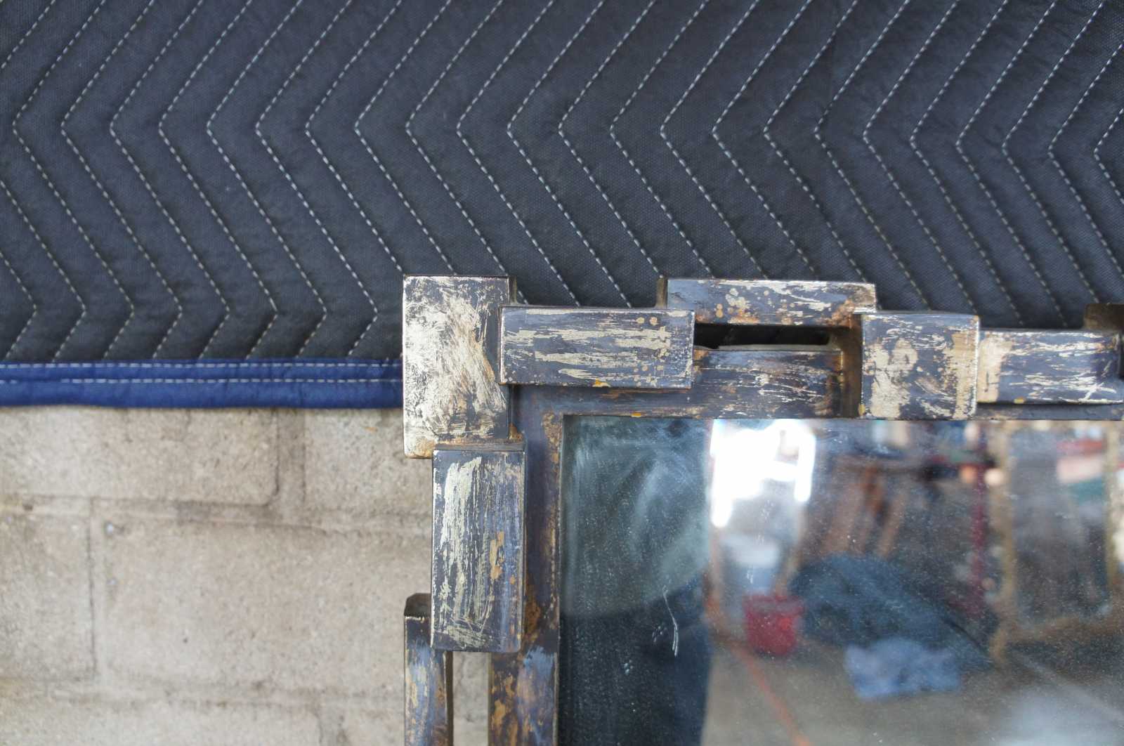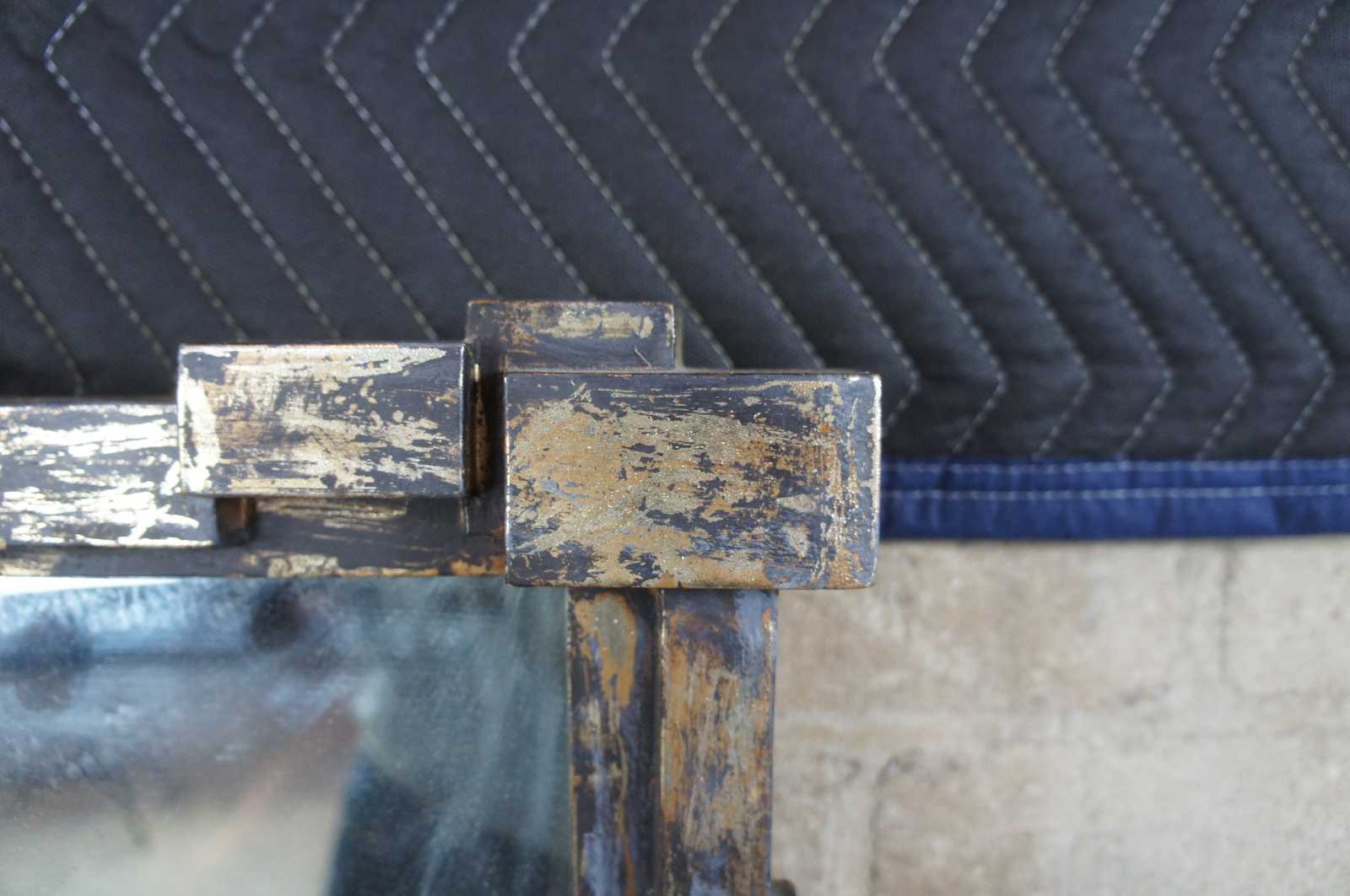 Brutalist inspired wall mirror. Features a black and gold distressed finish.