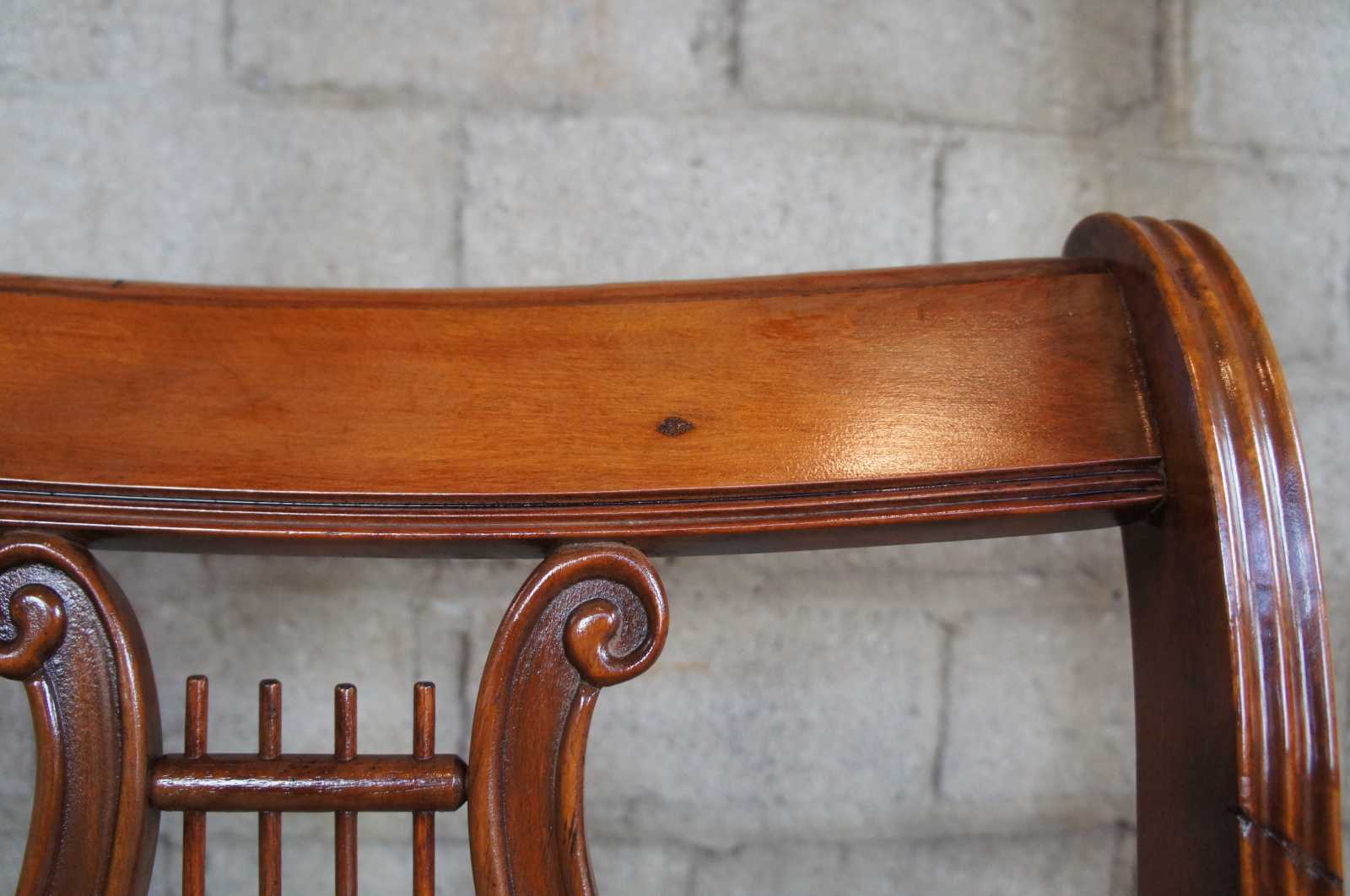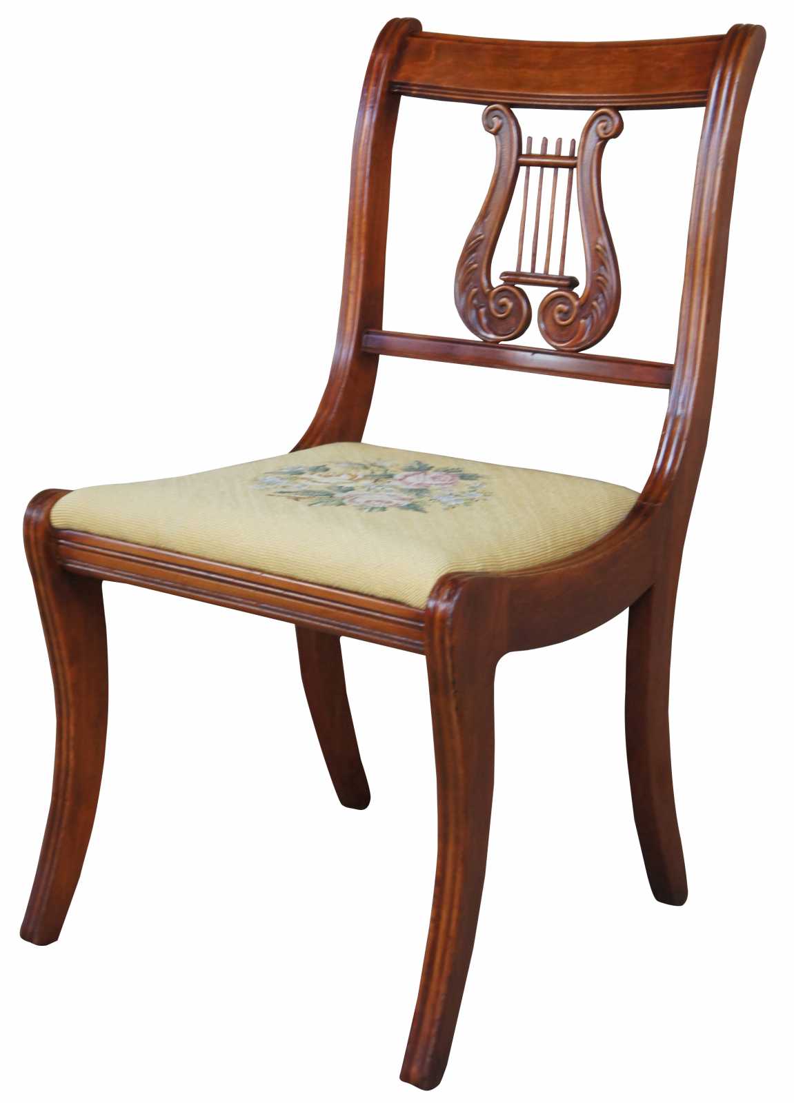 Pair of two antique R.H Macy & Co. side chairs. Circa 1900s. Made of cherry, featuring a yellow floral needlepoint embroidered seat and harp back.