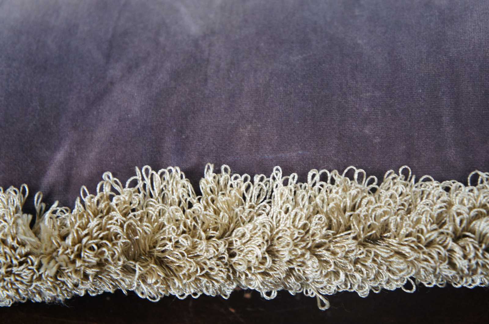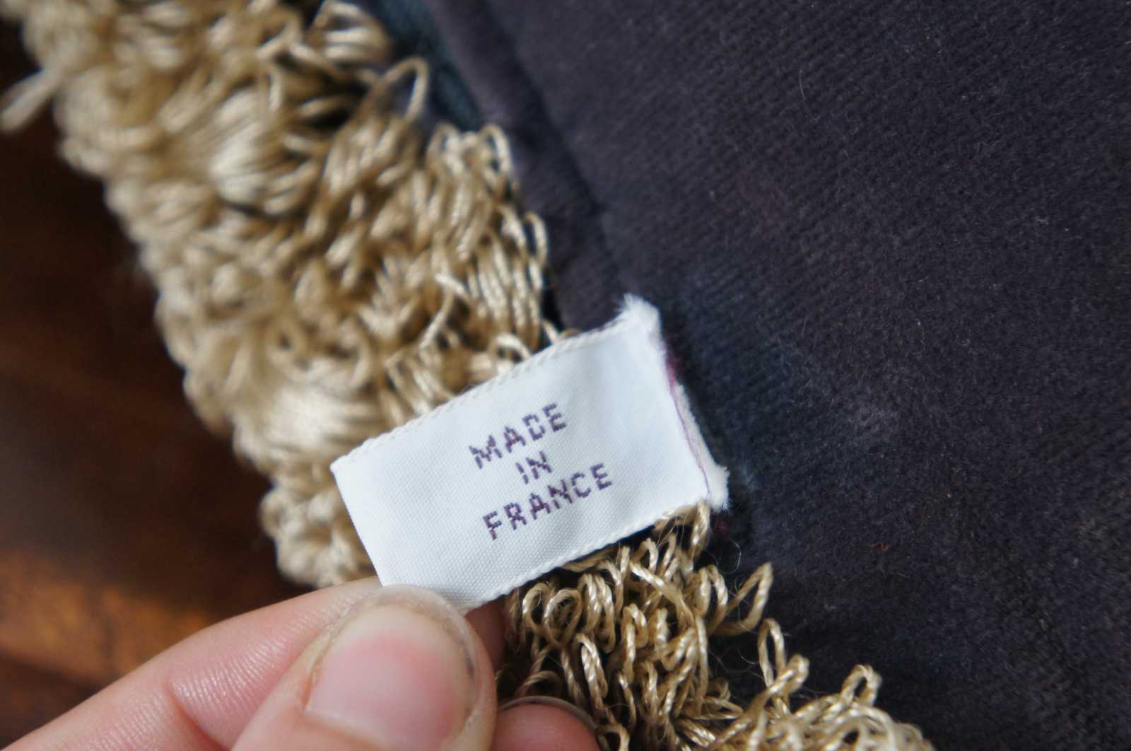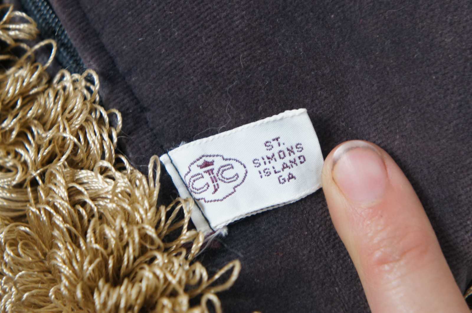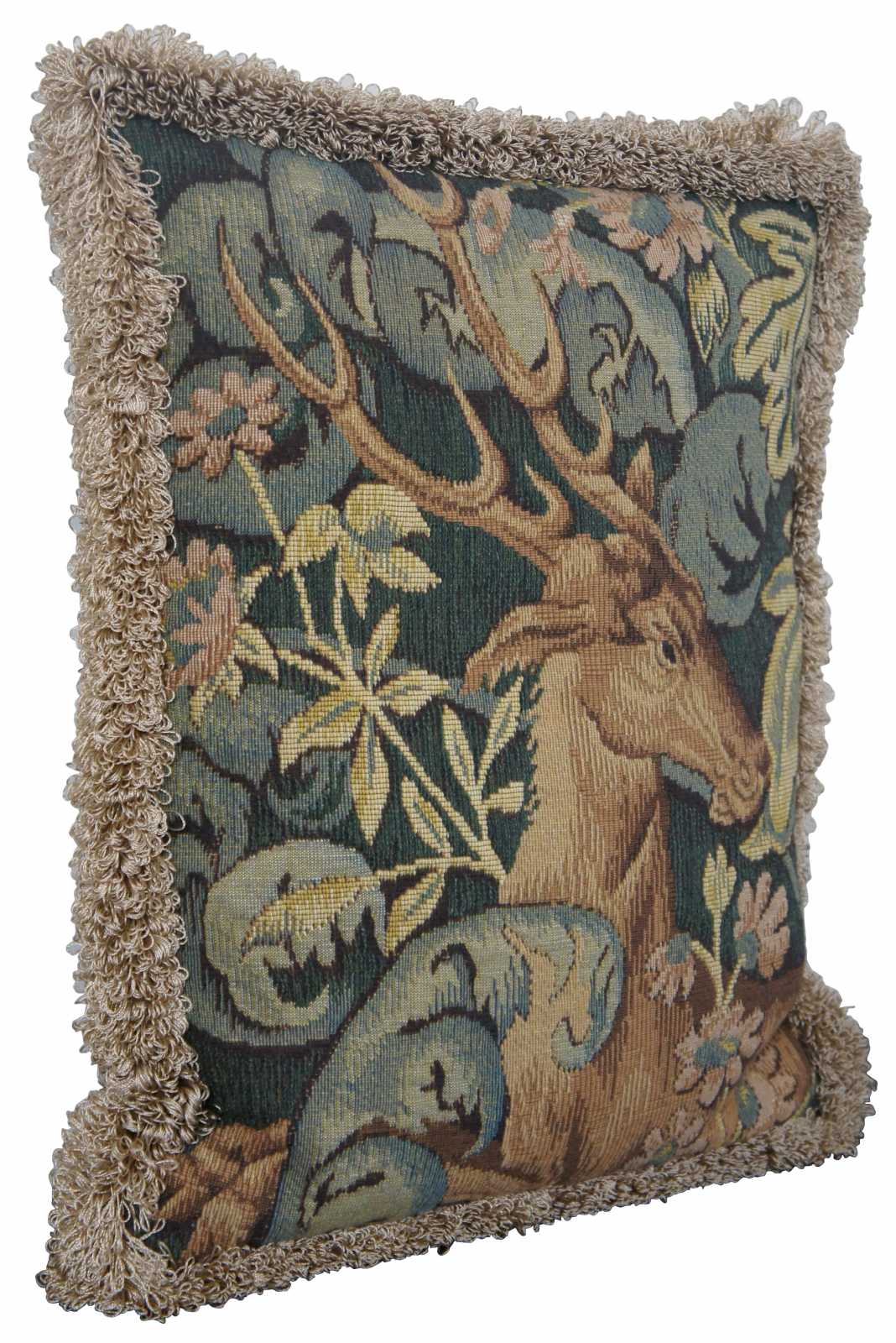 Medieval style, down filled, embroidered throw pillow with velour back and gold fringe, featuring a stag lying in a thicket of leaves, made in France for CJC of St Simons Island, GA.