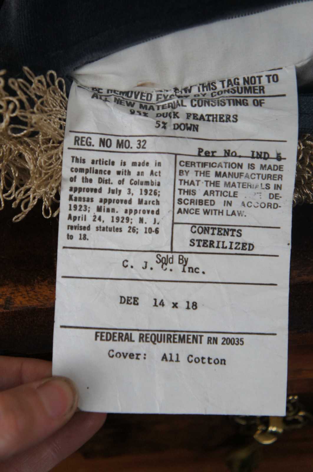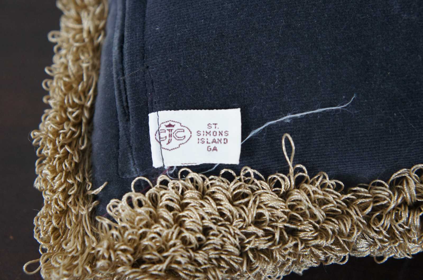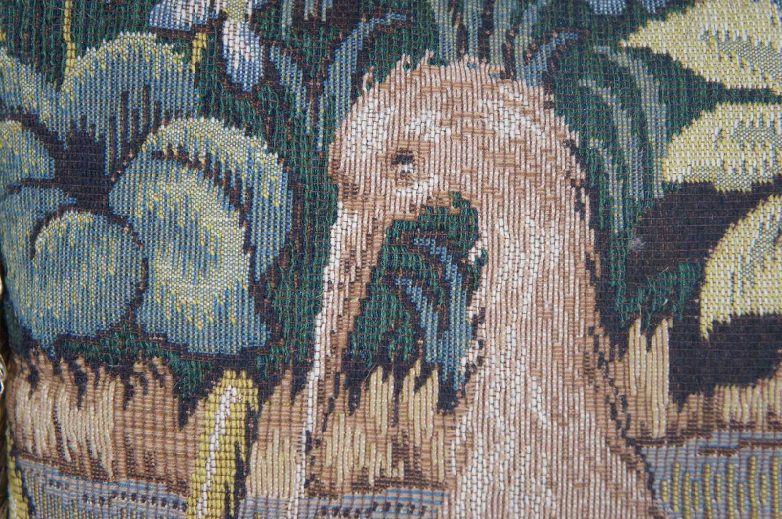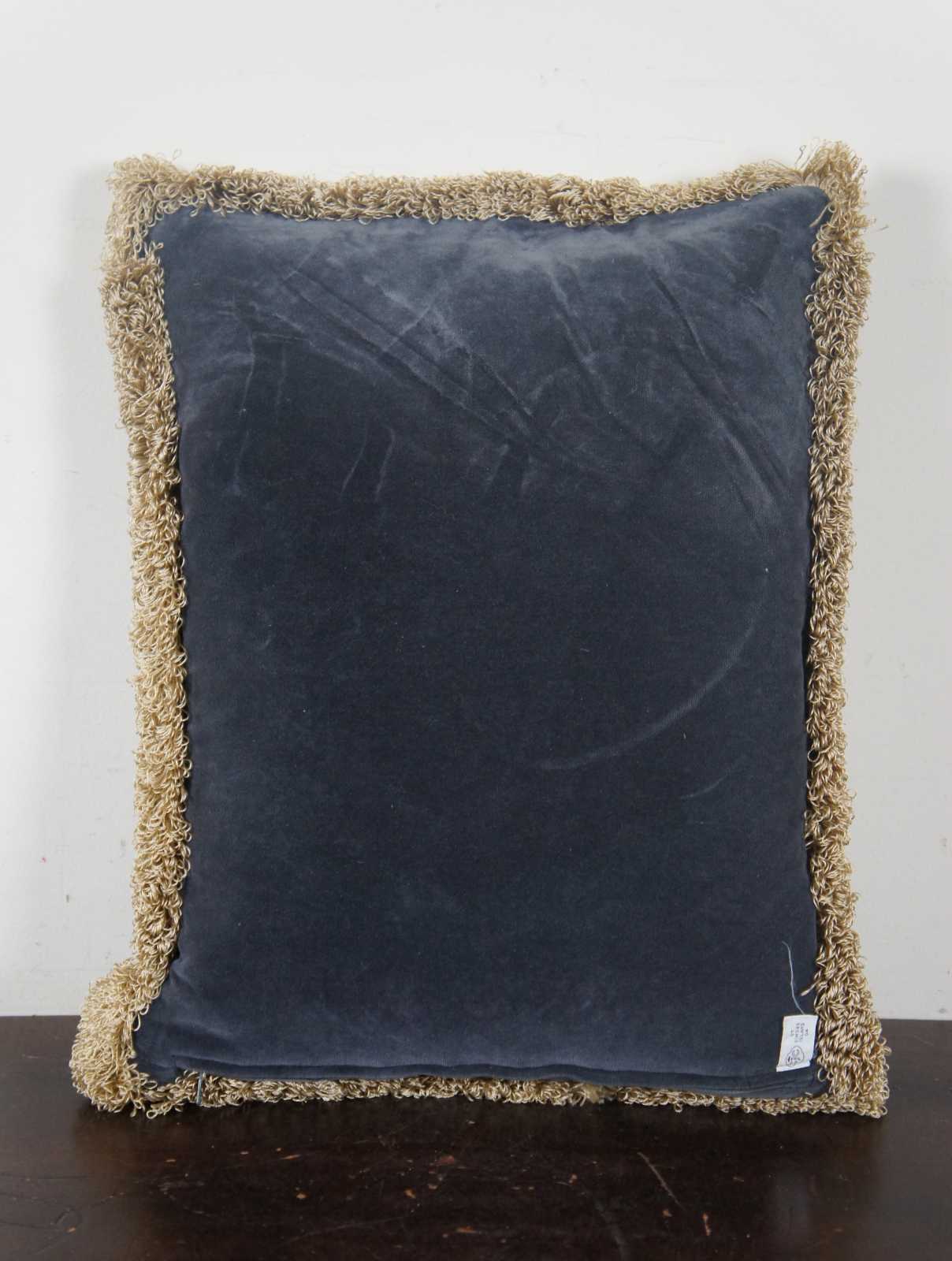 Medieval style, down filled, embroidered throw pillow with velour back and gold fringe, featuring a heron or crane at the edge of a lake with the capital letter A, made in France for CJC of St Simons Island, GA.