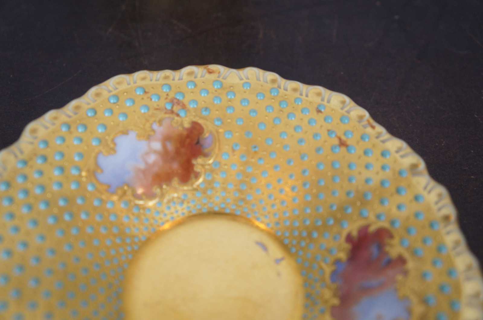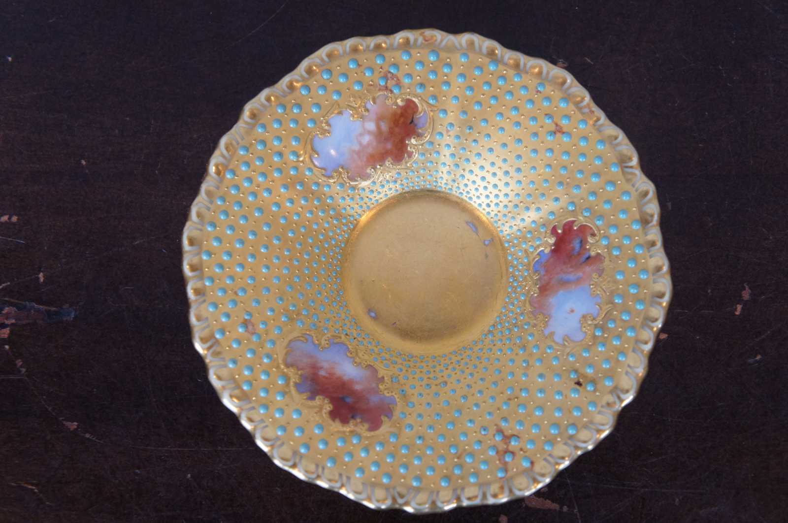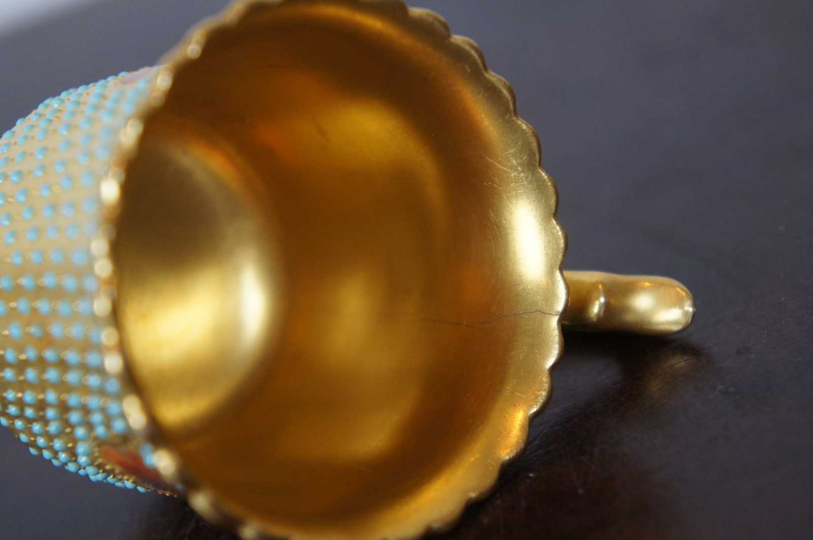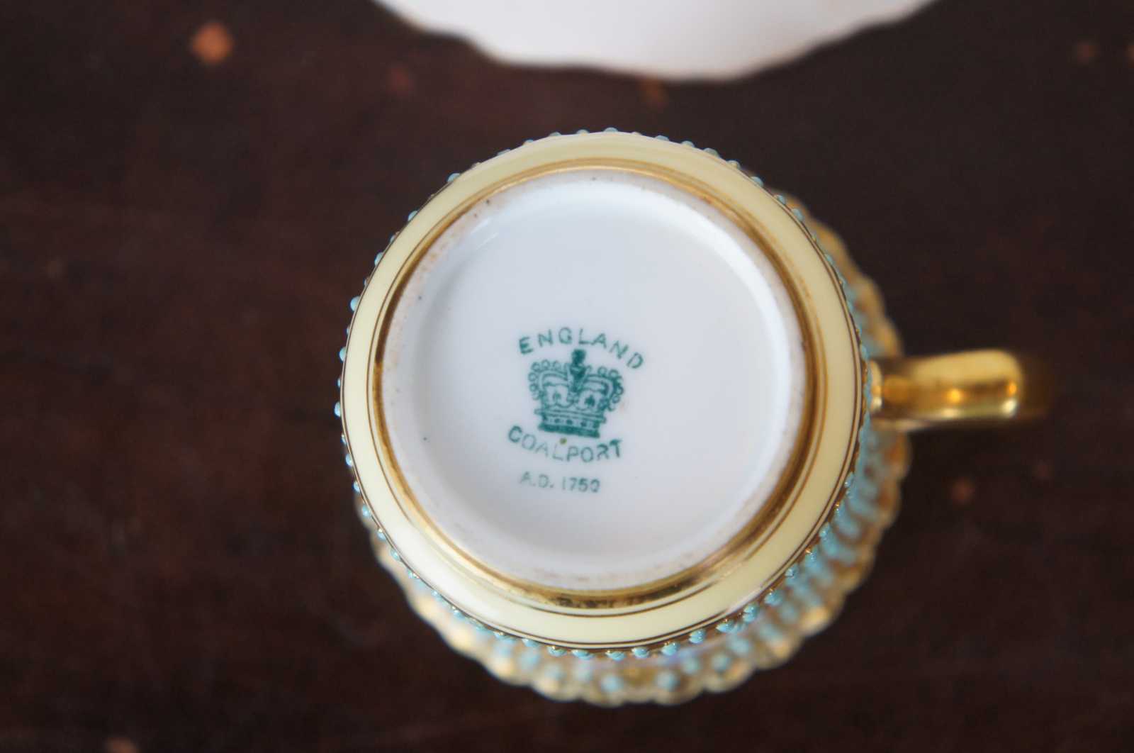 1891-1920 antique English Coalport demitasse tea / coffee cup and saucer. Features ornate hobnail and gold / turquoise hand painted overlay design. Marked England Coalport AD 1750 on backside of both pieces.