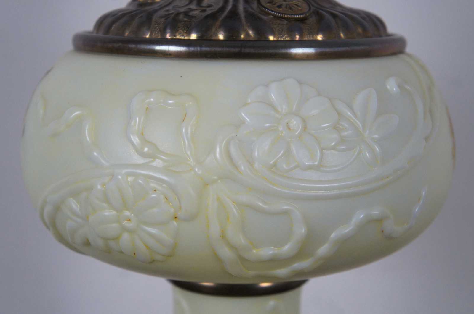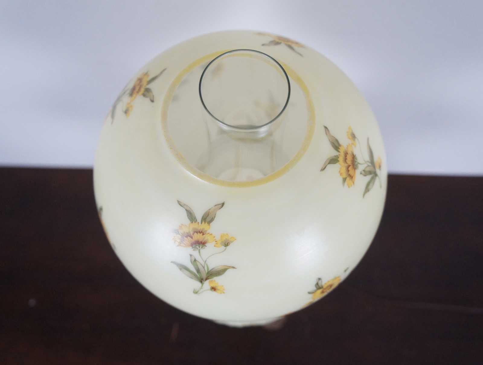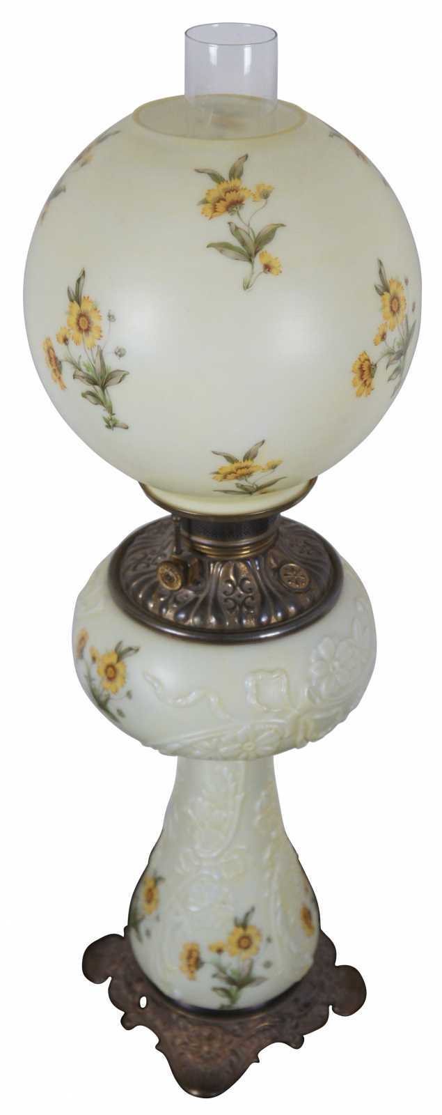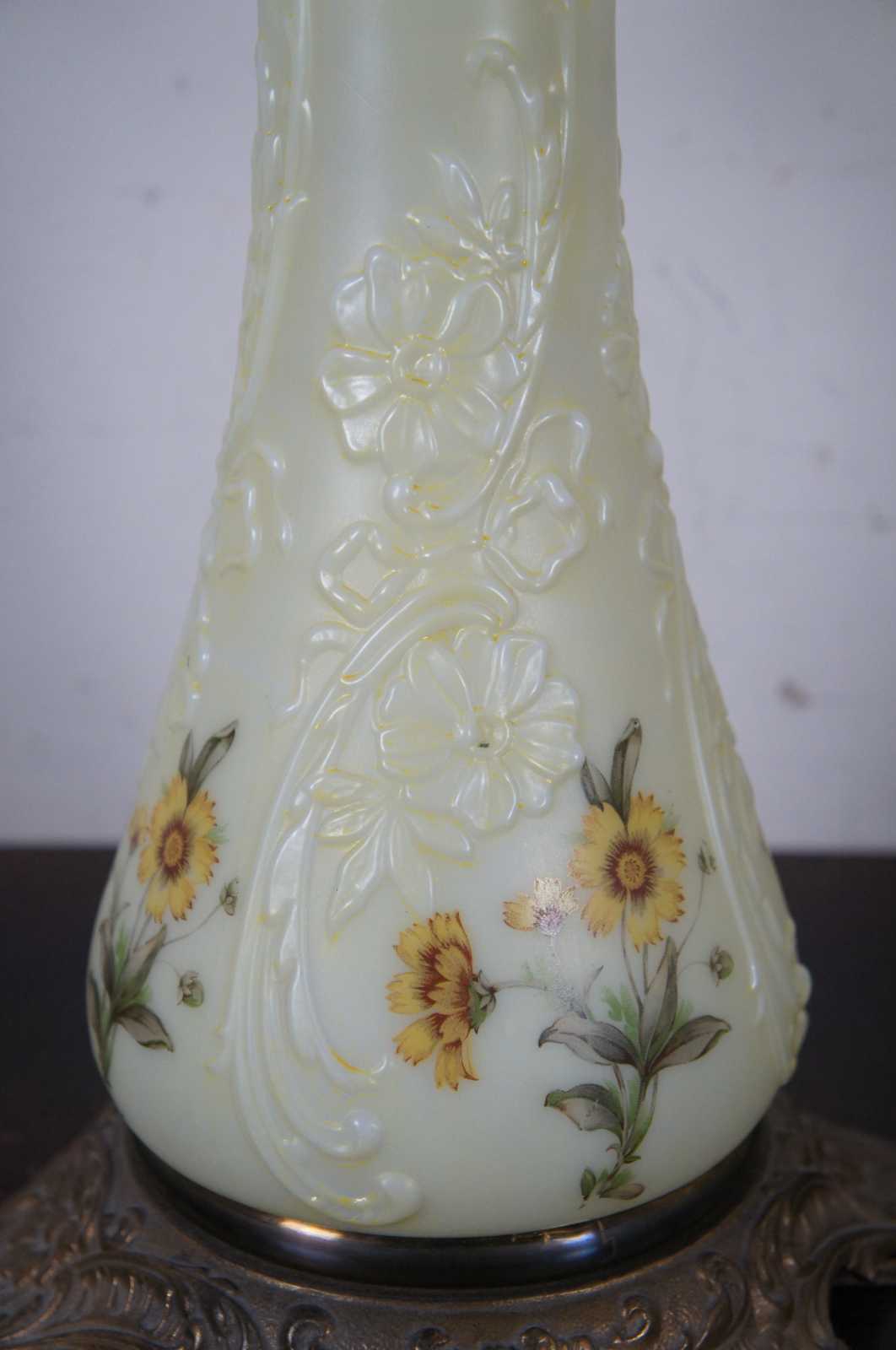 Antique converted/electrified Rayo oil lamp in yellow satin glass with raised floral shaped and printed buttercups. Illuminated in the base as well as the main socket on top.