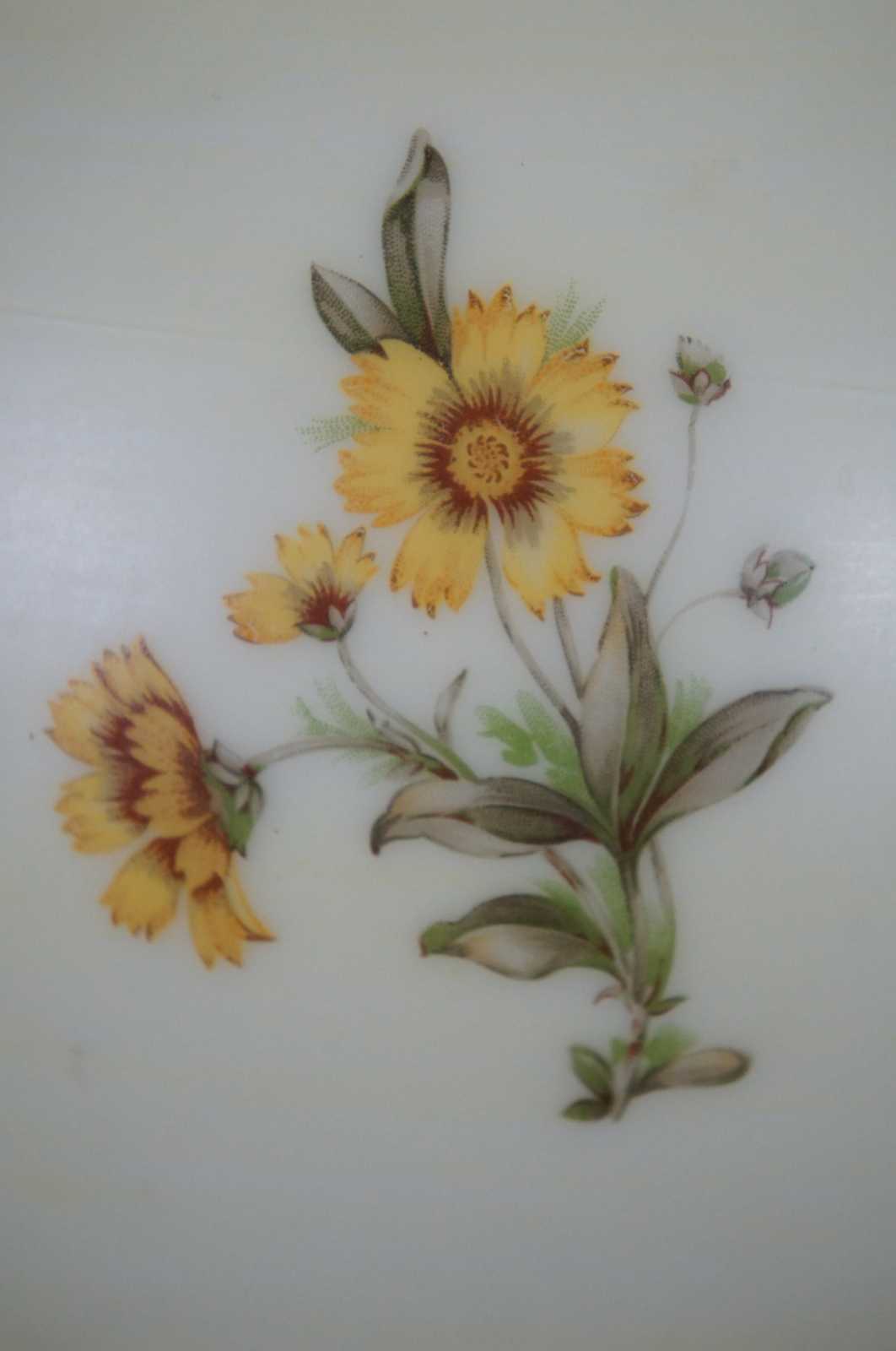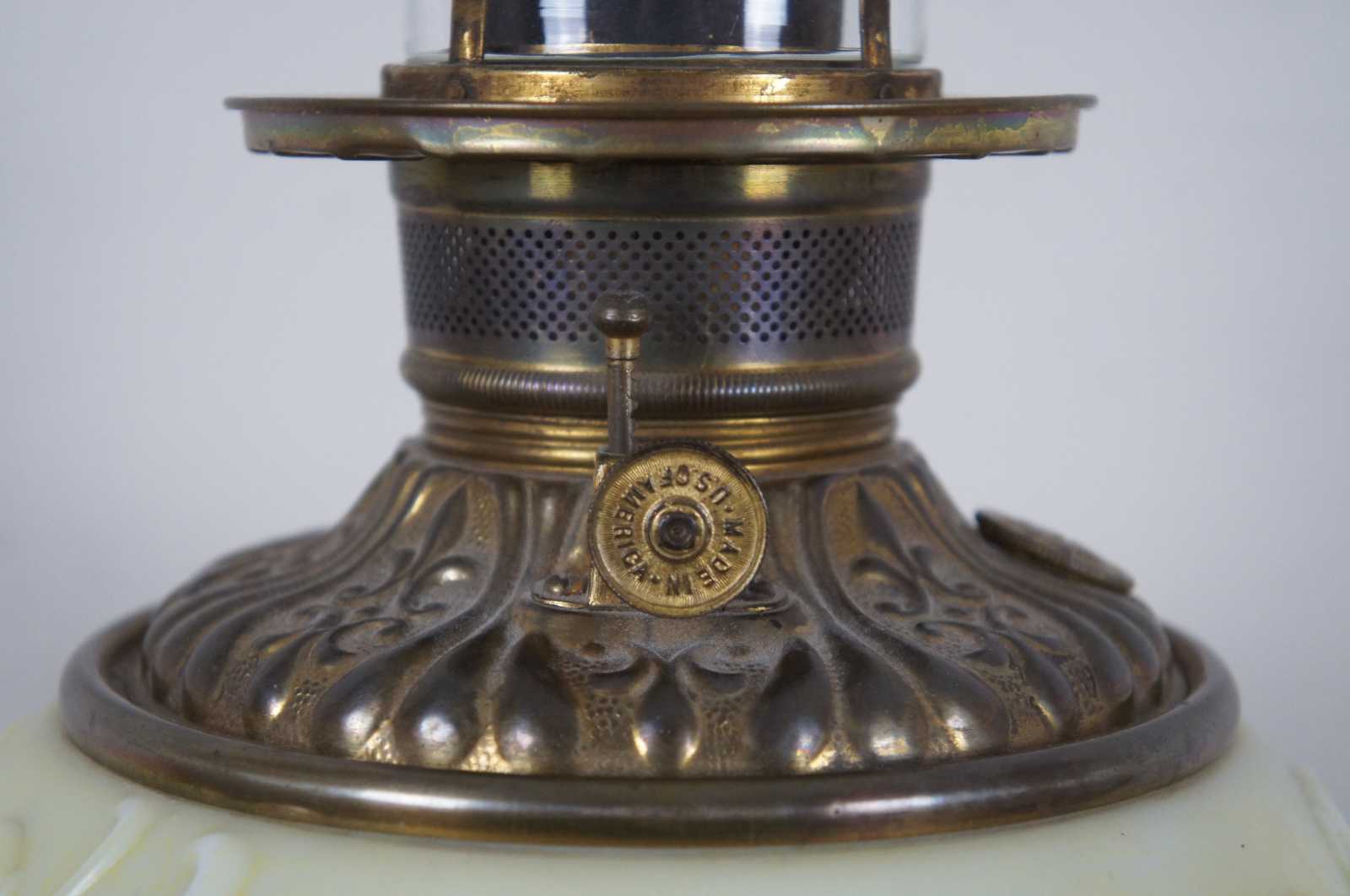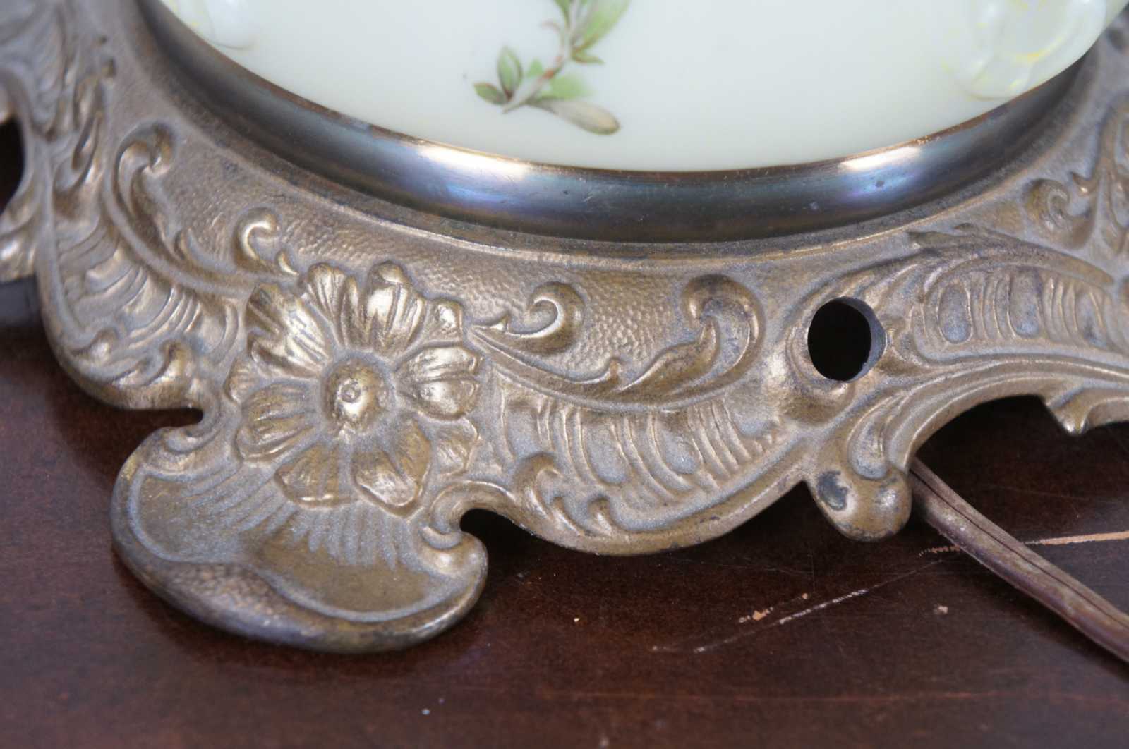 Antique converted/electrified Rayo oil lamp in yellow satin glass with raised floral shaped and printed buttercups. Illuminated in the base as well as the main socket on top.