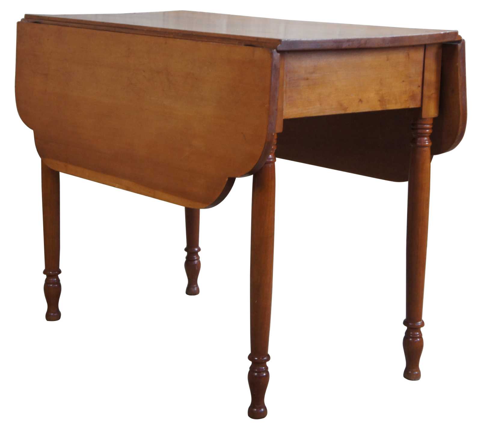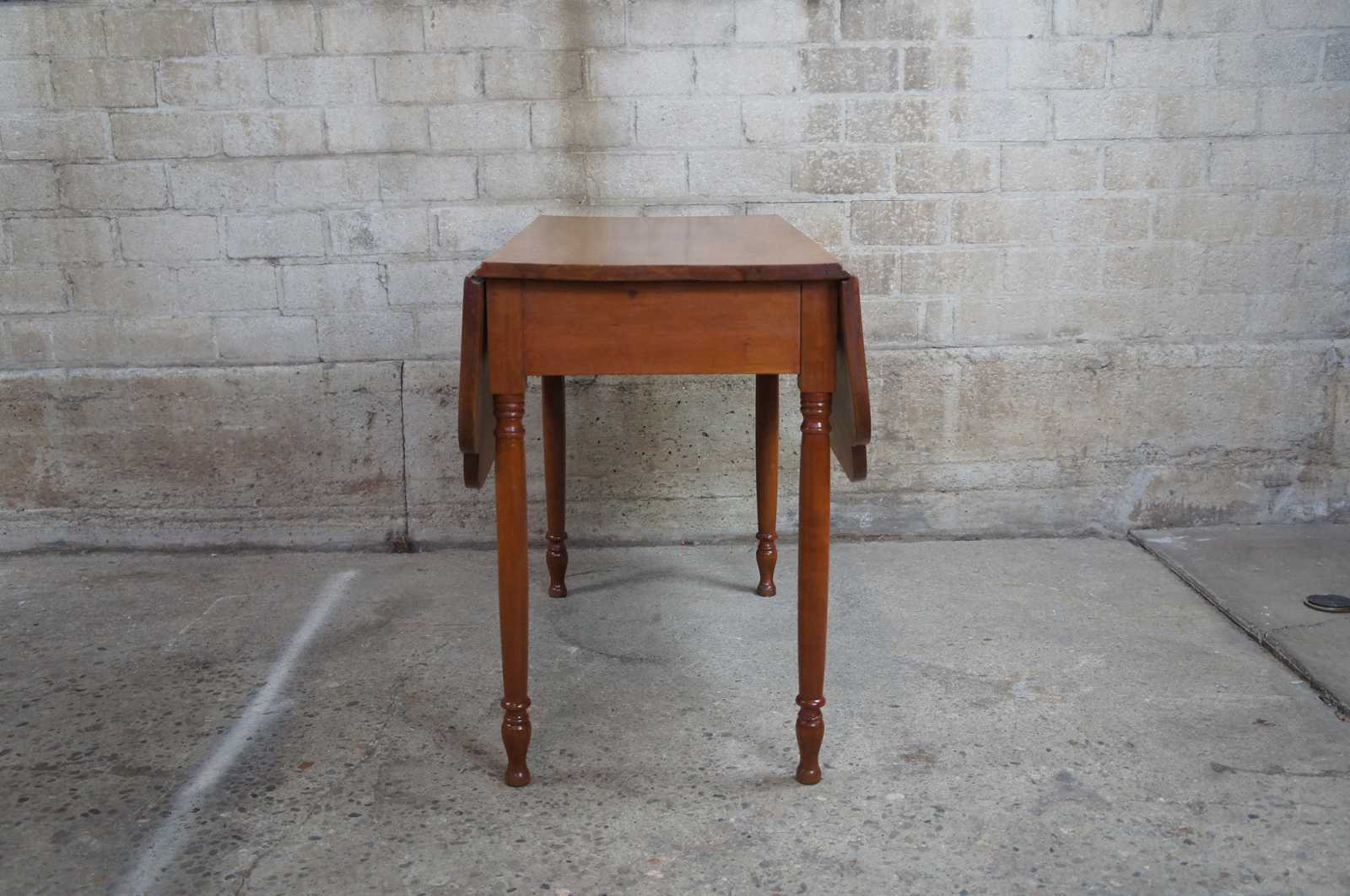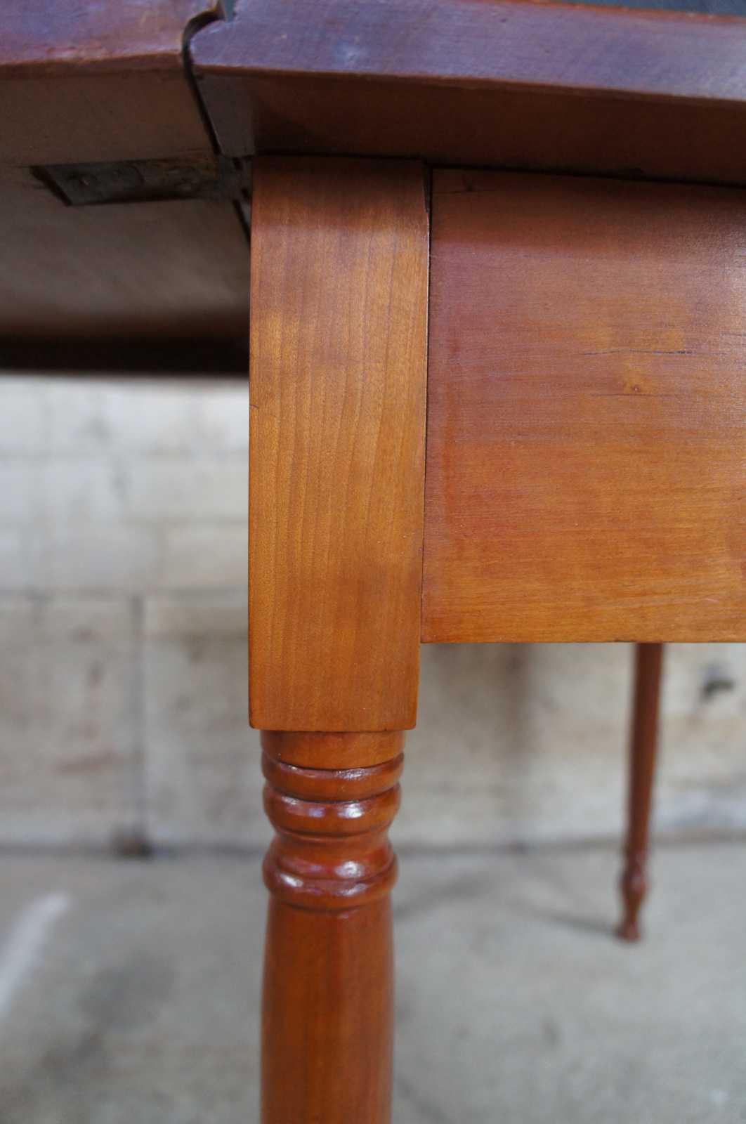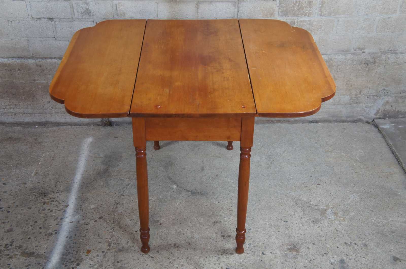 Late 19th century cherry drop leaf table. Features a uniquely shaped top over turned legs leading to bun feet.