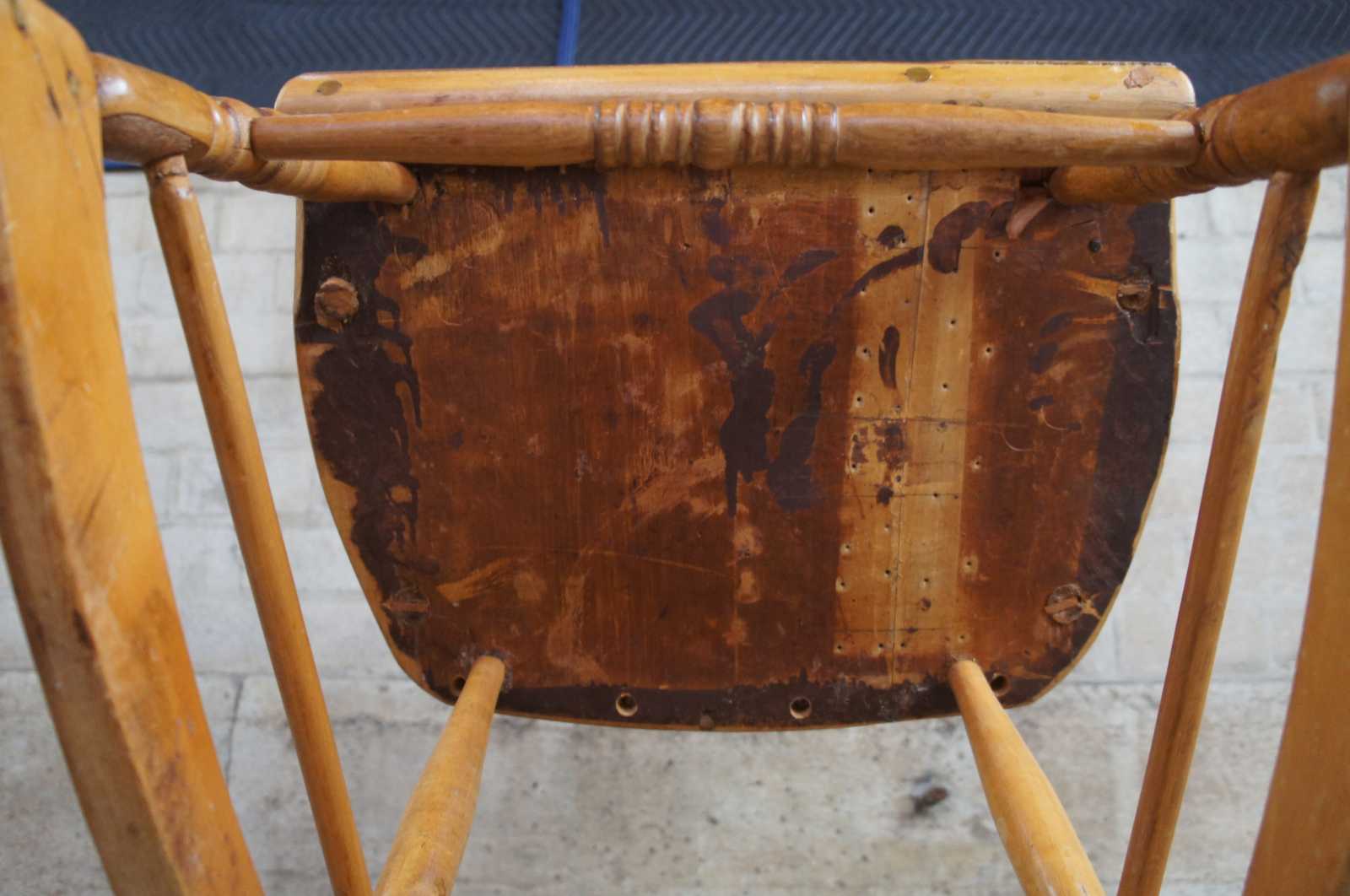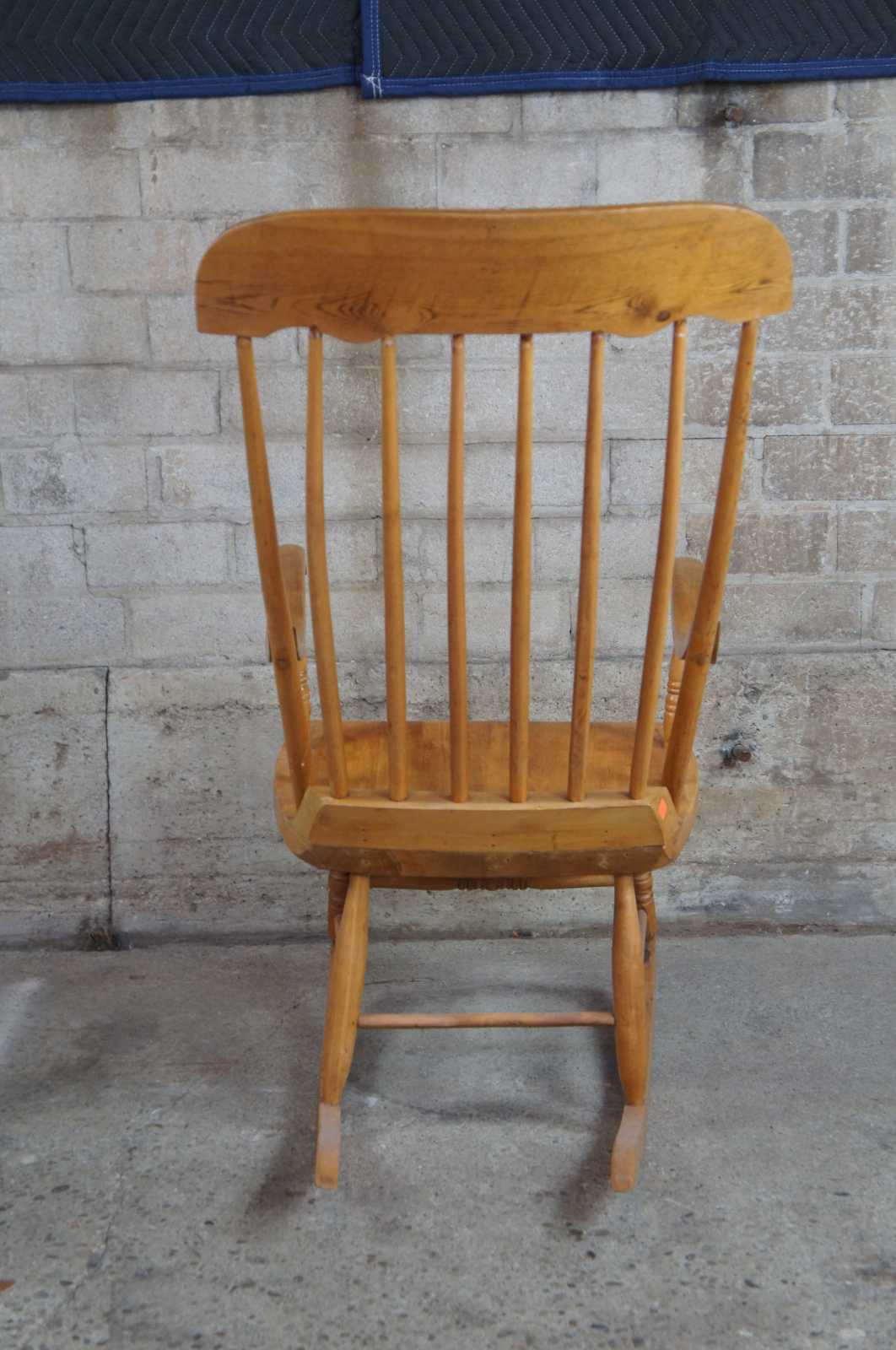 Antique artisinal or craftsman made windsor style rocking chair. Made from pine with a spindle back and contoured arms.