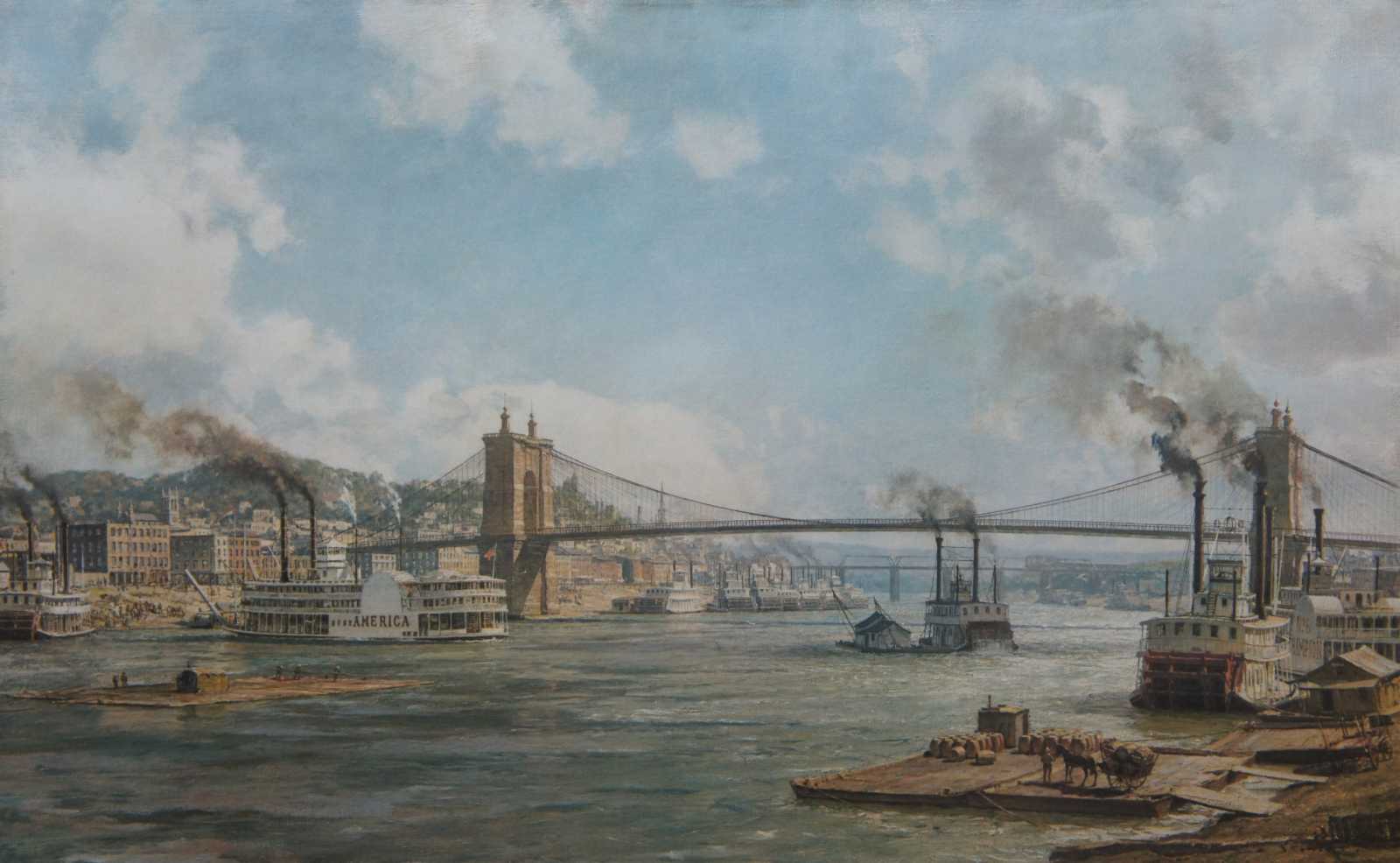 Pencil signed and numbered 311/750 framed lithograph print “Cincinnati – The Queen City of the West in 1876” by John Stobart. Print of a busy riverfront city with steamships and bustling riverside port. Published by the Maritime Heritage Prints, Copyright 1975. The lithograph features the text Church of the Immaculate Conception, St. Philemona Church, Sycamore St., The Landing, Newport KY, Suspension bridge, Covington Ky Waterfront et al.