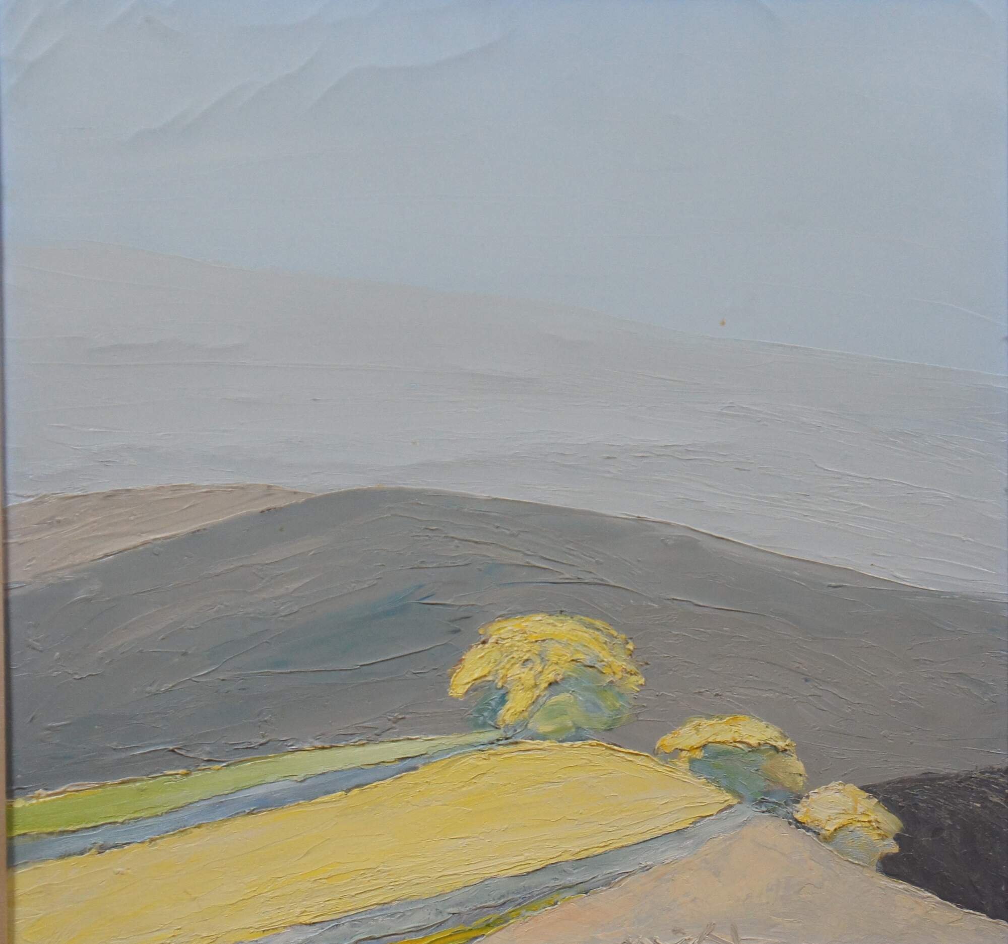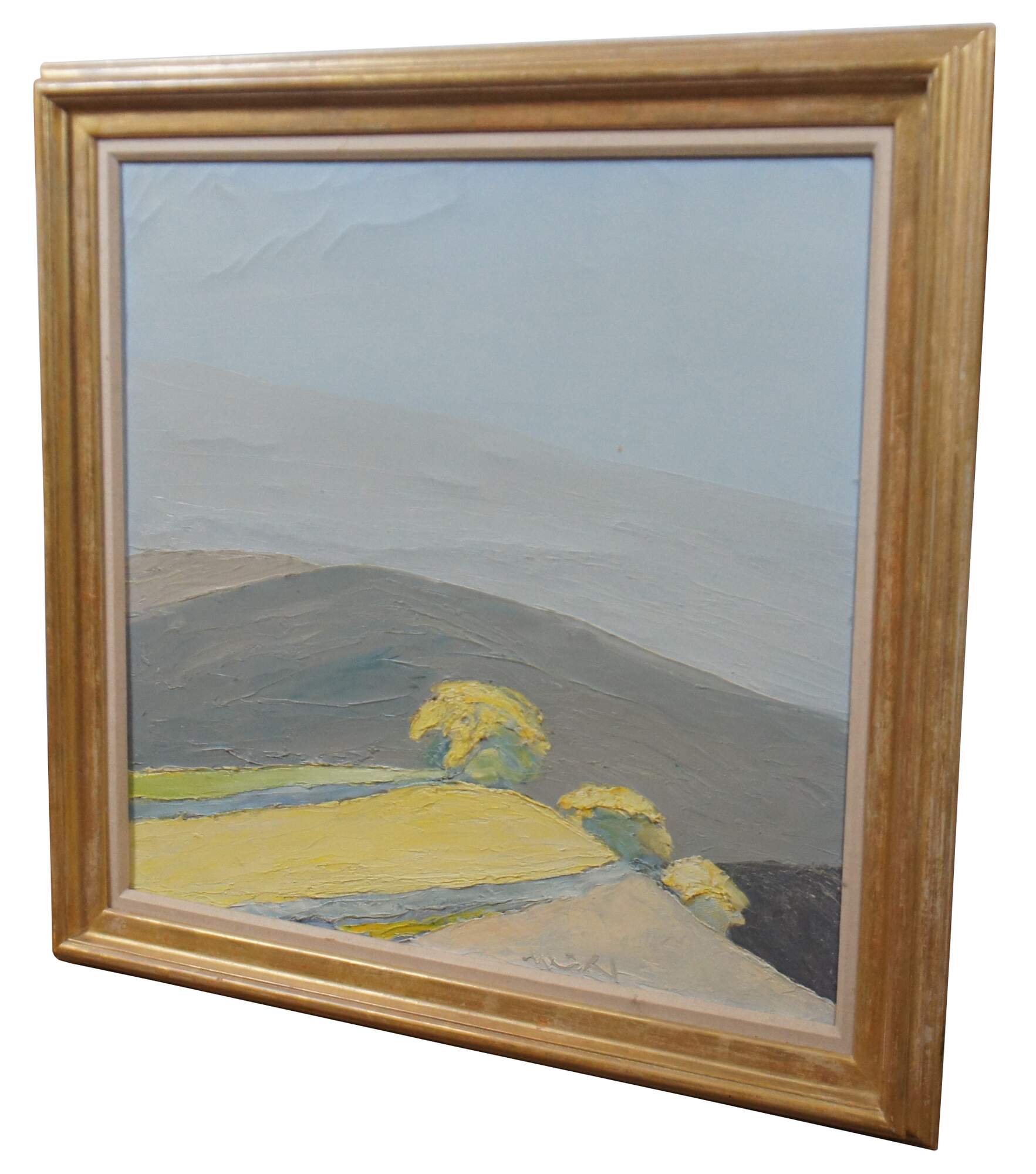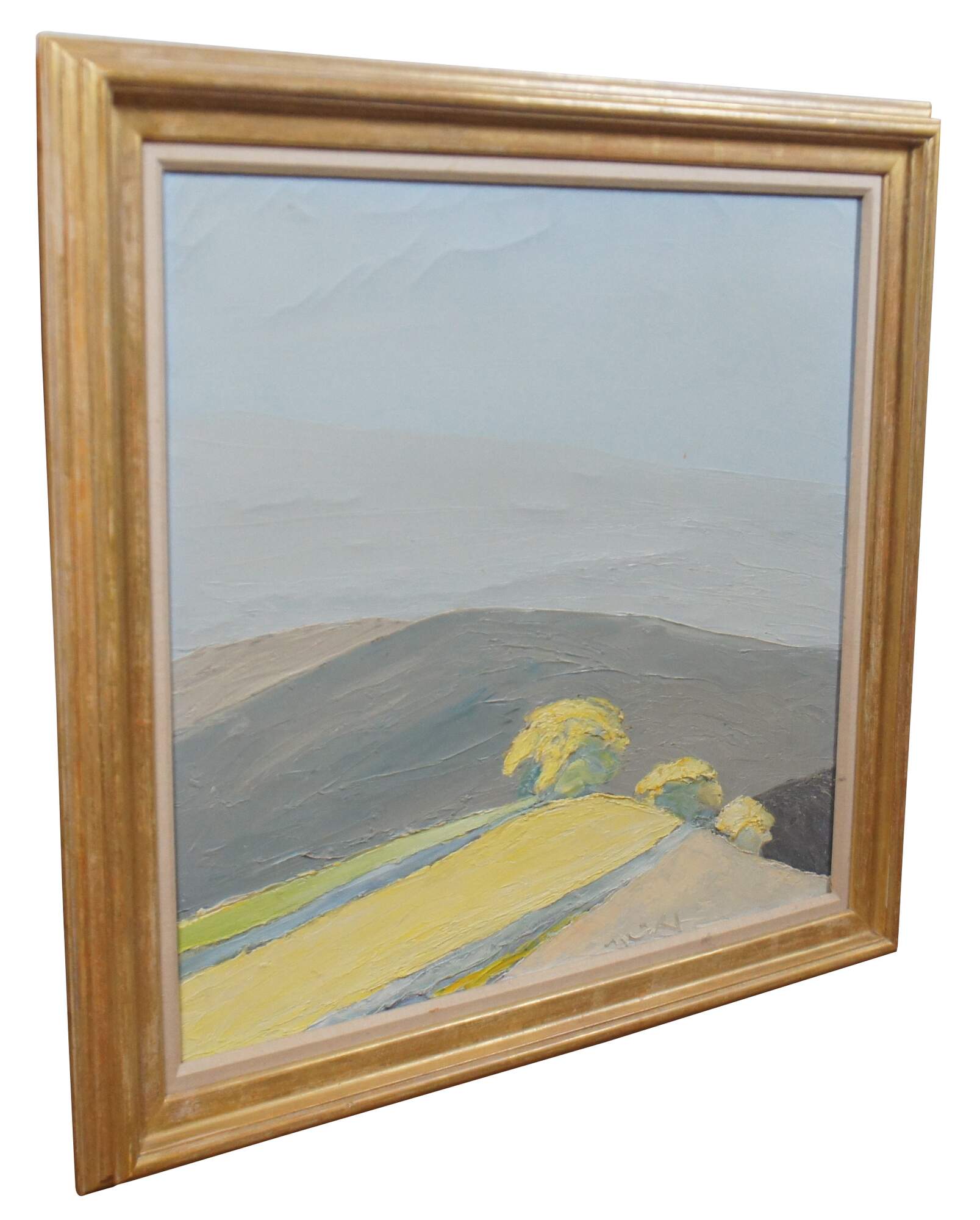 Vintage original impressionist oil on canvas landscape painting titled “Automne” (Autumn/Fall) by Roger Muhl, featuring a hazy landscape of hills with a golden field and trees in the foreground. “Roger Mühl , born 20 December 1929 in Strasbourg , died 4 April 2008 in Mougins, was a painter , draftsman and sculptor French. He joined the National School of Decorative Arts in Strasbourg where he graduated in 1948 to go to the territory of Belfort. He settled in 1954 in Montreux-Chateau and had his first exhibition in Paris at the Galerie de Paris in 1960. Then he went to Geneva, London, Milan, Dallas, Cologne, Stuttgart, Tokyo, Kyoto, Belfort and New York . He basically worked on the French Riviera.