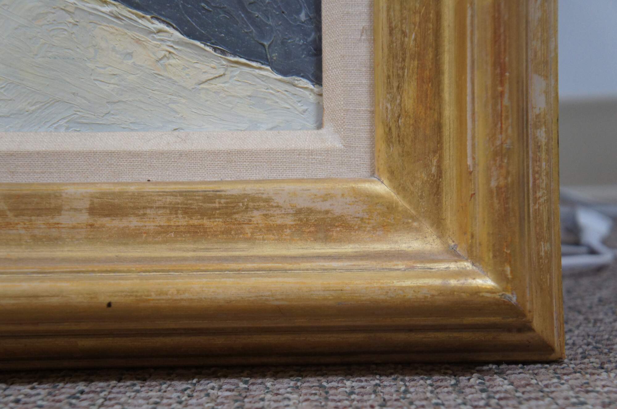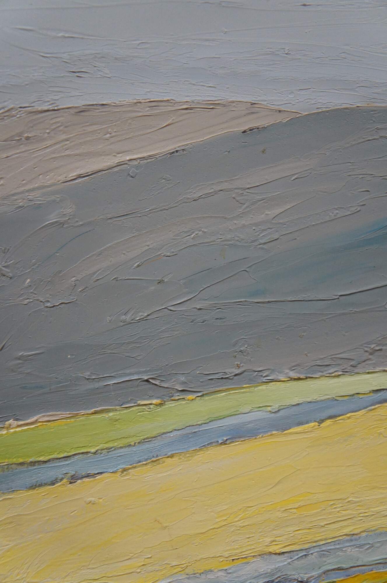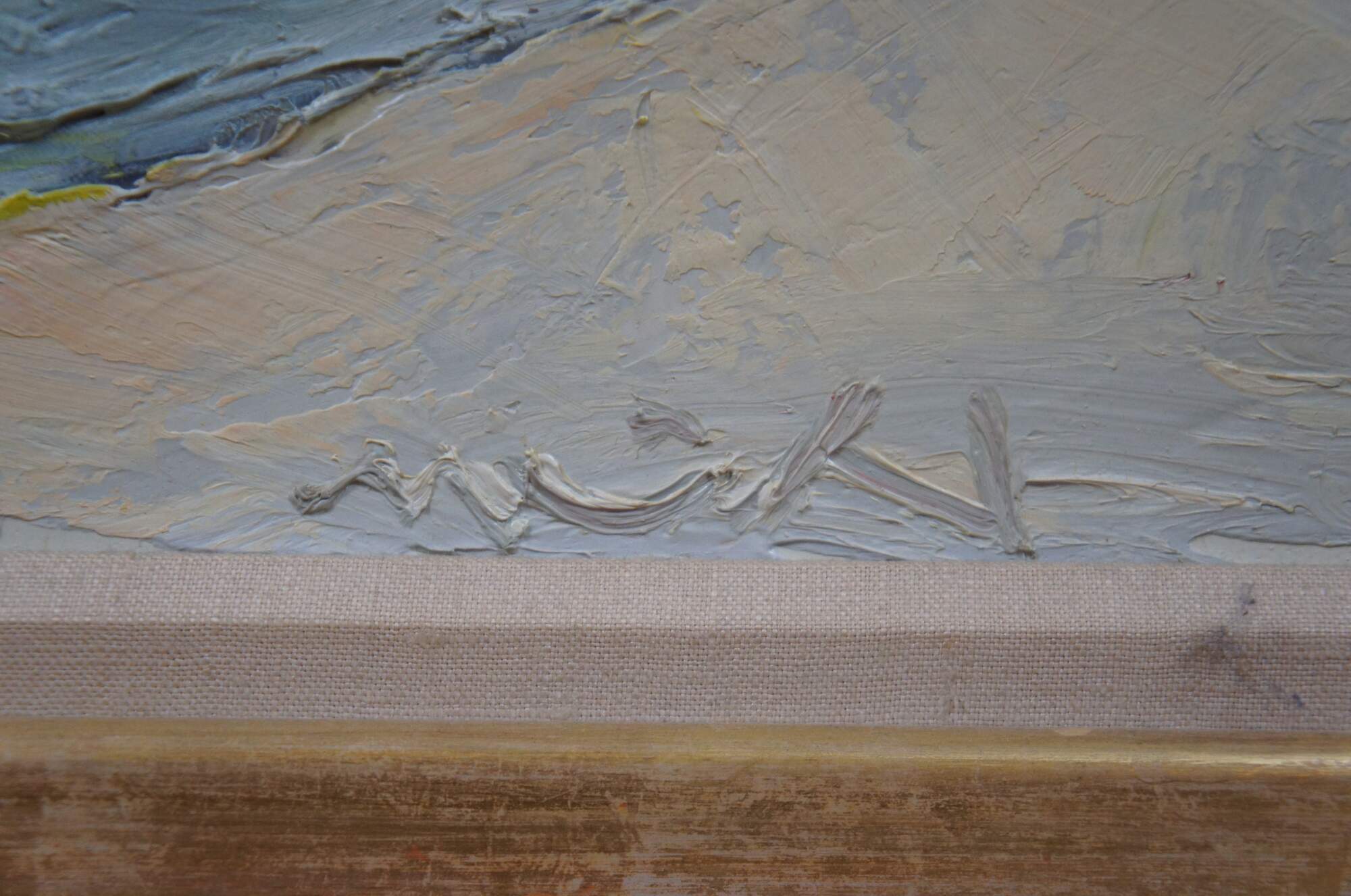 Vintage original impressionist oil on canvas landscape painting titled “Automne” (Autumn/Fall) by Roger Muhl, featuring a hazy landscape of hills with a golden field and trees in the foreground. “Roger Mühl , born 20 December 1929 in Strasbourg , died 4 April 2008 in Mougins, was a painter , draftsman and sculptor French. He joined the National School of Decorative Arts in Strasbourg where he graduated in 1948 to go to the territory of Belfort. He settled in 1954 in Montreux-Chateau and had his first exhibition in Paris at the Galerie de Paris in 1960. Then he went to Geneva, London, Milan, Dallas, Cologne, Stuttgart, Tokyo, Kyoto, Belfort and New York . He basically worked on the French Riviera.