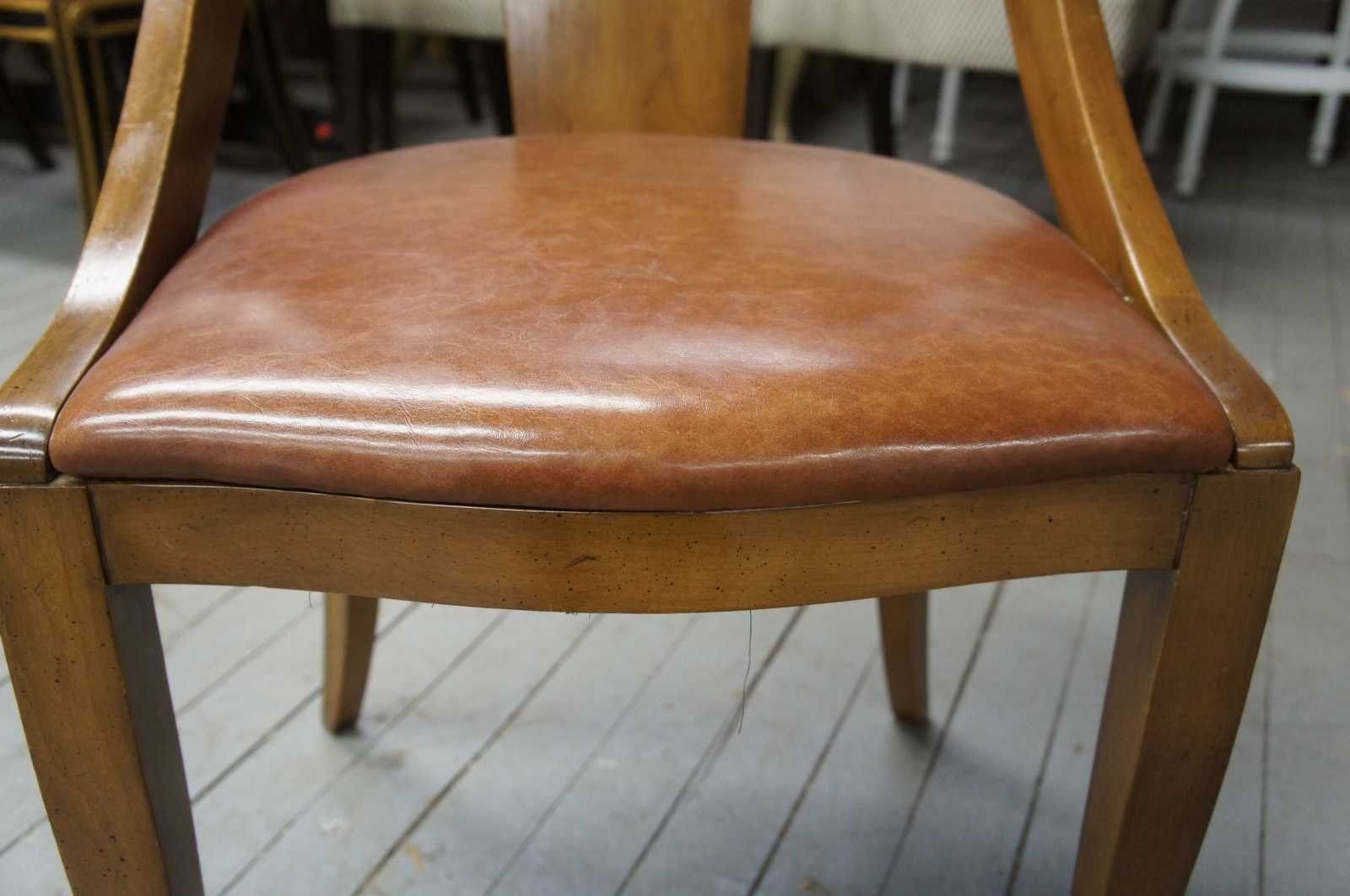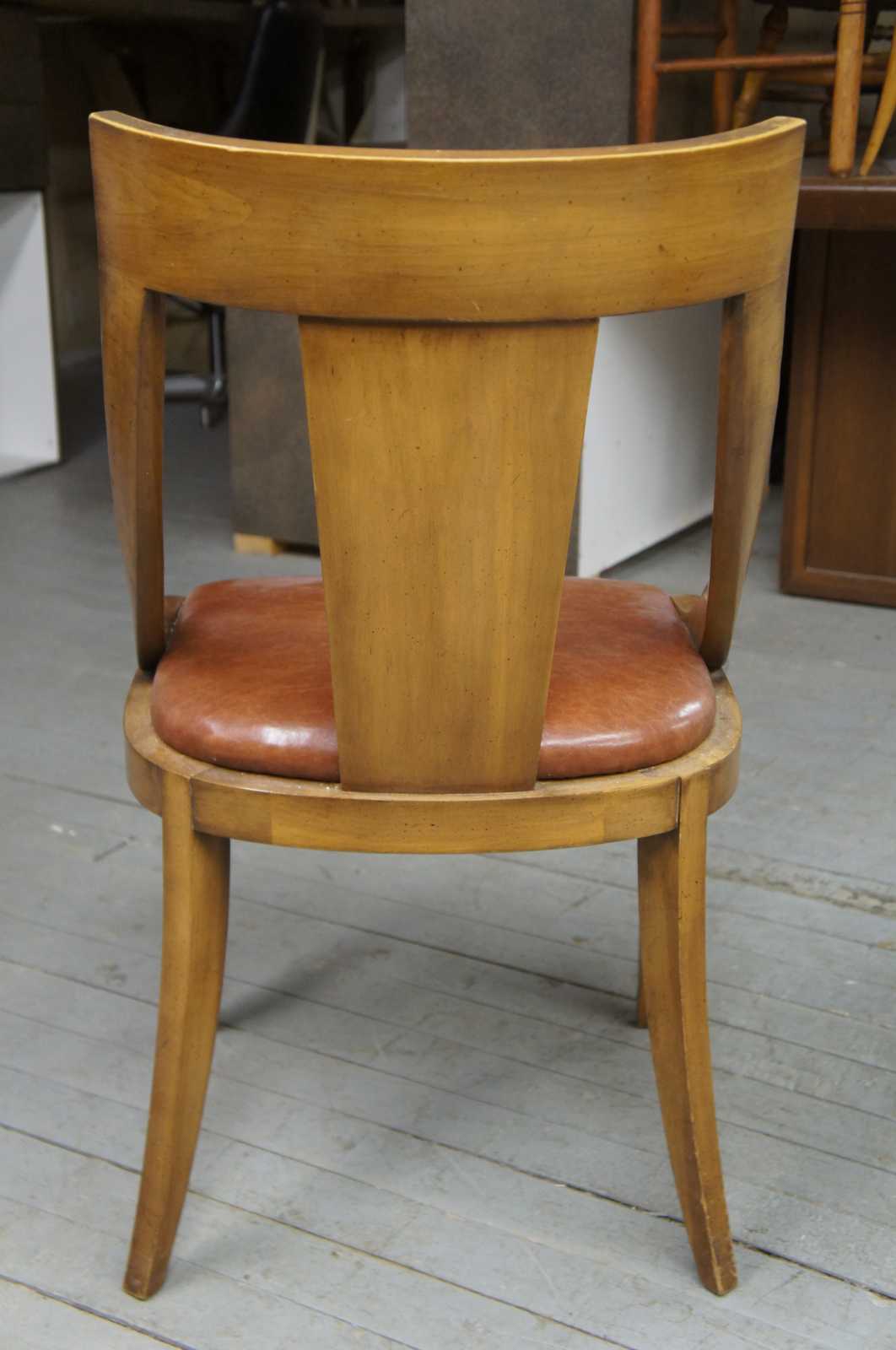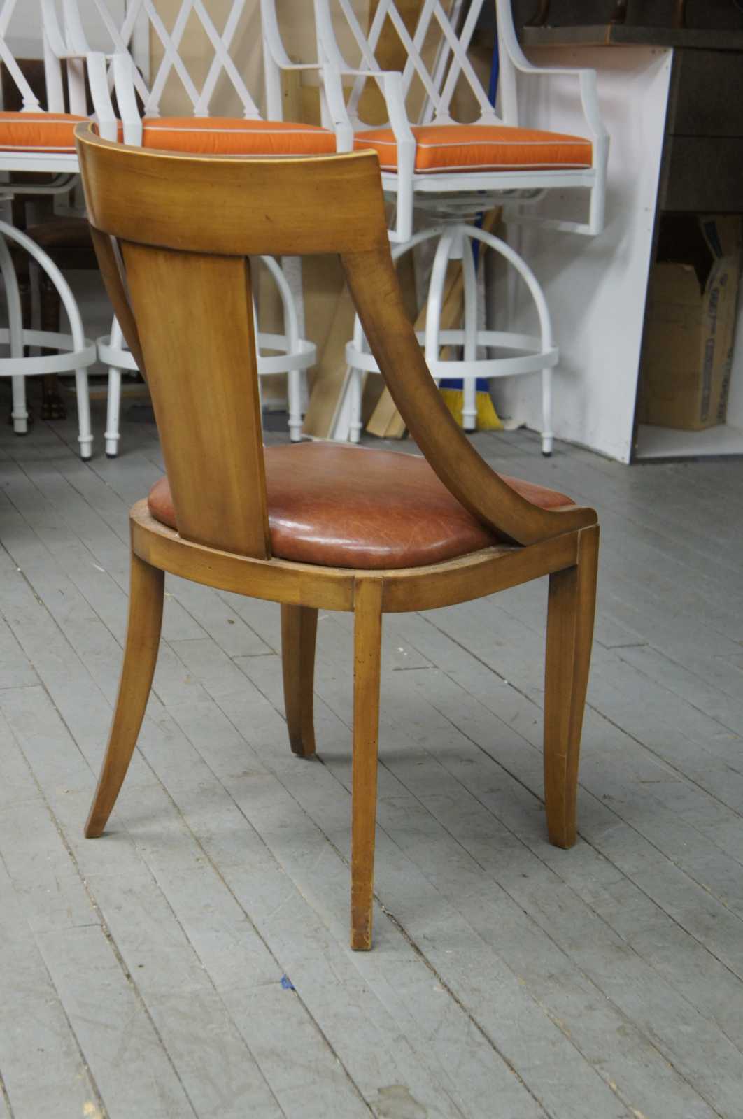 Italian Provincial dining chairs by Union National of Jamestown New York, circa 1950s. Made from fruitwood in French Empire form with parma finish. Features a leather seat, tapered from legs and saber feet.