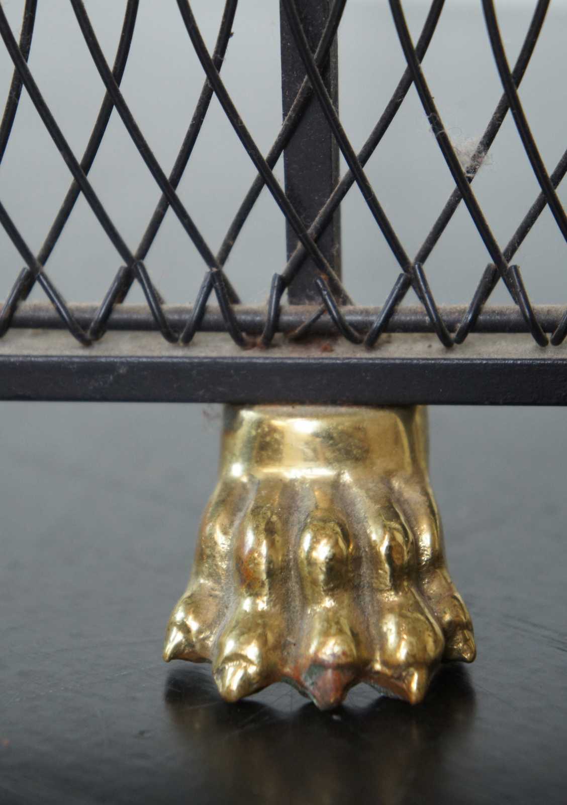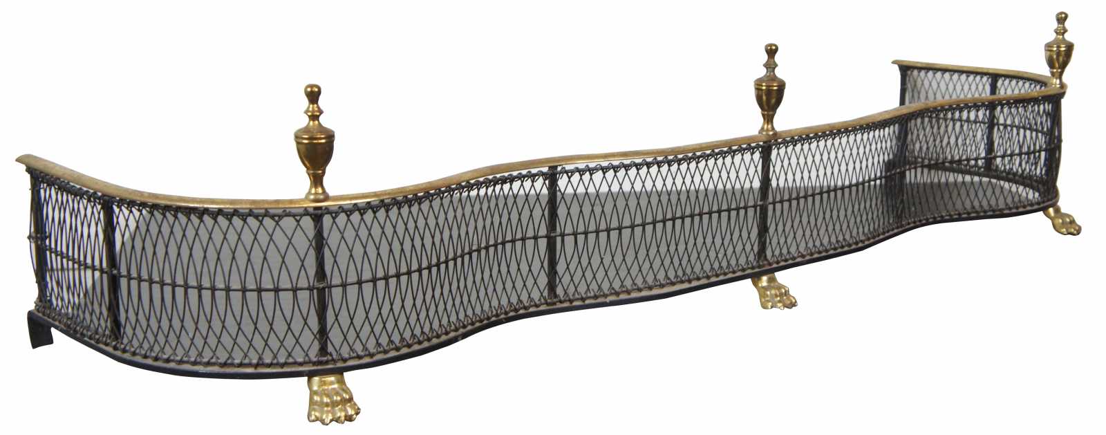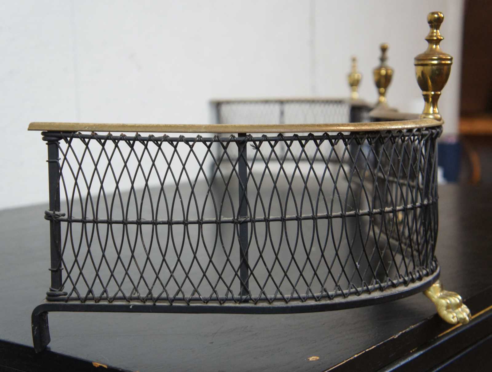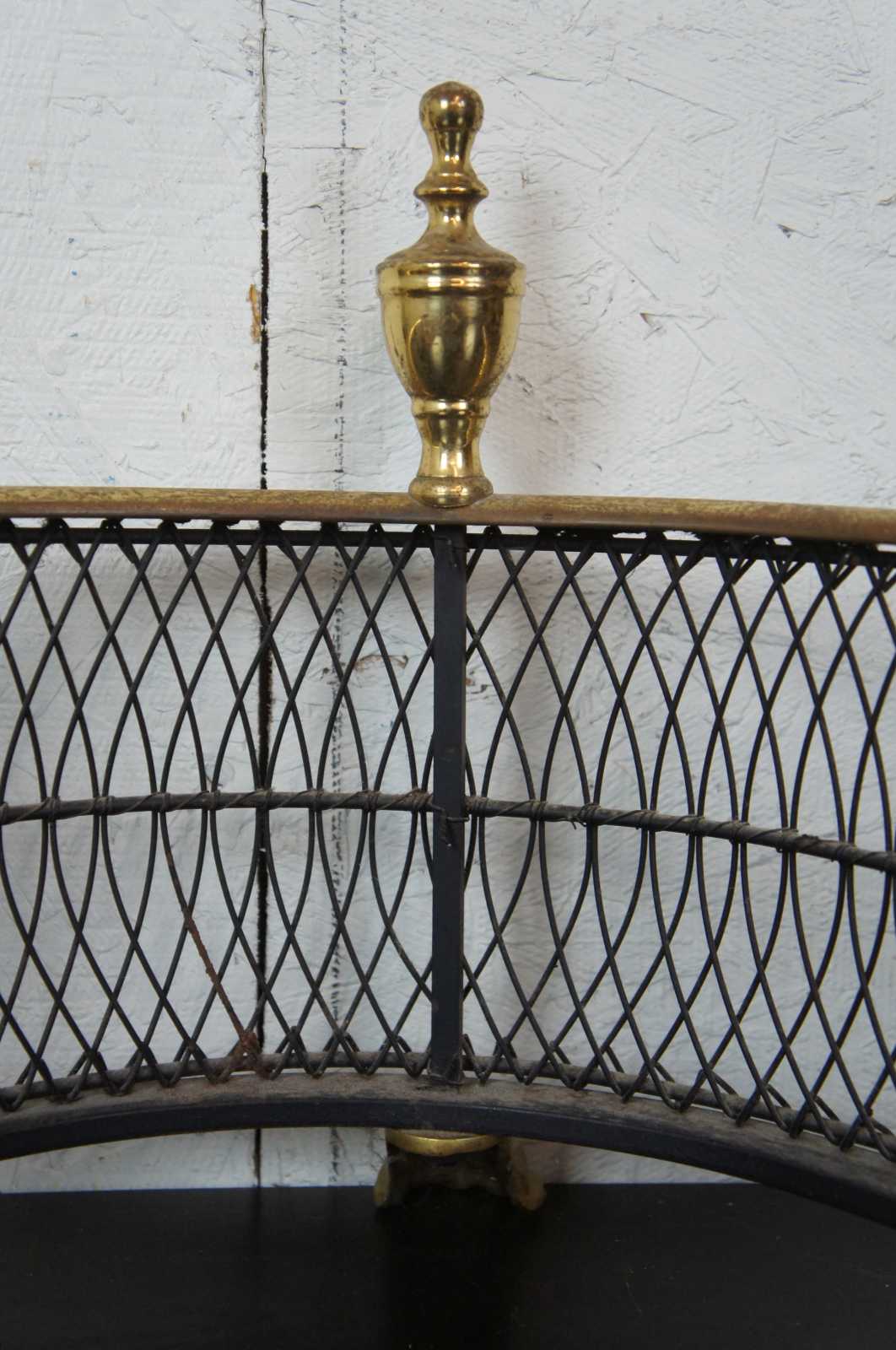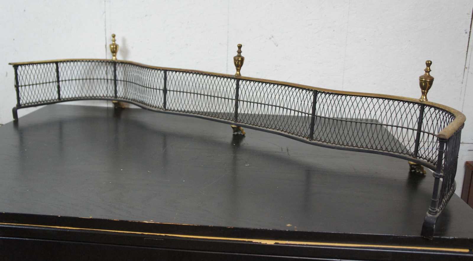 Vintage brass and iron wire fireplace fender with a curved serpentine line, federal style finials, and claw feet.