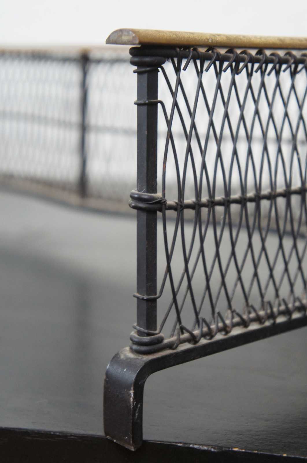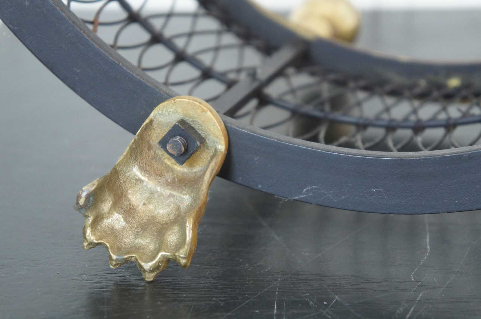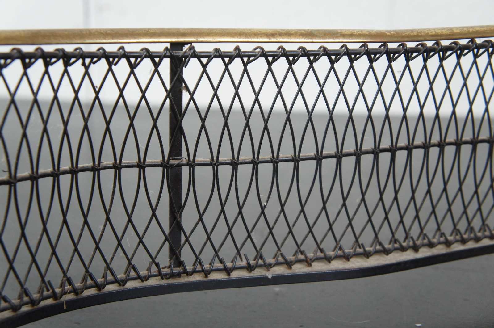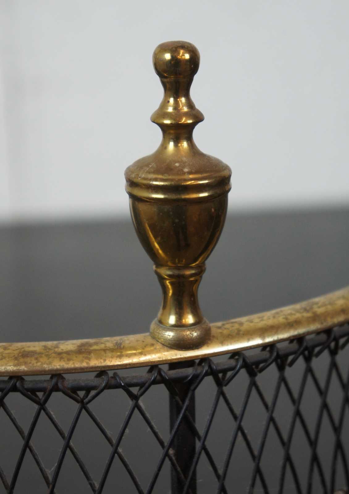 Vintage brass and iron wire fireplace fender with a curved serpentine line, federal style finials, and claw feet.