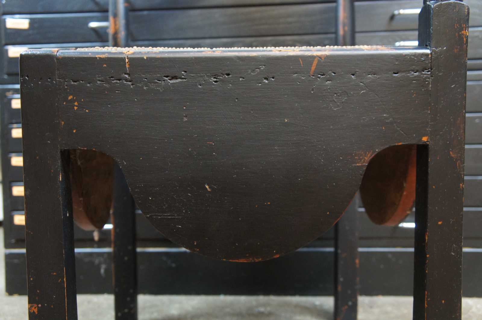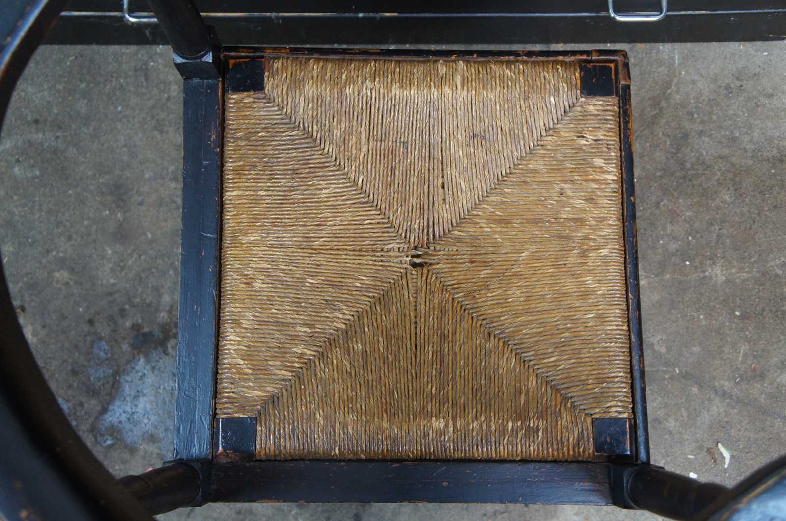 Antique Early American corner chair. Features rush seat and a curved crest with molding, finished in black with naturally distressed finish.