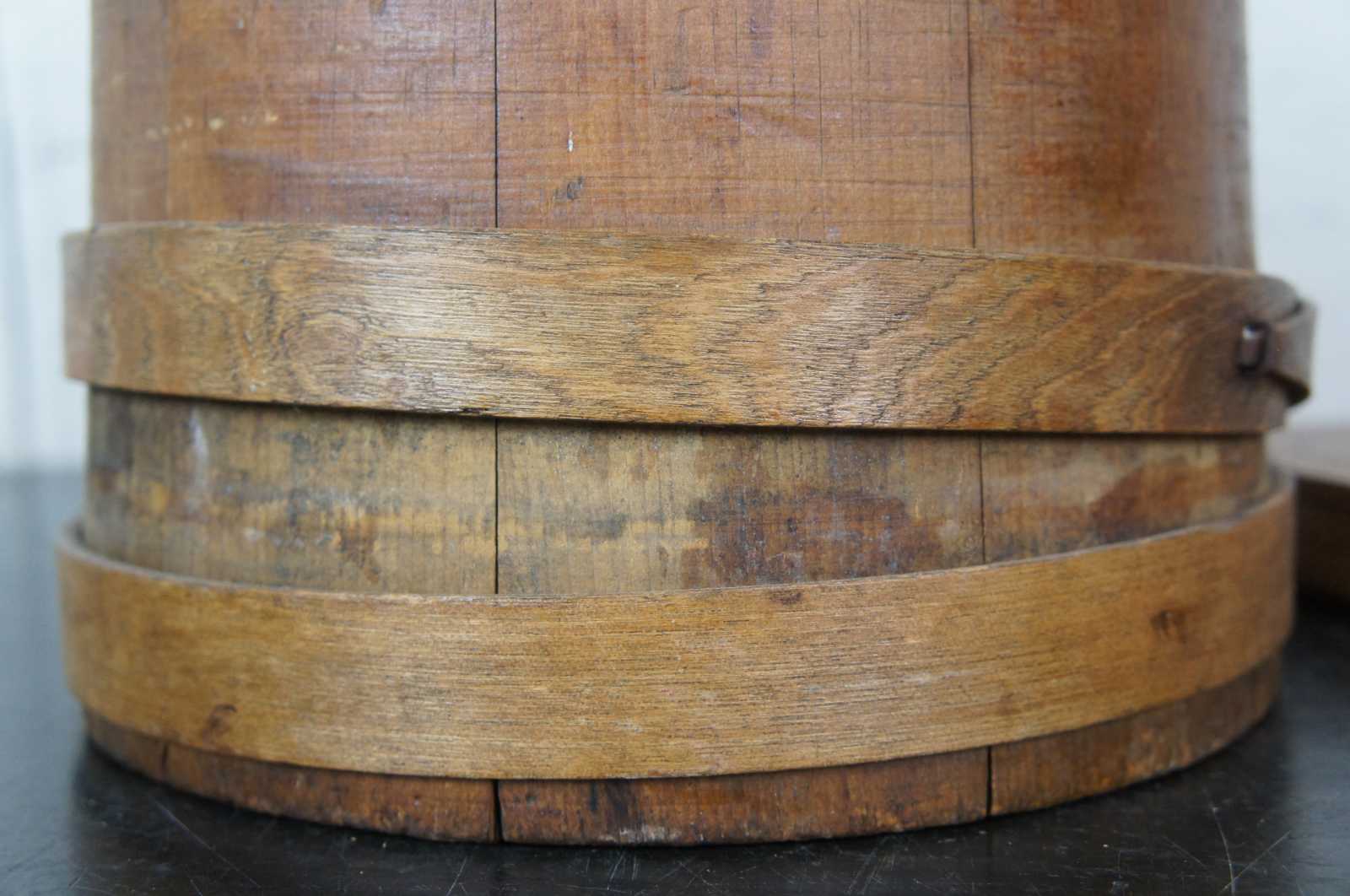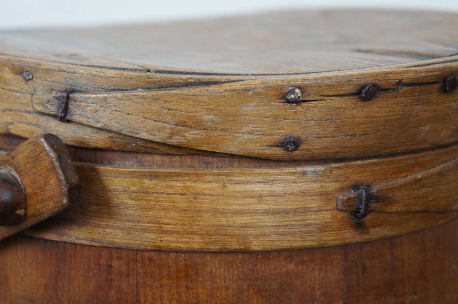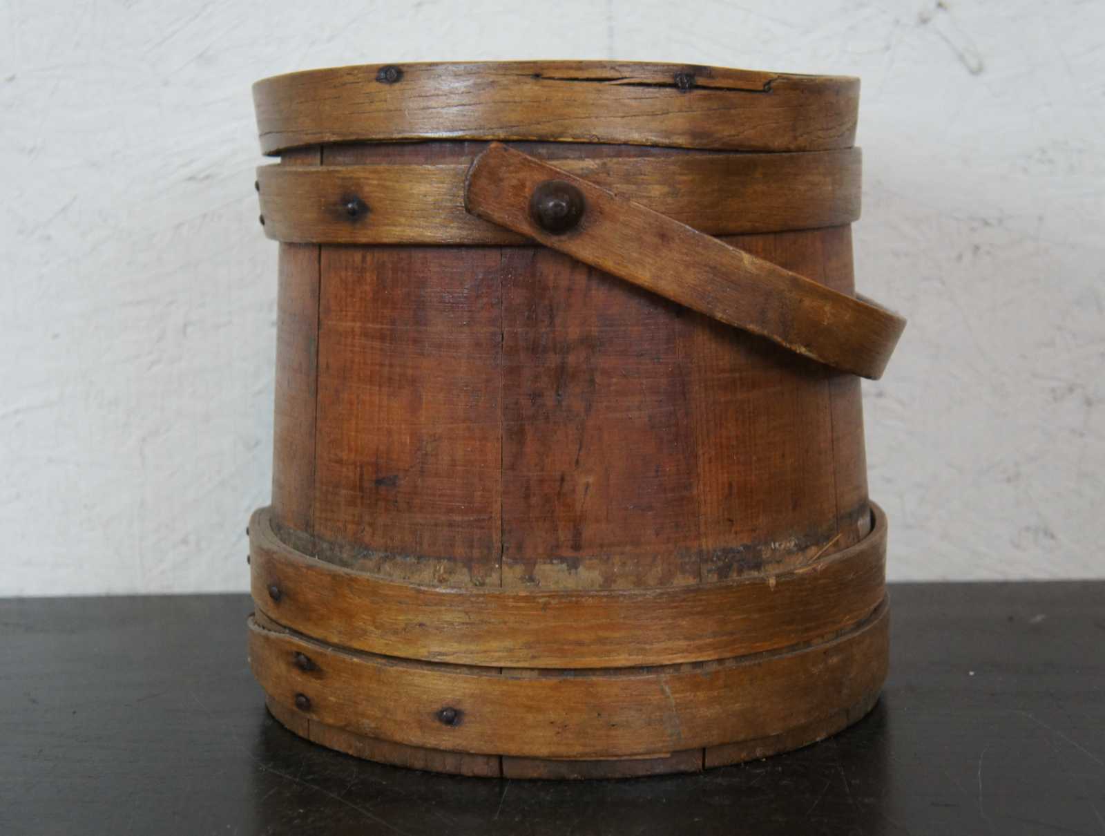 Antique wooden sugar bucket or firkin with rotating handle and lid.