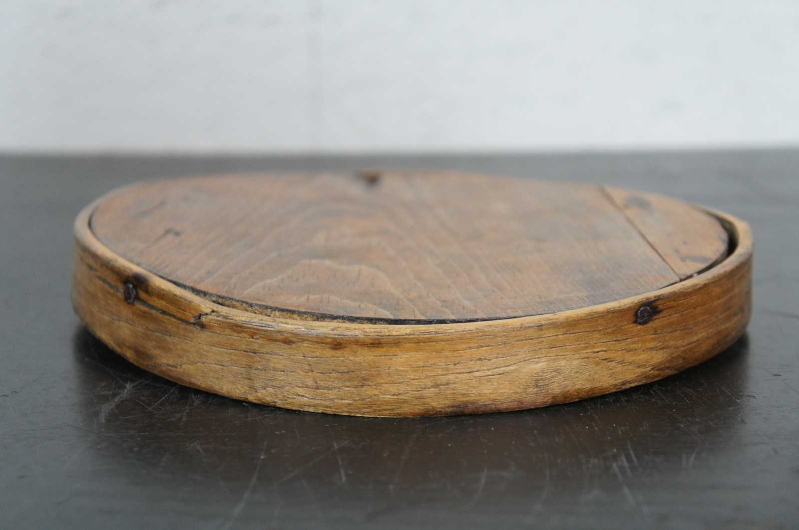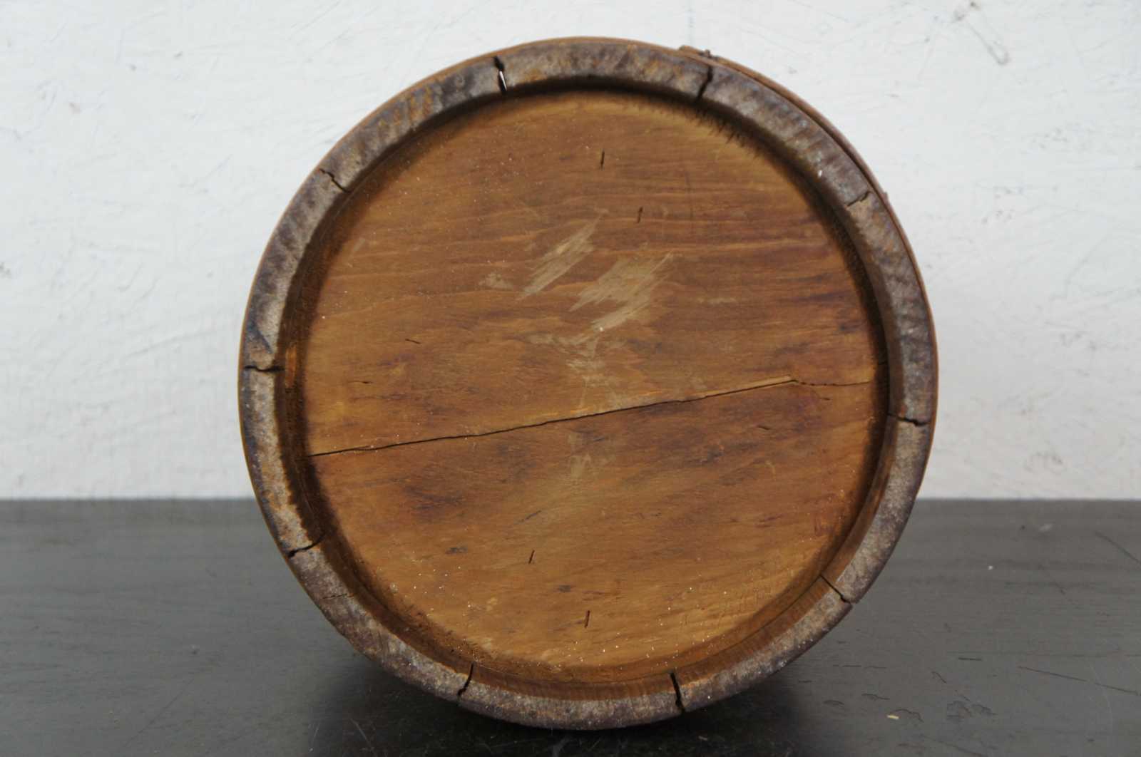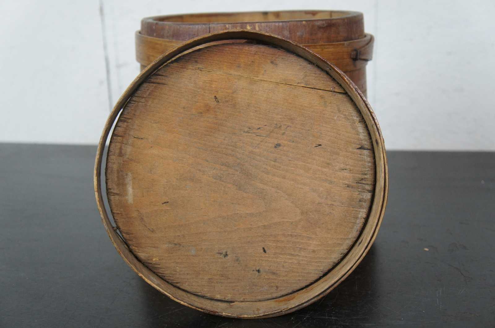 Antique wooden sugar bucket or firkin with rotating handle and lid.