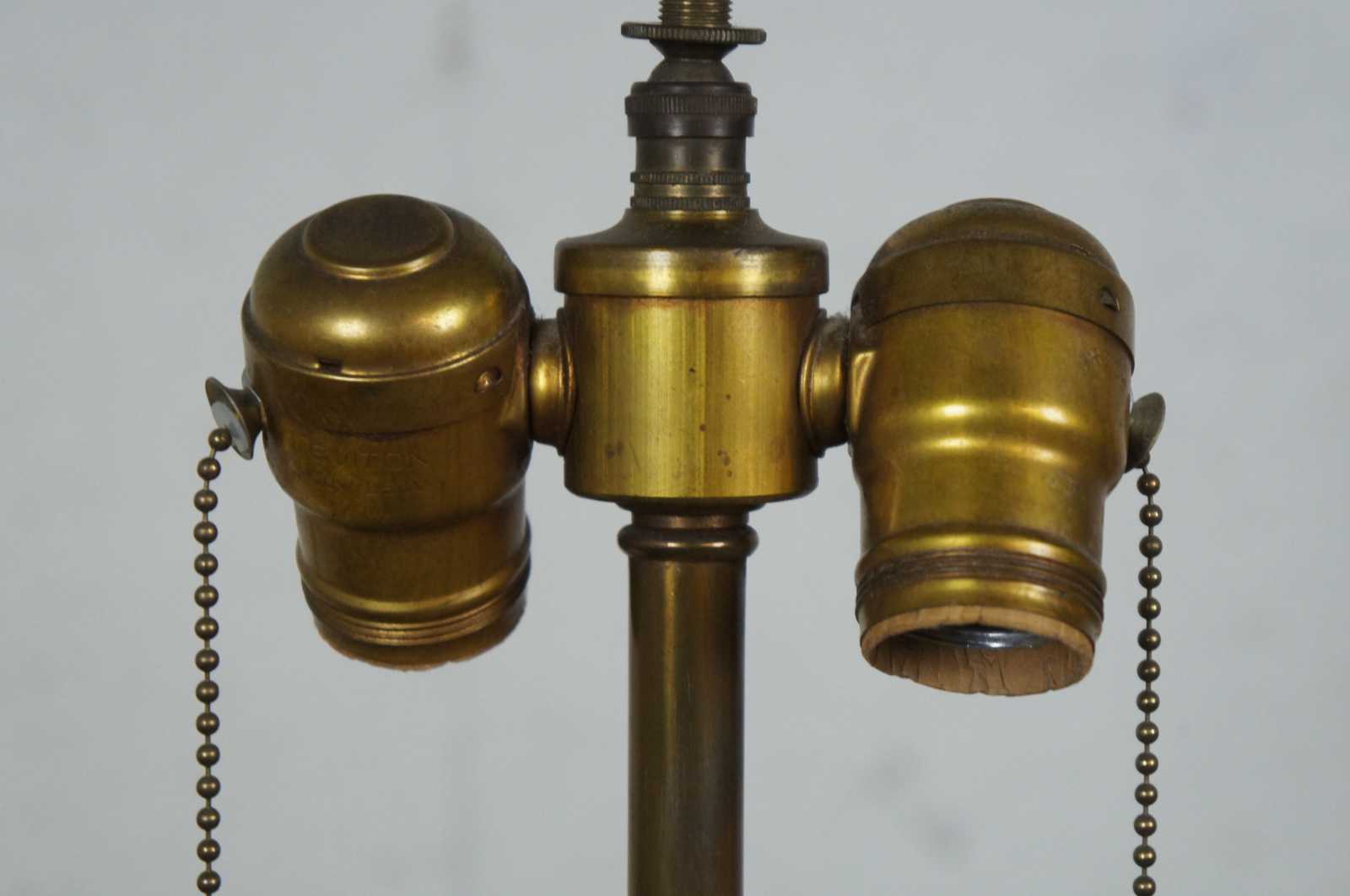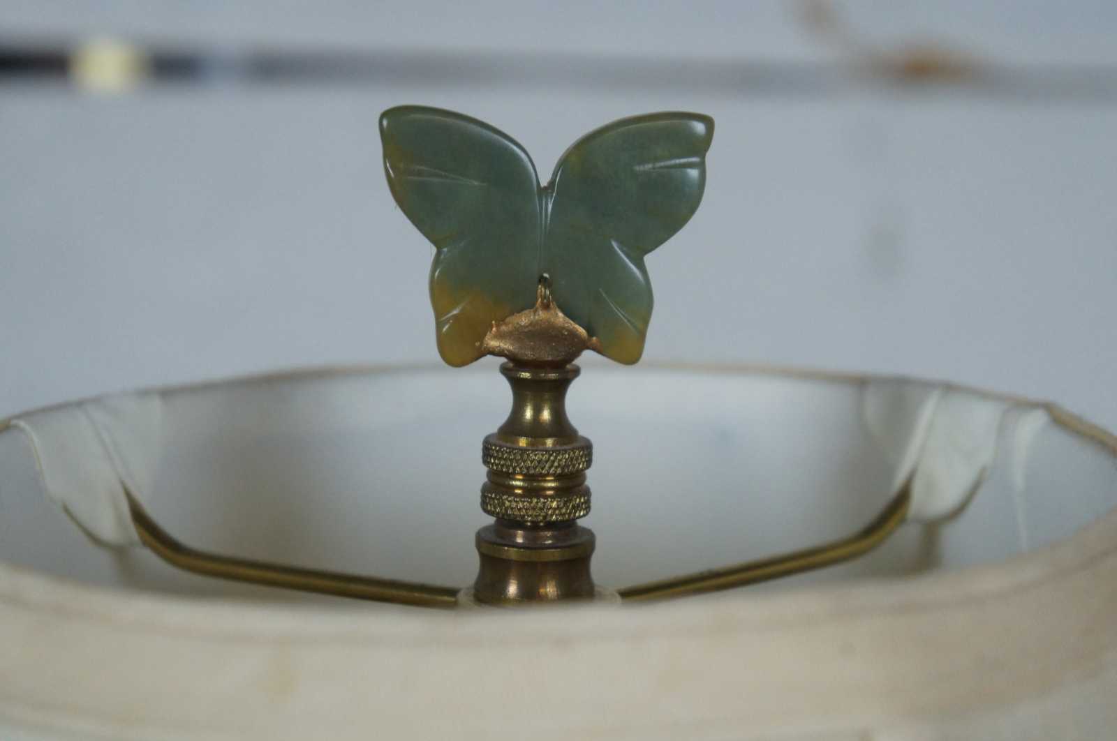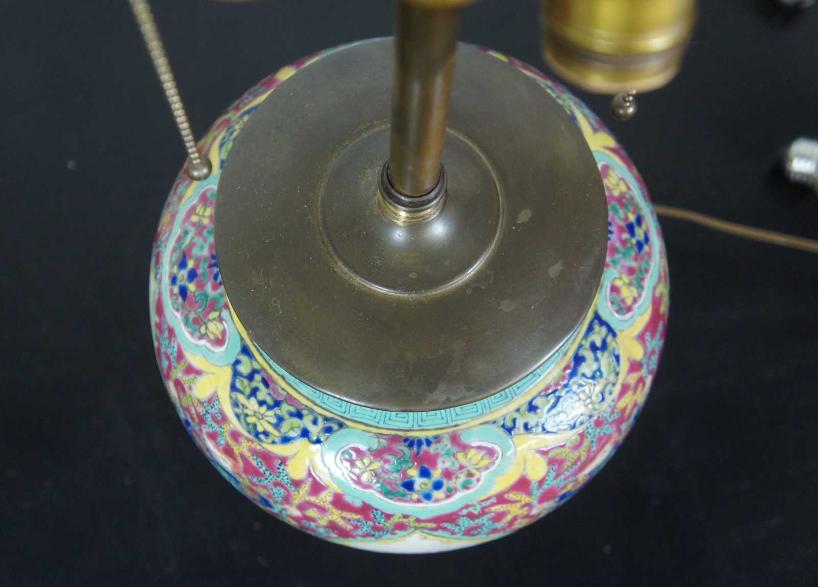 Vintage footed bronze and porcelain ginger jar table lamp featuring enameled figures with tongues of fire alternating with a dancing figure with the head of a chicken or bird. Features a jade butterfly finial and greek key boarder.